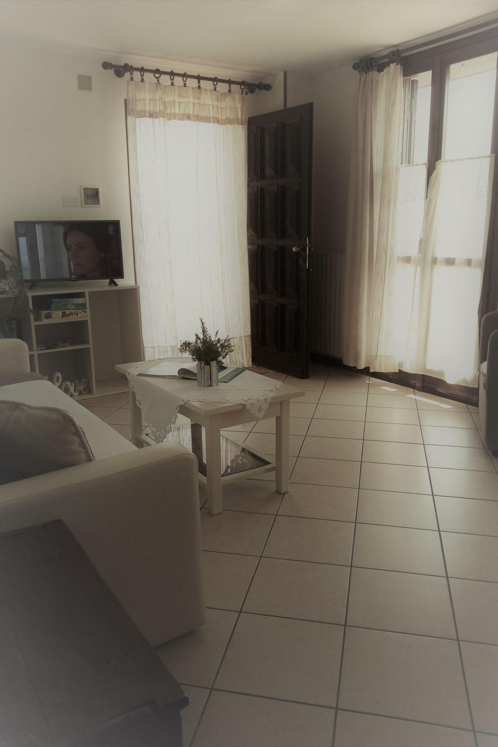 Outside there is a terrace furnished with a table, four chairs, two deck chairs and a sunshade. For this accommodation located on the ground floor it is obligatory for other people in the house to pass through.