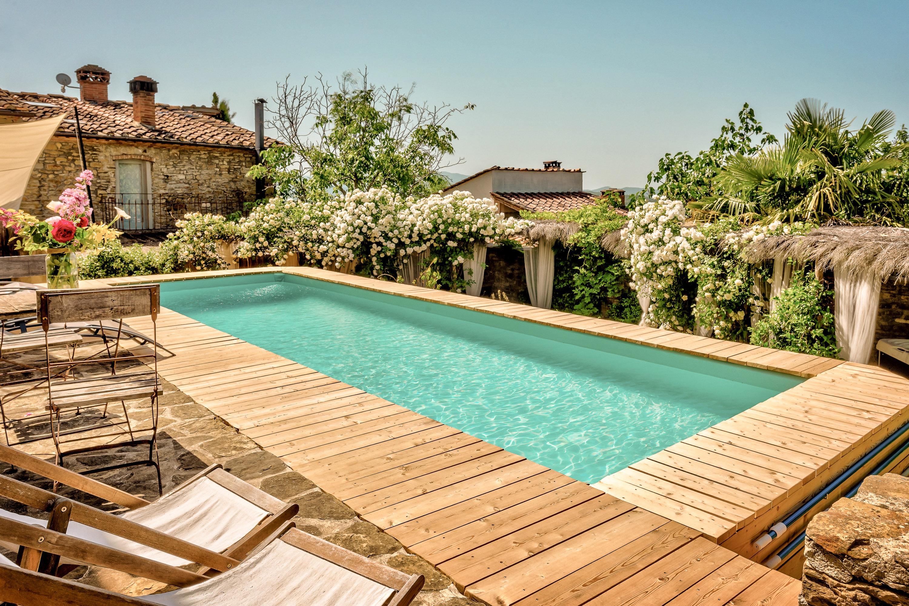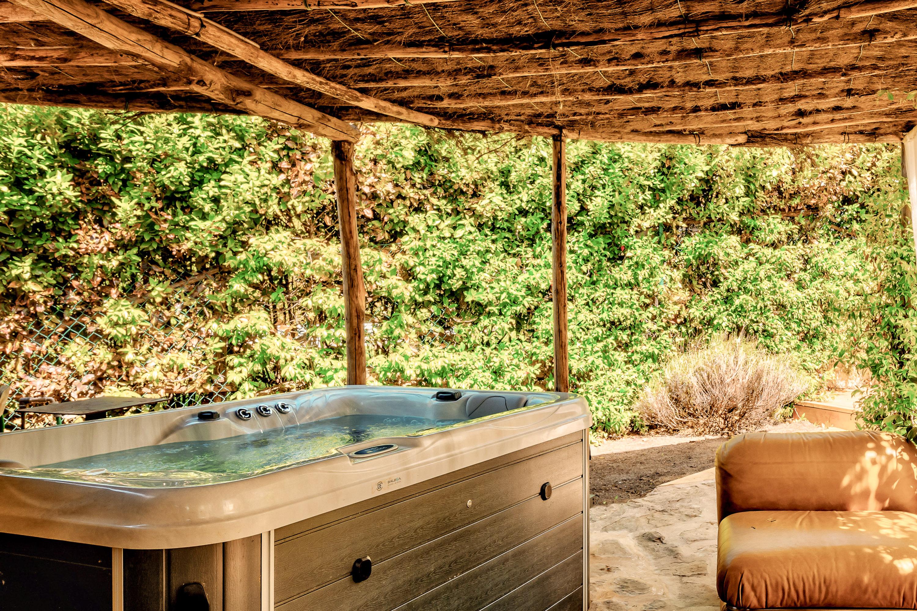 Der sehr privat gestaltete Garten hinter dem Haus verfügt über eine überdachte Außenküche mit Champagner-Bar und Sitzbereich, eine Veranda mit Lounge, einen Whirlpool und einen Pool mit den Maßen 9x3 Meter und 1,4 Meter Tiefe. Zahlreiche Sitz- und Liegeflächen stehen Ihnen hier zur Verfügung, sodass Ihre Privatsphäre garantiert ist. Ein privater Parkplatz ist vor dem Haus vorhanden.