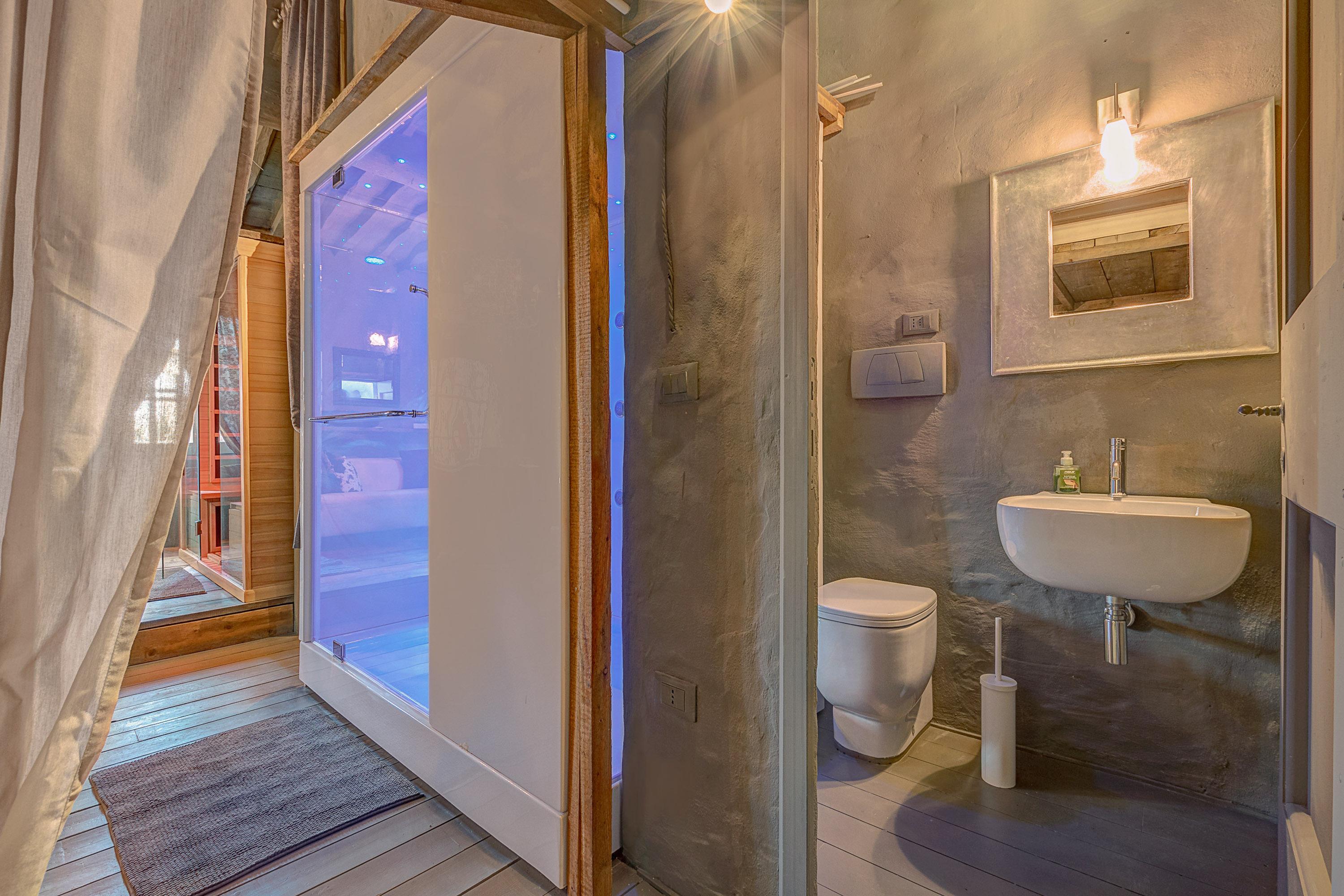 Im oberen Bereich des Hauses befindet sich die Schlafbereiche und das Benessere- ein exklusives Spa mit türkischem Bad, Infrarotsauna mit Farb- und Ozontherapie sowie eine Lichttherapielampe für Tageslicht mit Sonnensimulation von 10.000 Lux. Eine professionelle Massageliege sorgt für zusätzliche Entspannung. Der Fitnessbereich ist ausgestattet mit einem Laufband von I-fit System, um virtuell auf der ganzen Welt zu laufen, einer multifunktionalen Handelbank für mehr als zehn verschiedene Übungen, einer Reihe von Betten für Yoga-Übungen und vielem mehr.