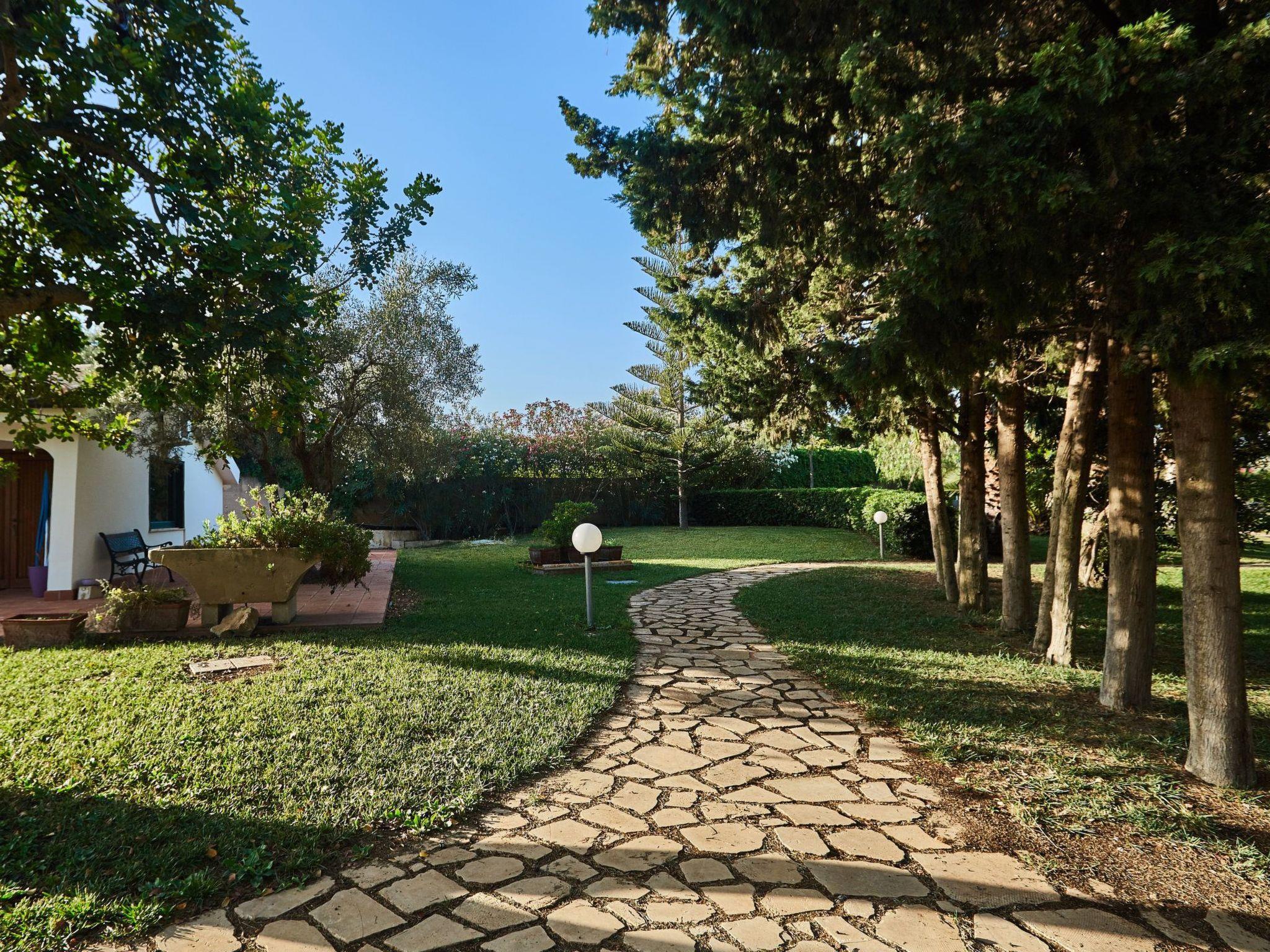 Leaving the room where there is the large table, there is a patio of about 50 square metres furnished with polirattan lounges and a table for 20 people where you can dine in the evening enjoying the coolness of the park. As soon as you pass through the entrance gate you have the feeling that you have arrived in a wonderful place, at guests' disposal there is a 10,000 square metre lawn, decorated and embellished with palm trees and centuries-old carob trees as well as many other species of Mediterranean plants. The park is criss-crossed with lanes of local white stone so that it already looks like a painting. Then we find a gazebo with a very large wooden table for sitting at the barbecue and in the immediate vicinity bordering on another area where there is a nice table tennis table, and further on, to the delight of the little ones, there is a small recreation area. Continuing the walk, we come to the centrepiece of the park, a large inregular swimming pool and all around sun loungers with sunshades and 2 round wrought-iron tables with chairs so that you can spend days in absolute relaxation. About 15 metres away is a semi-covered terrace with sails and furnished with polirattan loungers, all adjacent to the kitchen.