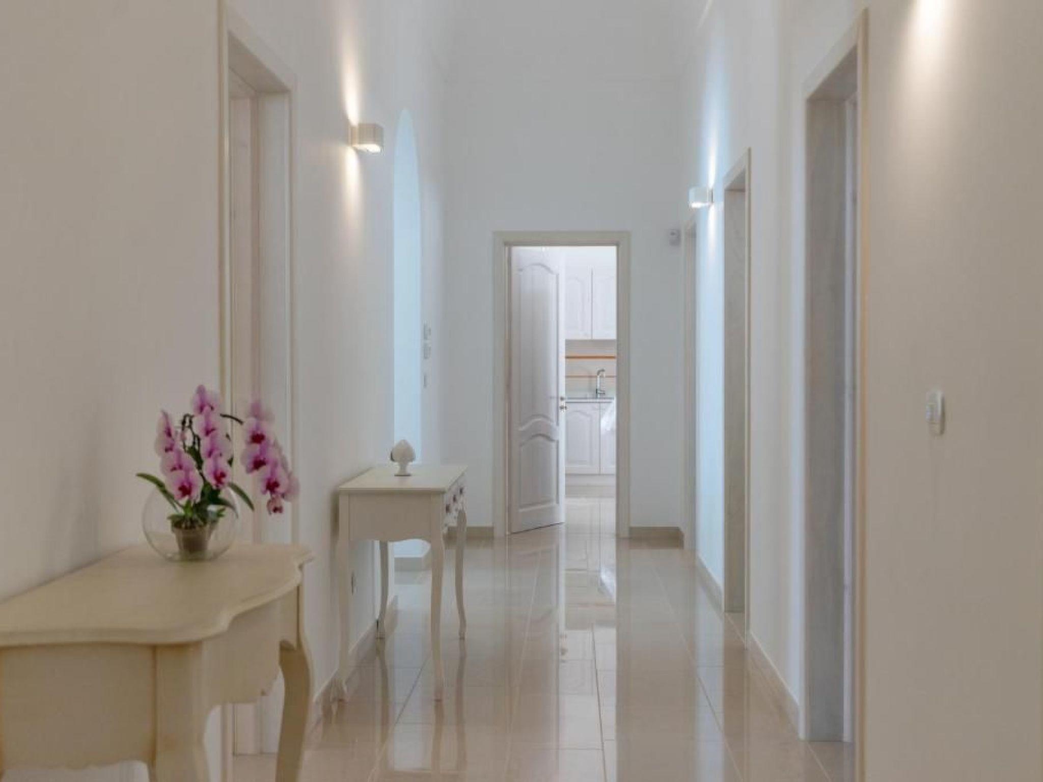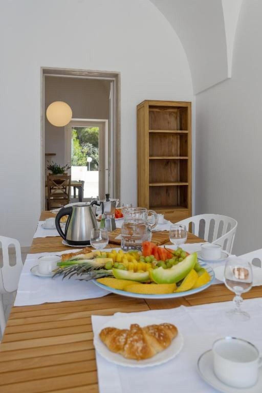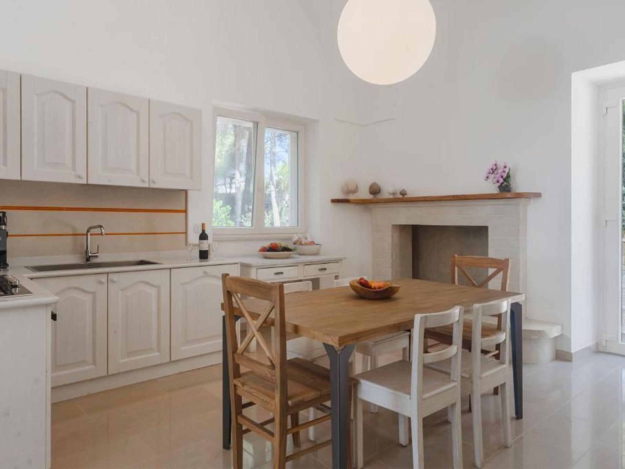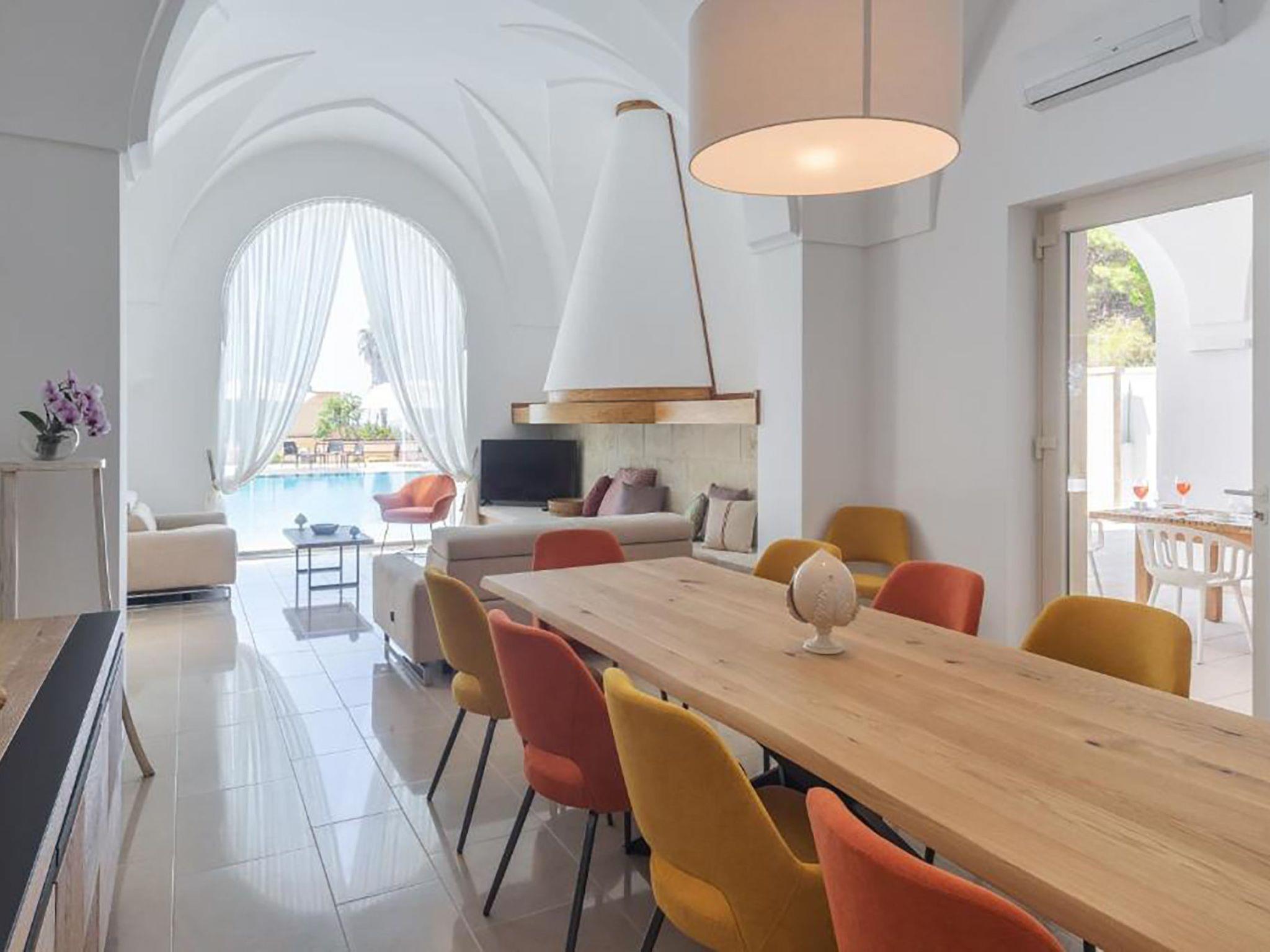 Inside, the villa offers a large and distinctive living room with starry vaulted ceilings and views of the pool, a traditional Salento kitchen enhanced by a charming fireplace, attractive during the summer and functional in the winter months. The sleeping area includes three spacious bedrooms, each with star vaulted ceilings, panoramic windows, a double bed and a sofa bed. The property also includes three large bathrooms and, to complete the interior spaces, a useful laundry area with sink and washing machine.