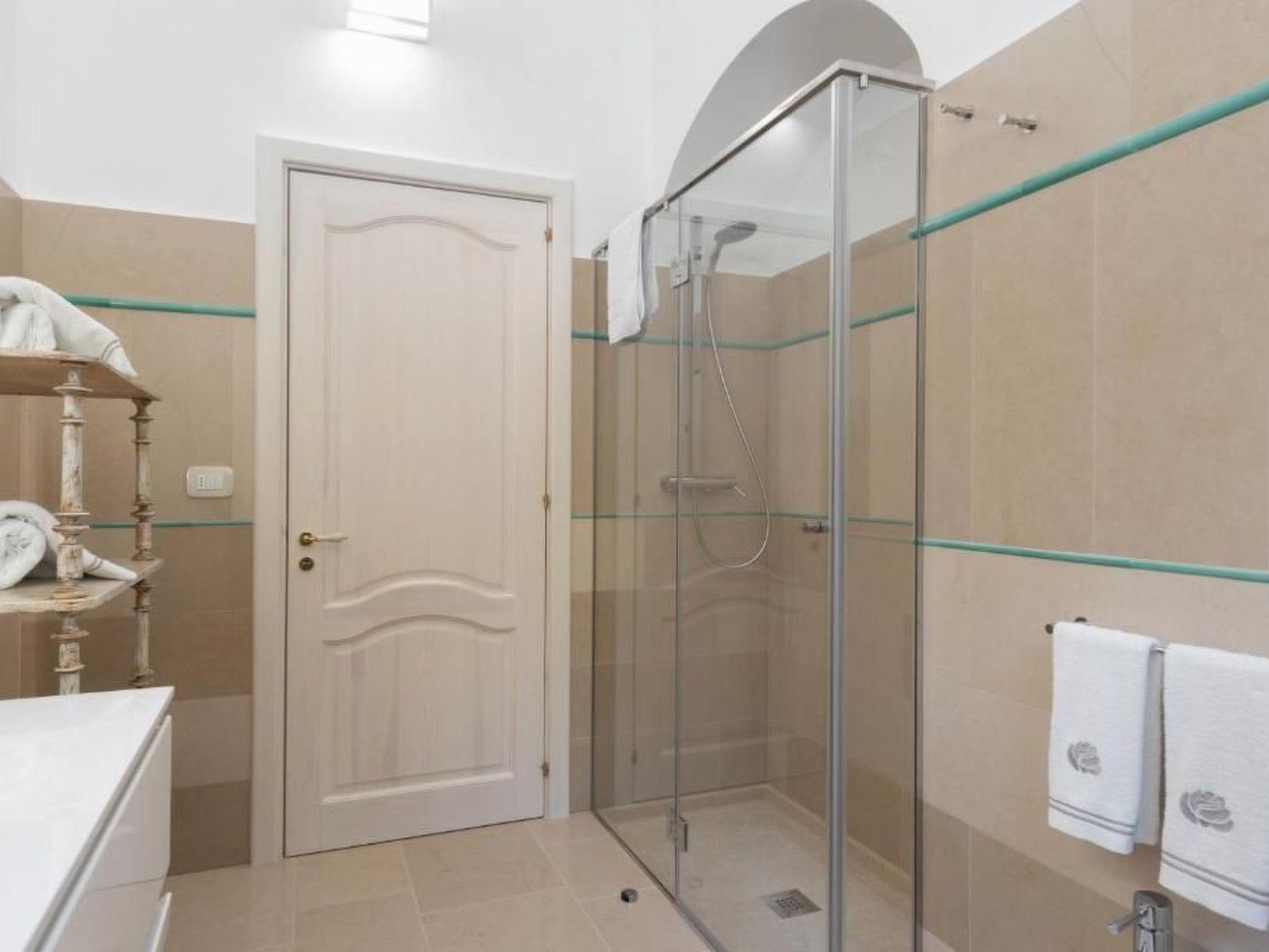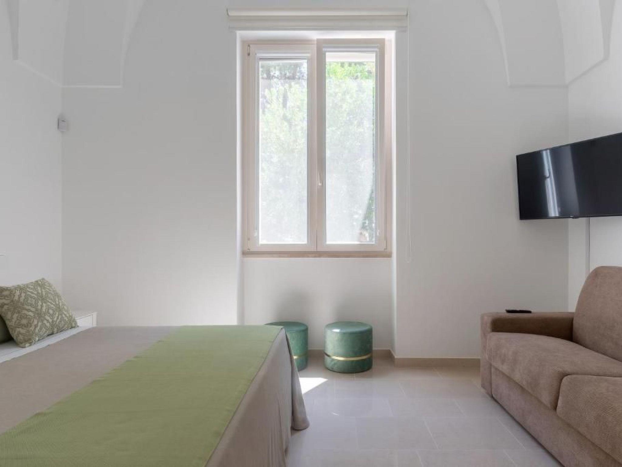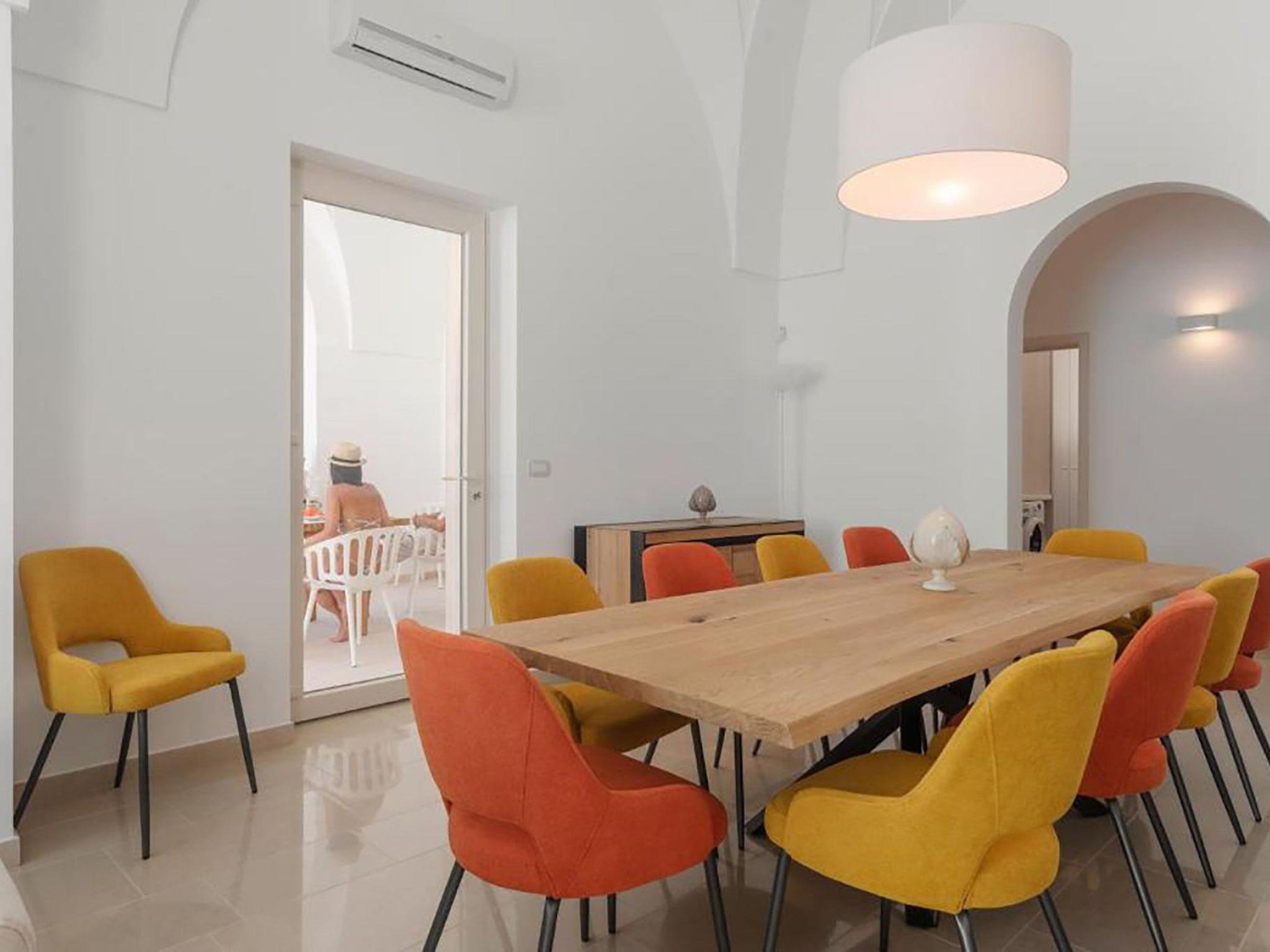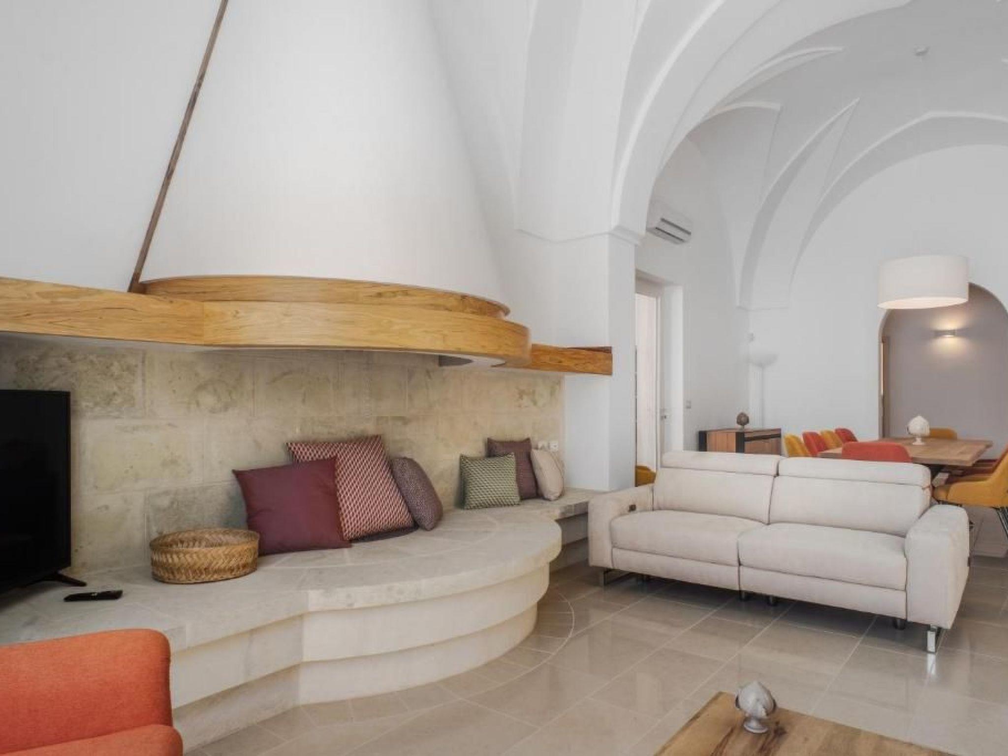 Inside, the villa offers a large and distinctive living room with starry vaulted ceilings and views of the pool, a traditional Salento kitchen enhanced by a charming fireplace, attractive during the summer and functional in the winter months. The sleeping area includes three spacious bedrooms, each with star vaulted ceilings, panoramic windows, a double bed and a sofa bed. The property also includes three large bathrooms and, to complete the interior spaces, a useful laundry area with sink and washing machine.