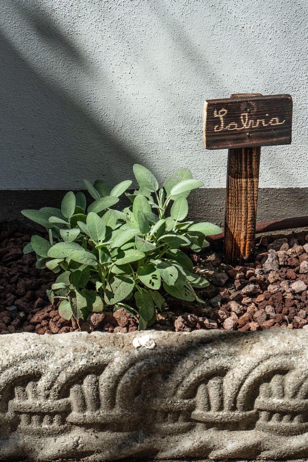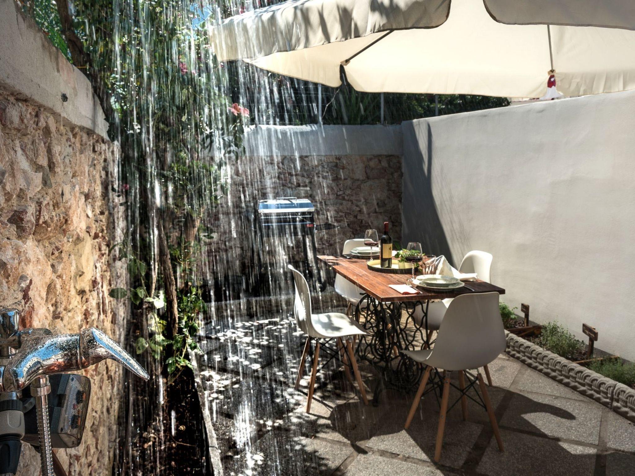 An outdoor living space, equipped for outdoor dining, enriched by Mediterranean essences, with a beautiful outdoor shower.