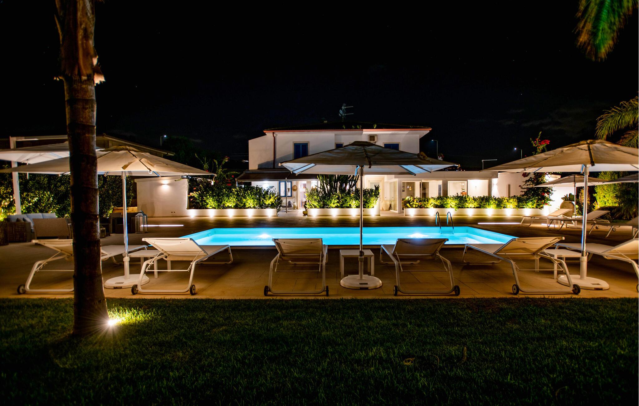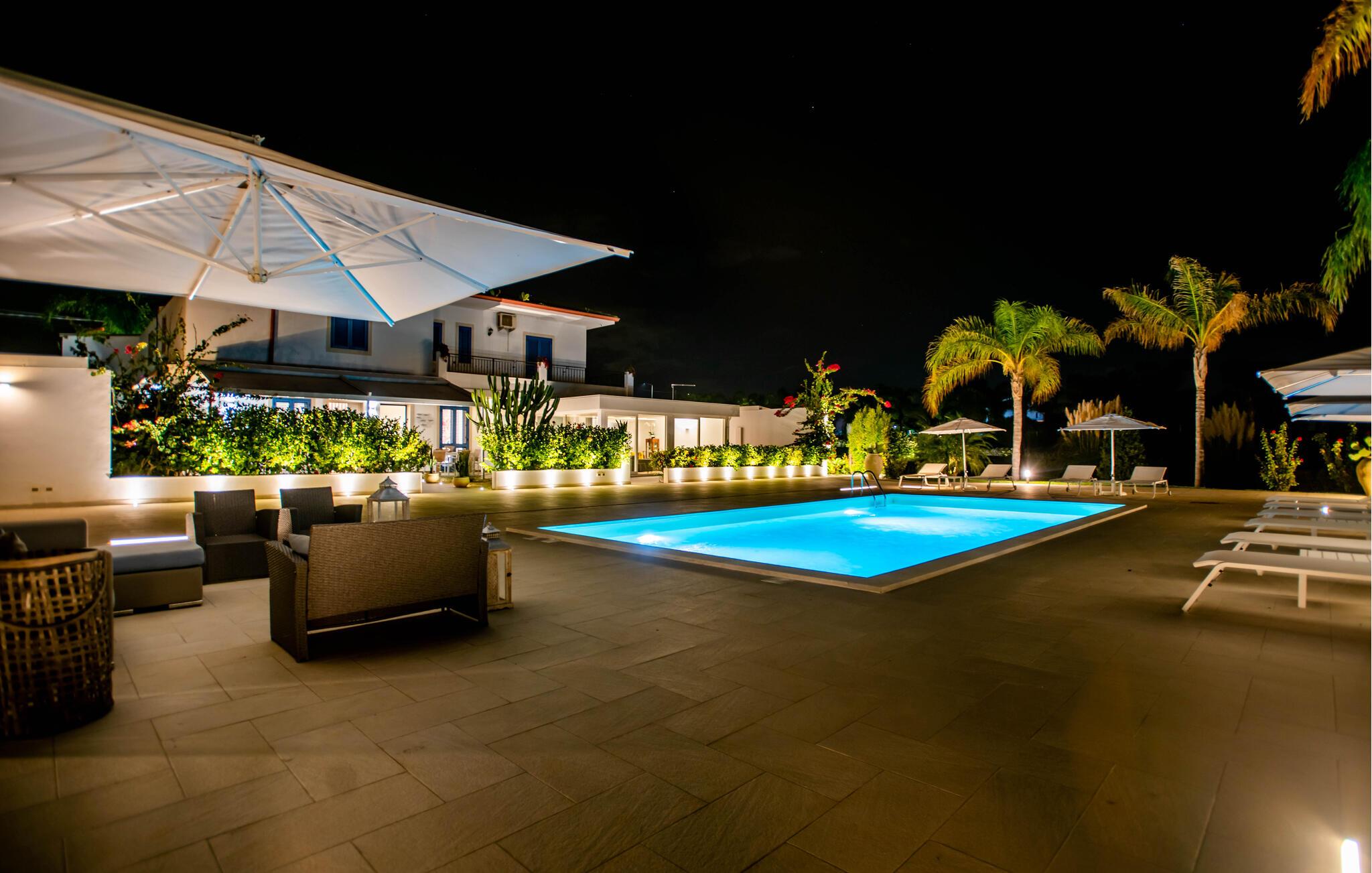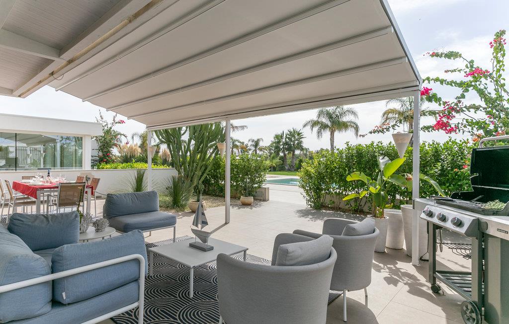 Træd ud i det rummelige udendørsområde og nyd middelhavsatmosfæren. Slap af på den overdækkede terrasse i komfortable loungemøbler eller sæt jer ved det udendørs spisebord. Brug grillen til aftener sammen og nyd varme dage ved poolen med solterrasse, liggestole og parasoller.