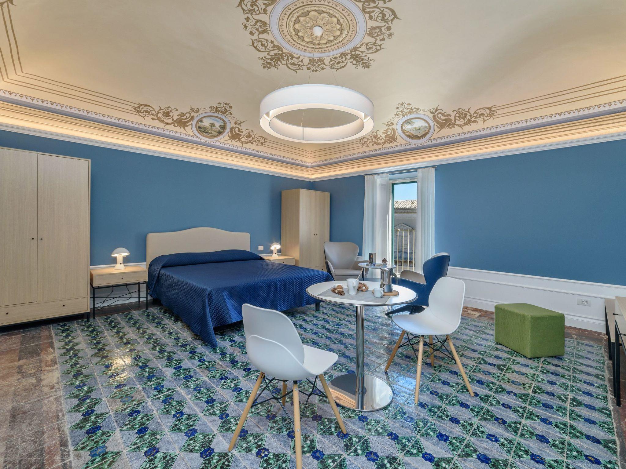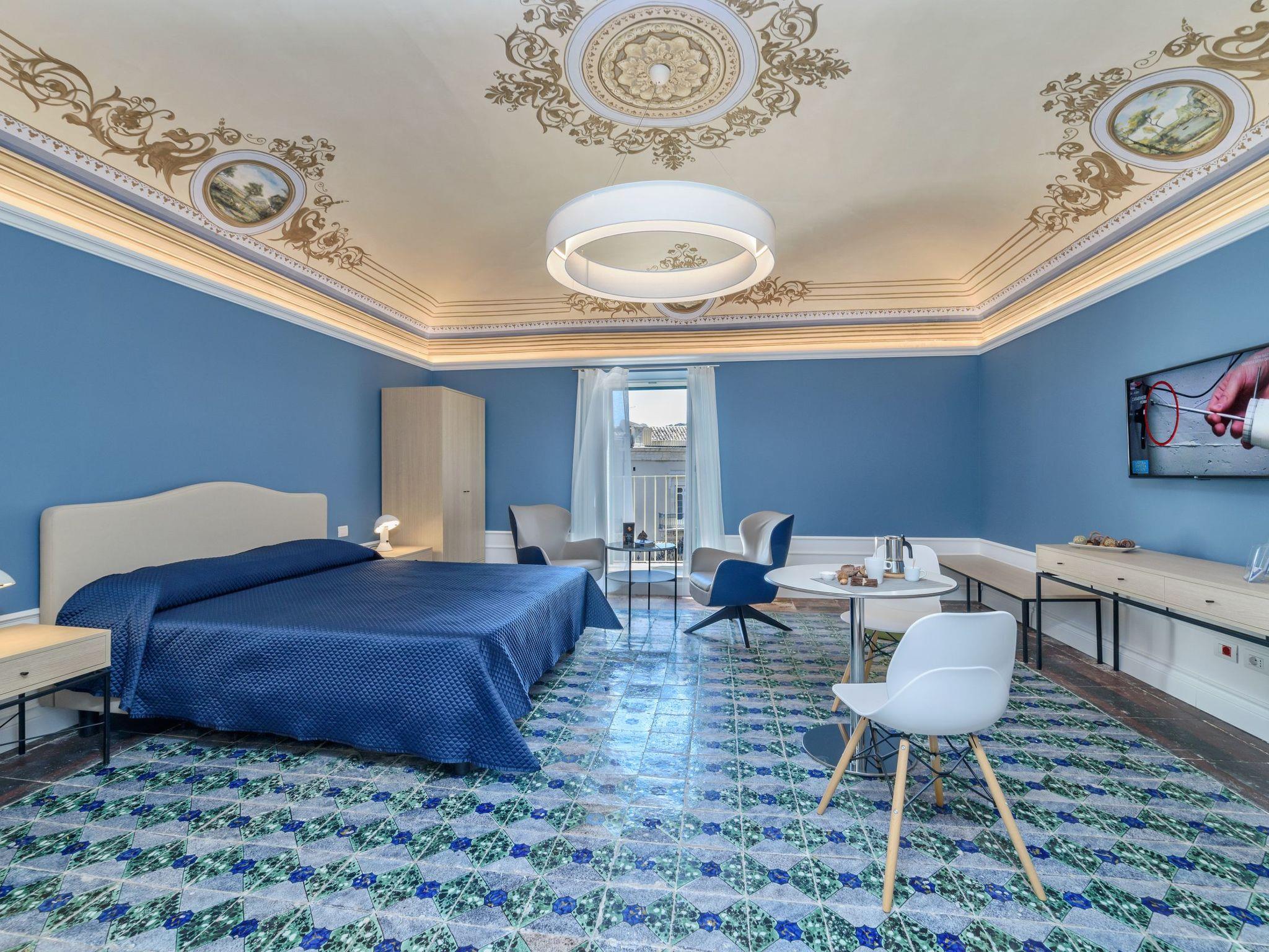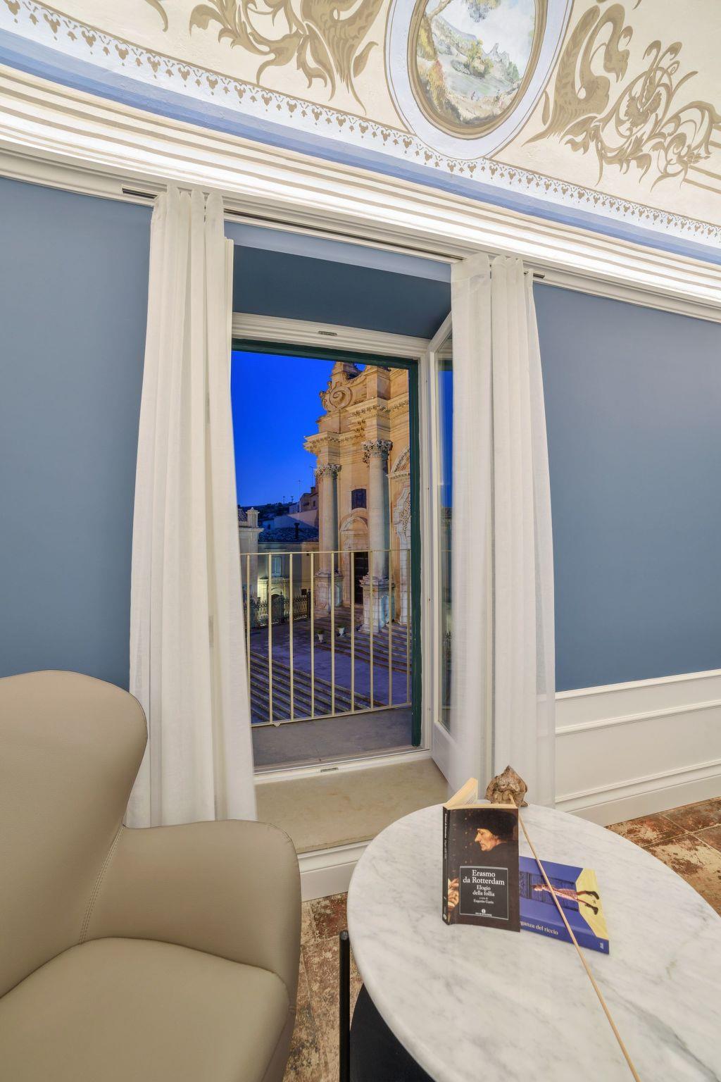 Elegant studio with balcony and great views of the Cathedral of St. George and the square. On the second floor of a stately building, it boasts fine interiors with old and modern elements. It has vaulted ceilings with frescoes, decorated floors and stuccos, and offers a chic and refined atmosphere. It consists of a large open space, bright and well-equipped with all comforts. A double bed and a relaxation area with armchairs and a beautiful view. A dining area and a kitchen with dishwasher, fridge, freezer, microwave. A bathroom with a hydromassage shower. The accommodation is equipped with TV, air conditioning, hairdryer, Wi-Fi and safe. A laundry with washing machine and dryer, to be shared with the guests of the two adjacent rooms.