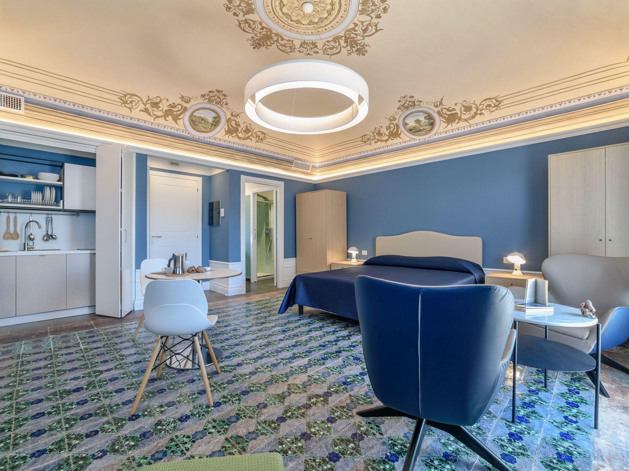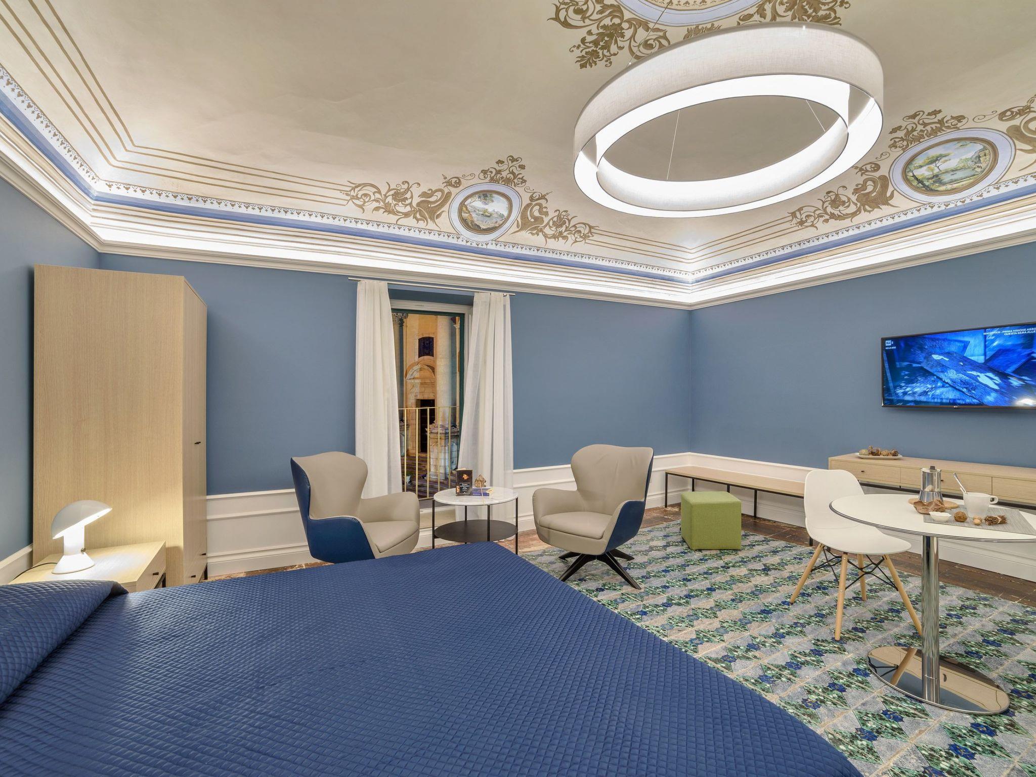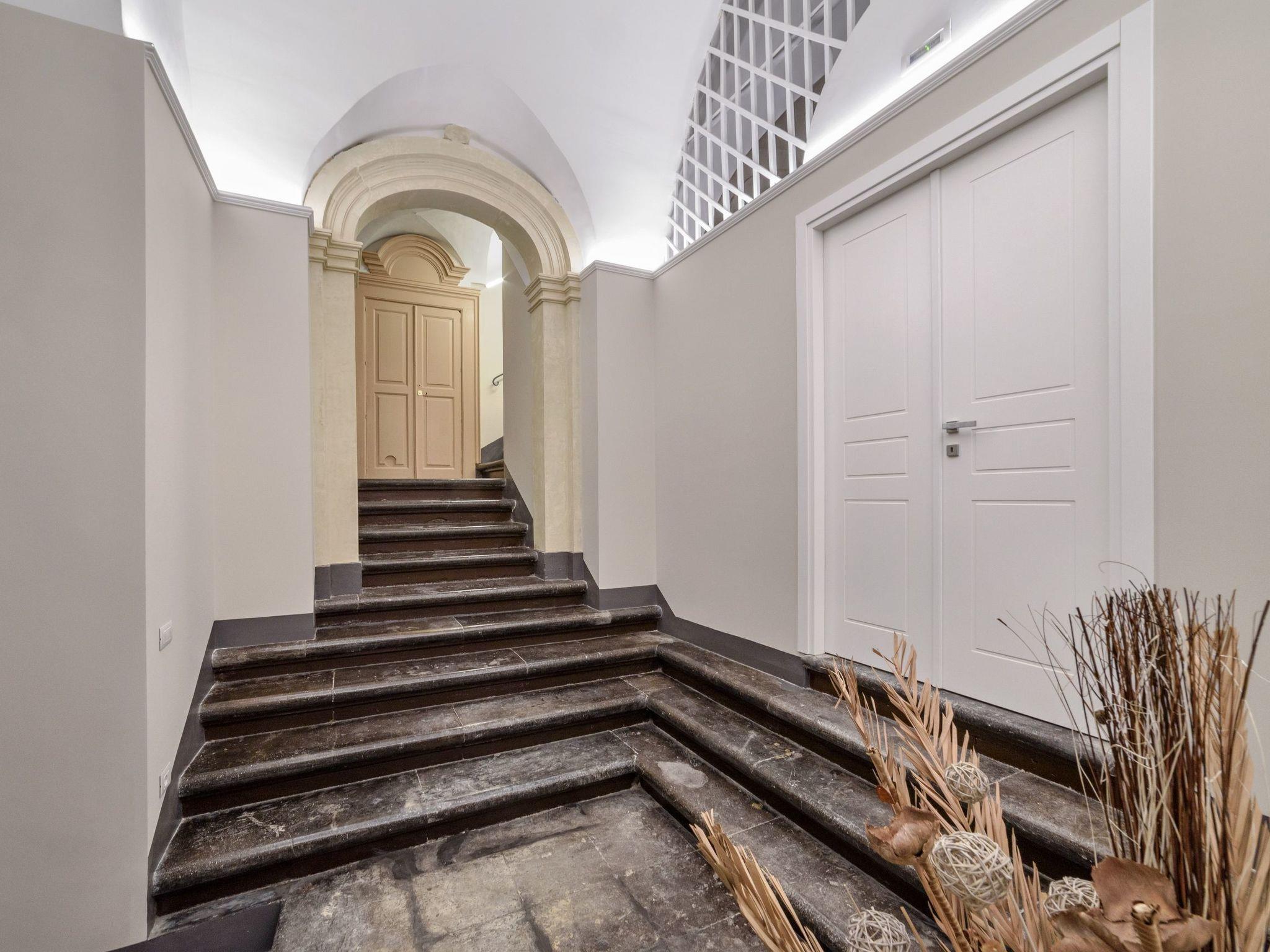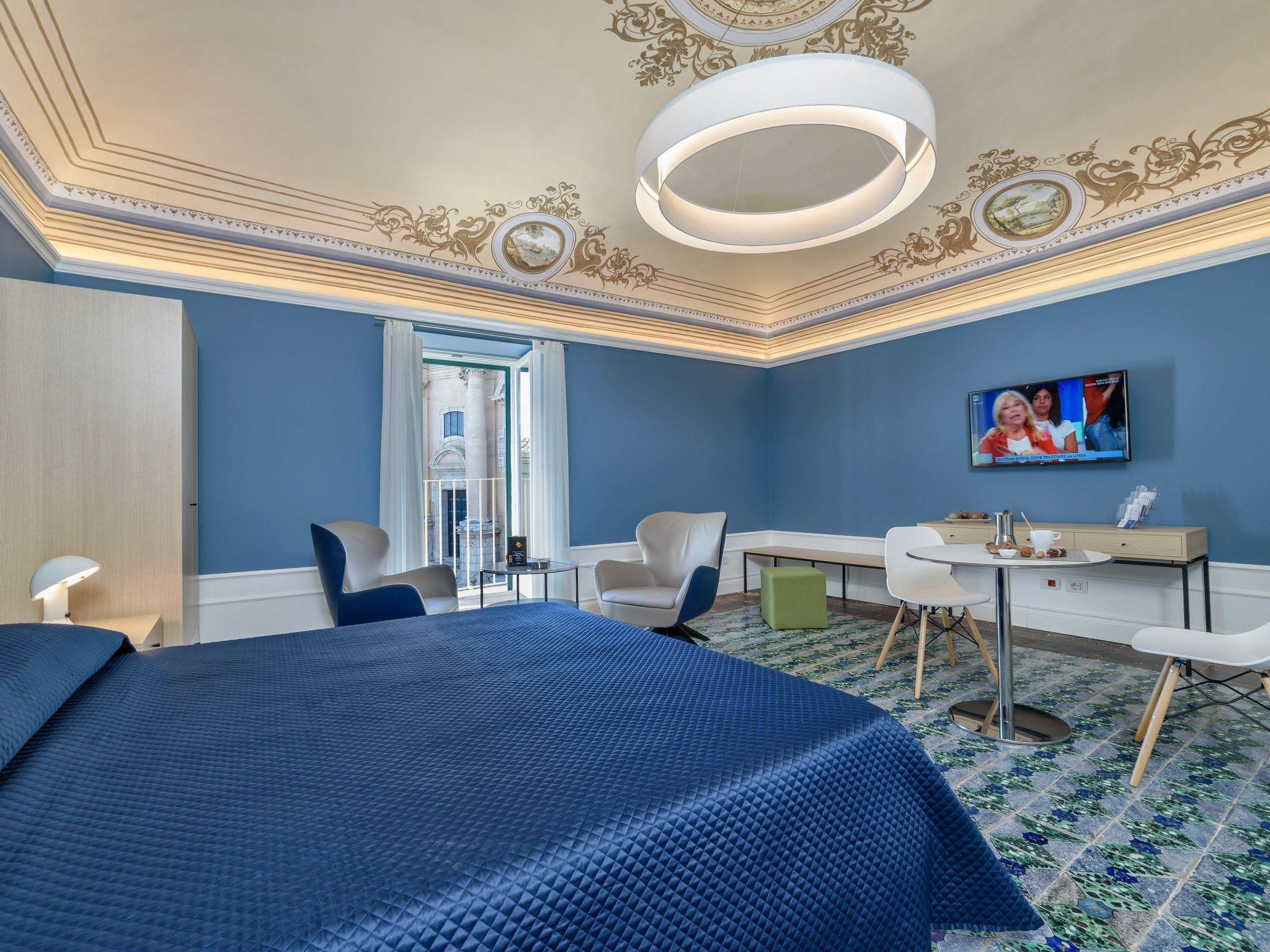 Elegant studio with balcony and great views of the Cathedral of St. George and the square. On the second floor of a stately building, it boasts fine interiors with old and modern elements. It has vaulted ceilings with frescoes, decorated floors and stuccos, and offers a chic and refined atmosphere. It consists of a large open space, bright and well-equipped with all comforts. A double bed and a relaxation area with armchairs and a beautiful view. A dining area and a kitchen with dishwasher, fridge, freezer, microwave. A bathroom with a hydromassage shower. The accommodation is equipped with TV, air conditioning, hairdryer, Wi-Fi and safe. A laundry with washing machine and dryer, to be shared with the guests of the two adjacent rooms.