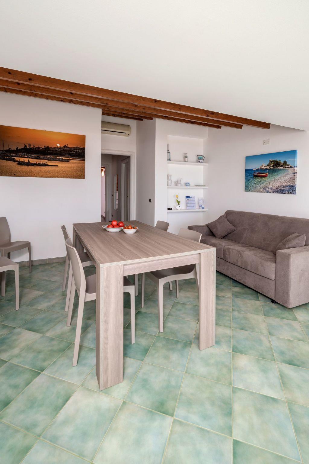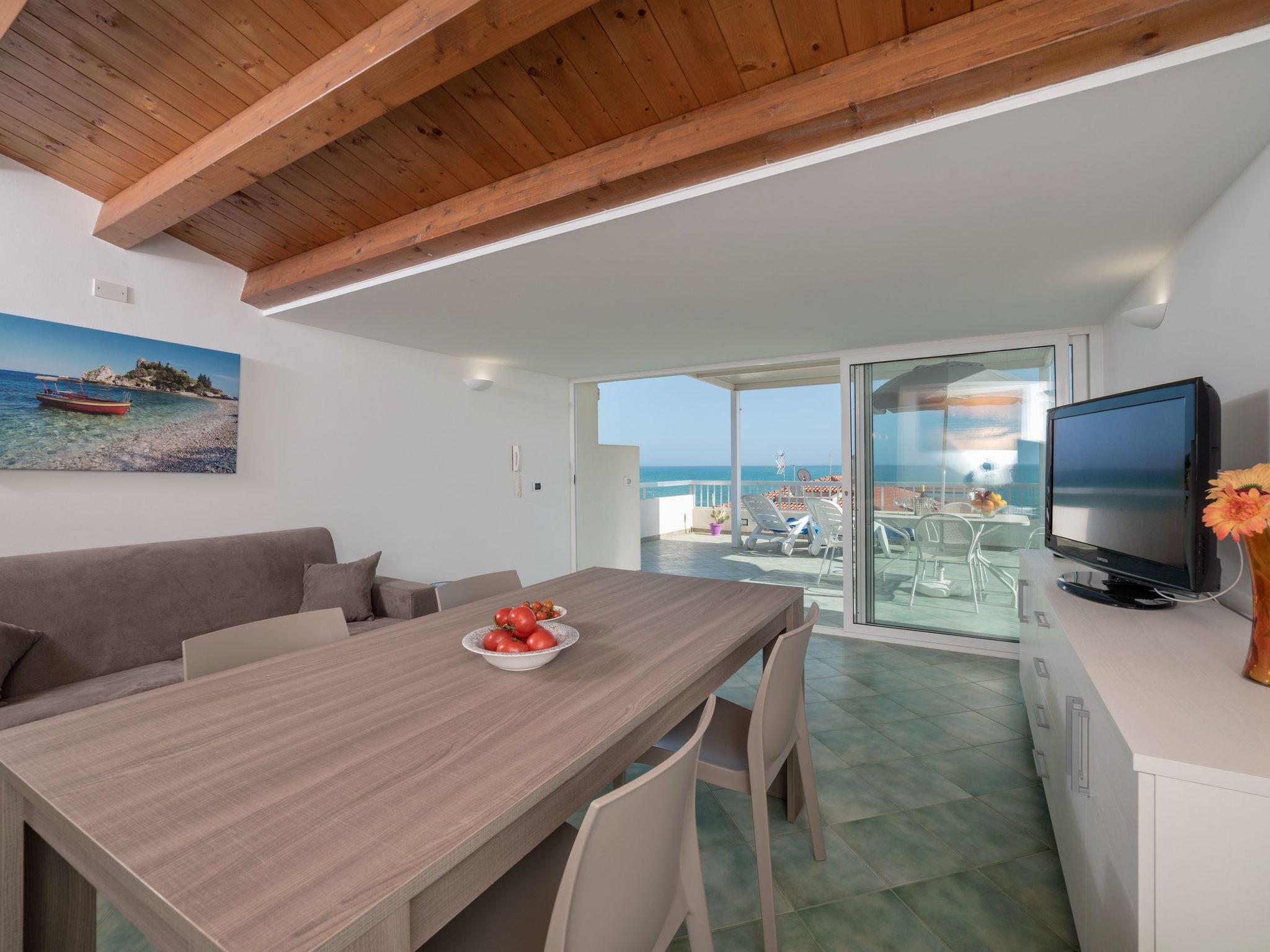 The living room is very bright and panoramic thanks to large glass walls overlooking the terrace and is furnished with a dining table, TV and sofa bed.