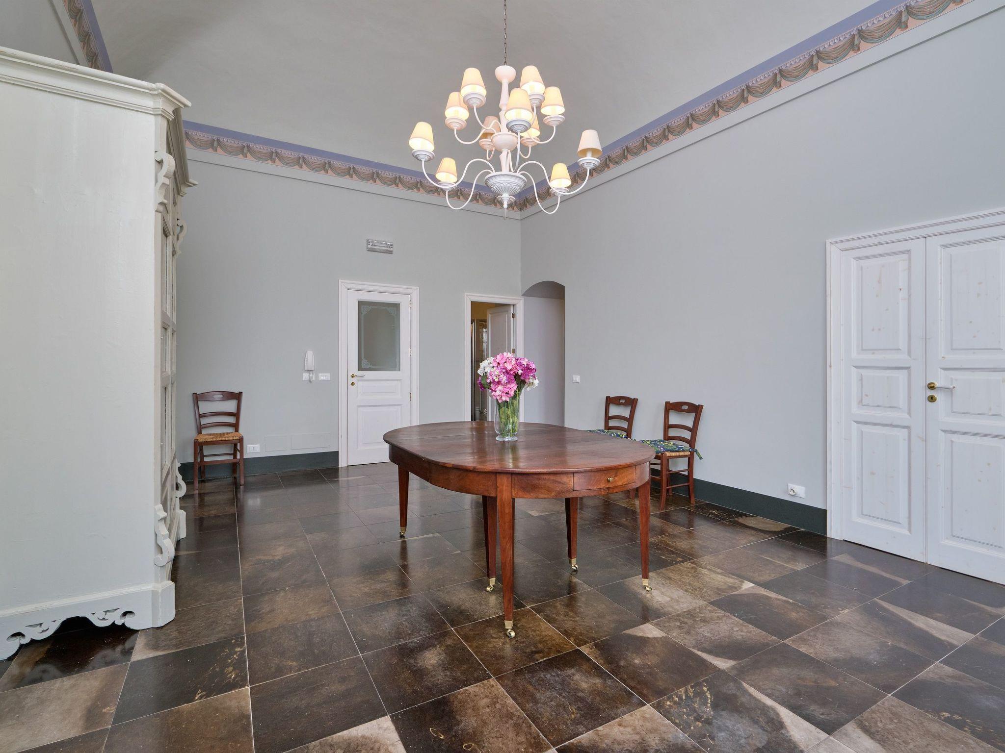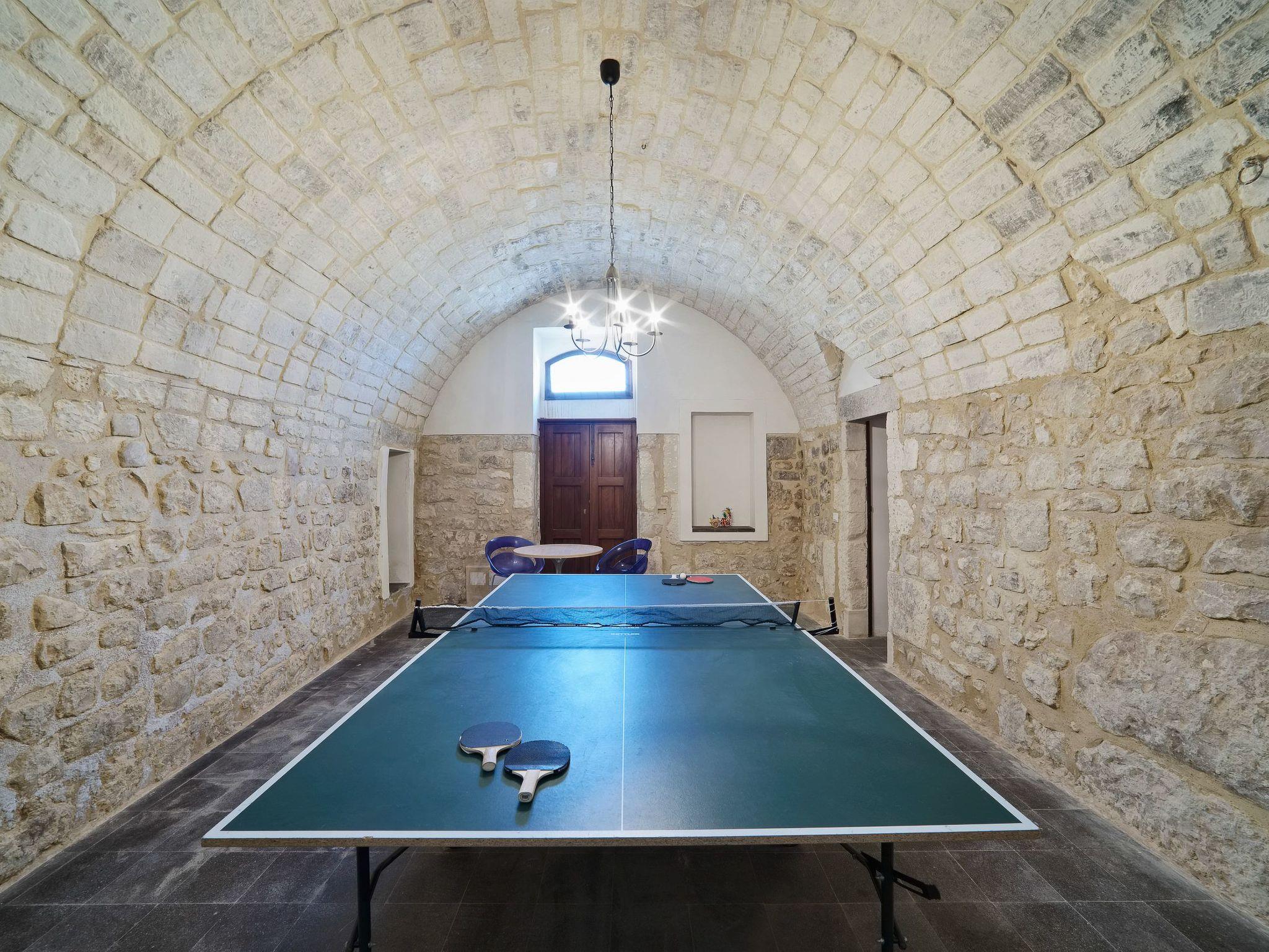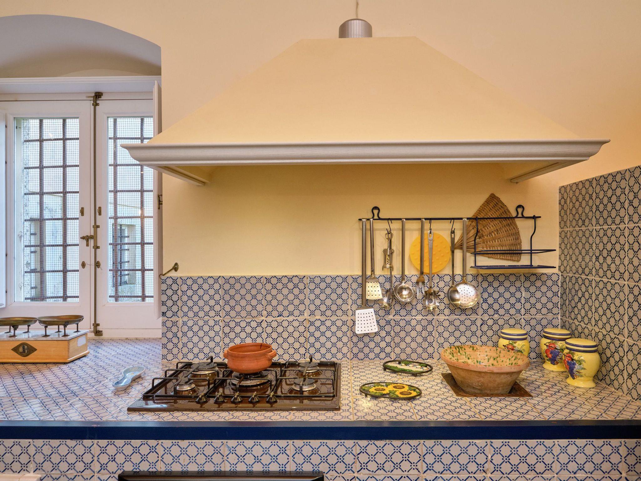 At the entrance of the main house, on the ground floor, there is a game room with table tennis and table football. The living area is on the first floor. The living area has a dining room with view, fireplace, lounge, sofa bed and TV. It has access to the panoramic terrace and overlooks the courtyard. Two bathrooms, one with shower, serve the living area. A kitchen with old wood stove, electric oven, fridge, freezer and dishwasher. The kitchen overlooks the terrace, the garden and the pool. A laundry room with washing machine and sink for the laundry. The sleeping area consists of four bedrooms, each one with TV, safe and minibar. A first double bedroom with lounge and view, with direct access to the terrace. A second double bedroom, with added single bed. A third double bedroom with en suite bathroom and bath. A fourth double bedroom with en suite bathroom and shower. Hot/cold air conditioning in all ambiences. Internet Wi-Fi connection.