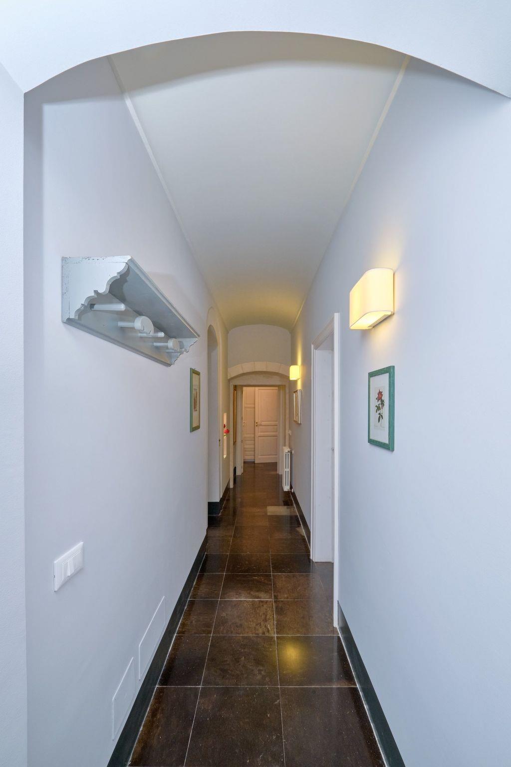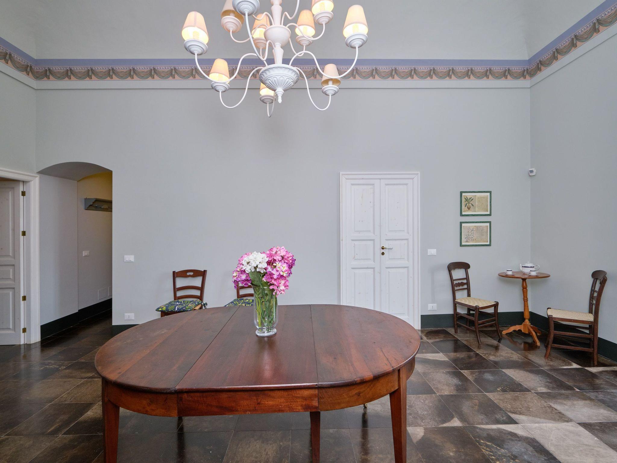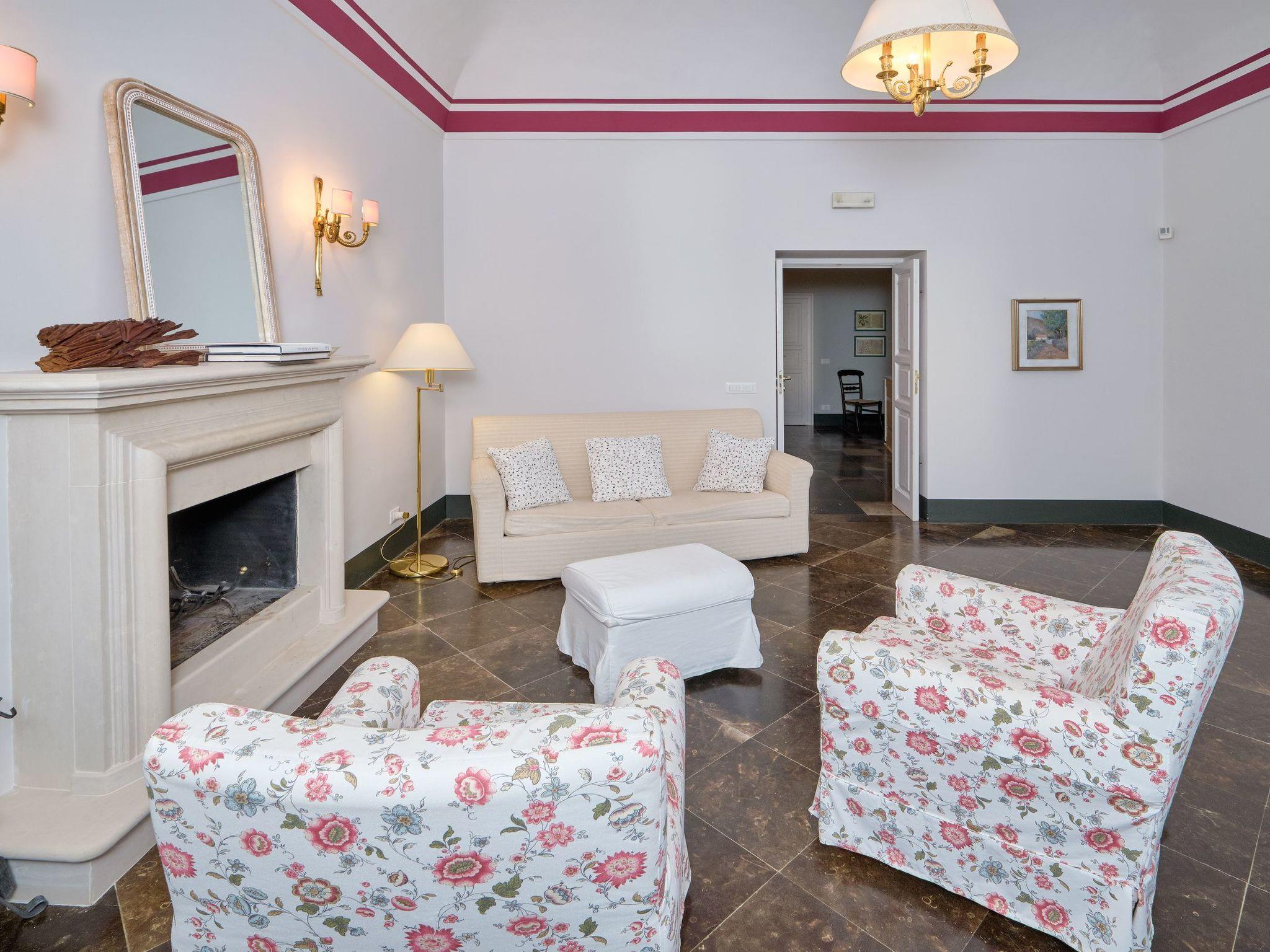 At the entrance of the main house, on the ground floor, there is a game room with table tennis and table football. The living area is on the first floor. The living area has a dining room with view, fireplace, lounge, sofa bed and TV. It has access to the panoramic terrace and overlooks the courtyard. Two bathrooms, one with shower, serve the living area. A kitchen with old wood stove, electric oven, fridge, freezer and dishwasher. The kitchen overlooks the terrace, the garden and the pool. A laundry room with washing machine and sink for the laundry. The sleeping area consists of four bedrooms, each one with TV, safe and minibar. A first double bedroom with lounge and view, with direct access to the terrace. A second double bedroom, with added single bed. A third double bedroom with en suite bathroom and bath. A fourth double bedroom with en suite bathroom and shower. Hot/cold air conditioning in all ambiences. Internet Wi-Fi connection.