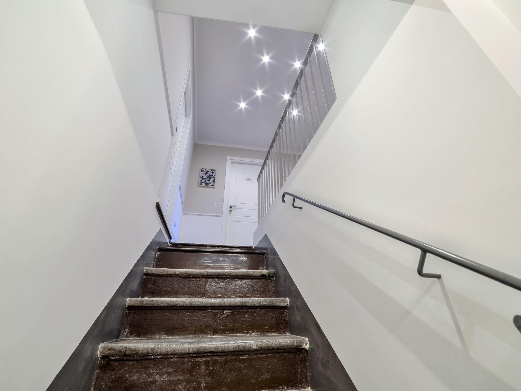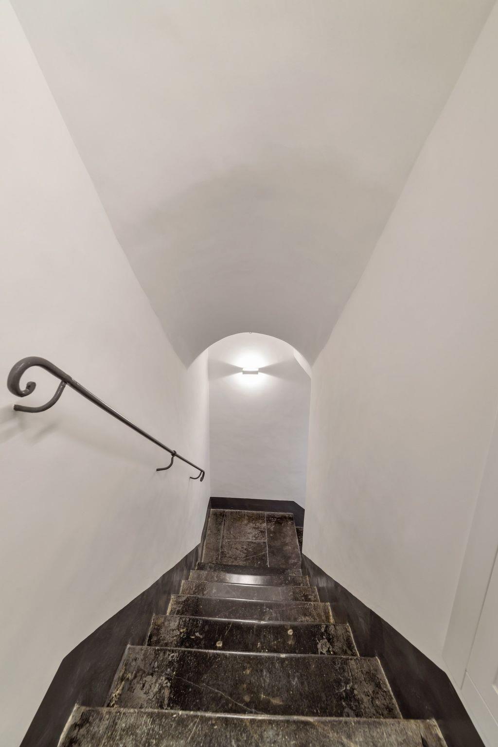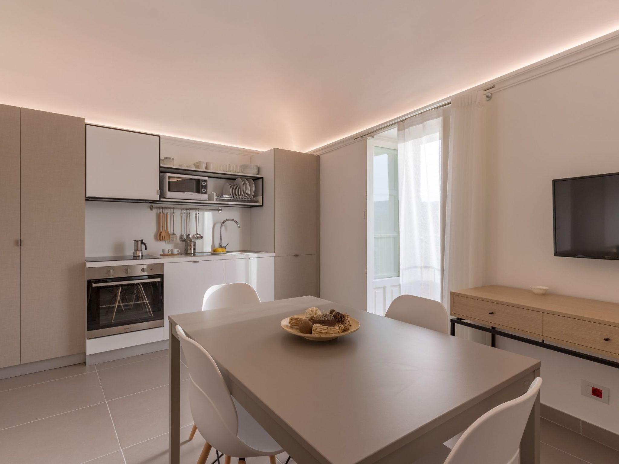 Large apartment with balcony and beautiful view of the Cathedral of San Giorgio and the square. On the second floor of a noble building, it offers smart and refined interiors, equipped with all comforts, with decorated ceilings, stuccos and antique floors. It consists of a living area and a sleeping area with 2 bedrooms and 3 bathrooms. An elegant living room with a beautiful panoramic view, furnished with armchairs, large wall-mounted TV and a bar corner. A kitchen, with TV, dining table and comfortable double sofa bed, offers fridge, freezer, dishwasher, microwave and induction plates. A bathroom with a hydromassage shower. Two bedrooms: one with a double bed and an en suite bathroom with a hydromassage shower; a double room, with an en-suite bathroom and a hydromassage shower, which opens onto a small balcony with a view. Each room has a TV and a safe. Air conditioning, hairdryer (one for the bathroom) and Wi-Fi. A laundry, shared with the guests of the two neighboring rooms, with washing machine and dryer.