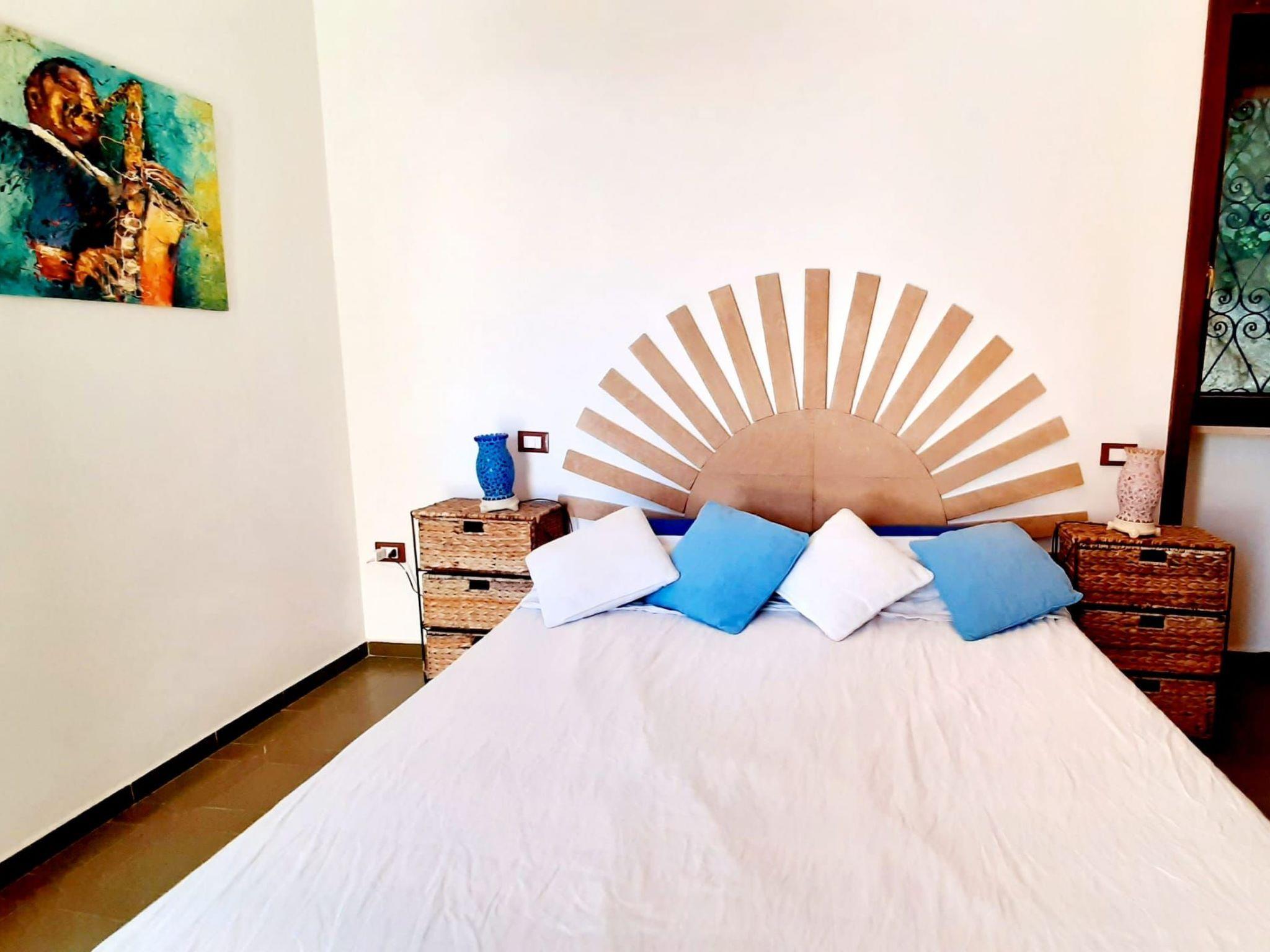 The villa has a stylish decor and provides wireless Internet access, a stereo system and a TV with a satellite receiver. There is a big living room with a dining table and a sofa, as well as a rocking chair. An open fireplace creates a rustic and cosy atmosphere. There is one bedroom with a double bed and another bedroom with a double bed and two single beds. The kitchen has a gas stove and an oven, a dishwasher and everything you need for preparing meals. The bathroom comprises a free-standing bath, a shower and WC. The interior is functional and especially the bathroom has an original décor. Air conditioning is available.