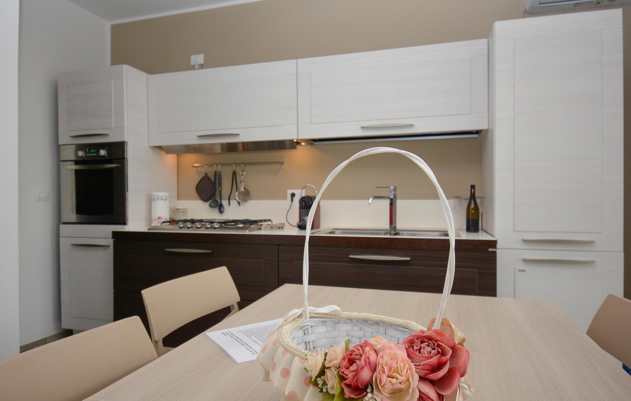 Velkommen til denne charmerende ferielejlighed, hvor I kan slippe væk fra den travle hverdag med familien, ikke langt fra kysten. Tryll lækre måltider frem i det åbne køkken og sæt jer ved spisebordet. Planlæg dagens aktiviteter for den næste dag med et glas vin eller slap af med en god bog i sofaen.