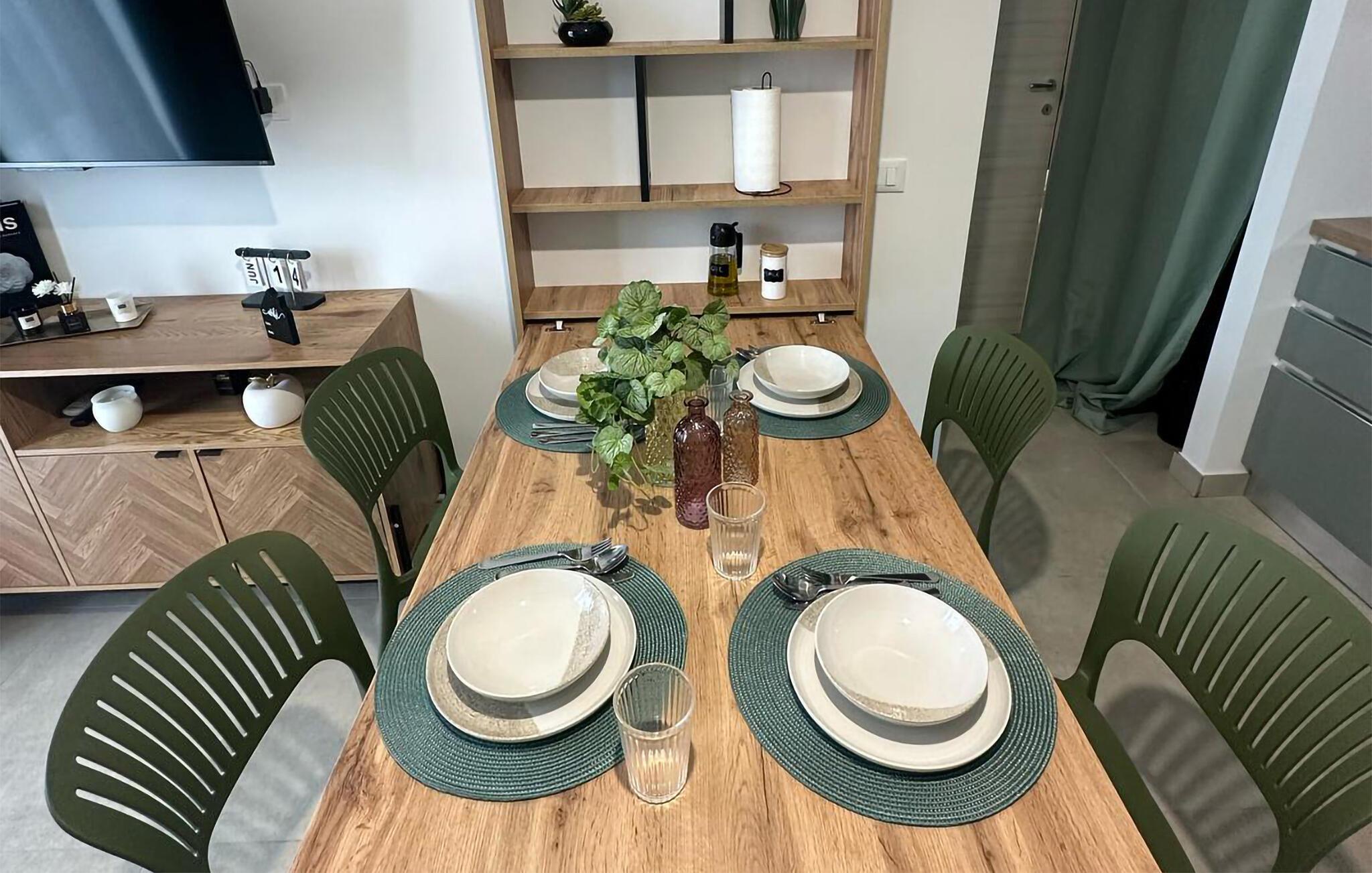 Denne lejlighed er ren og hyggelig – fra det moderne køkken til den komfortable sofa og de omhyggeligt udvalgte detaljer. Uanset om I laver mad med familie eller venner, nyder et måltid sammen med et glas vin eller slapper af i slutningen af dagen på sofaen: Her finder I hurtigt ro og afslapning.