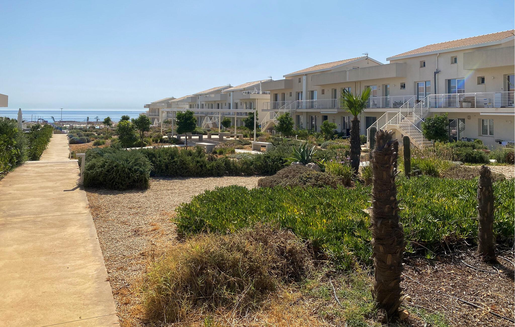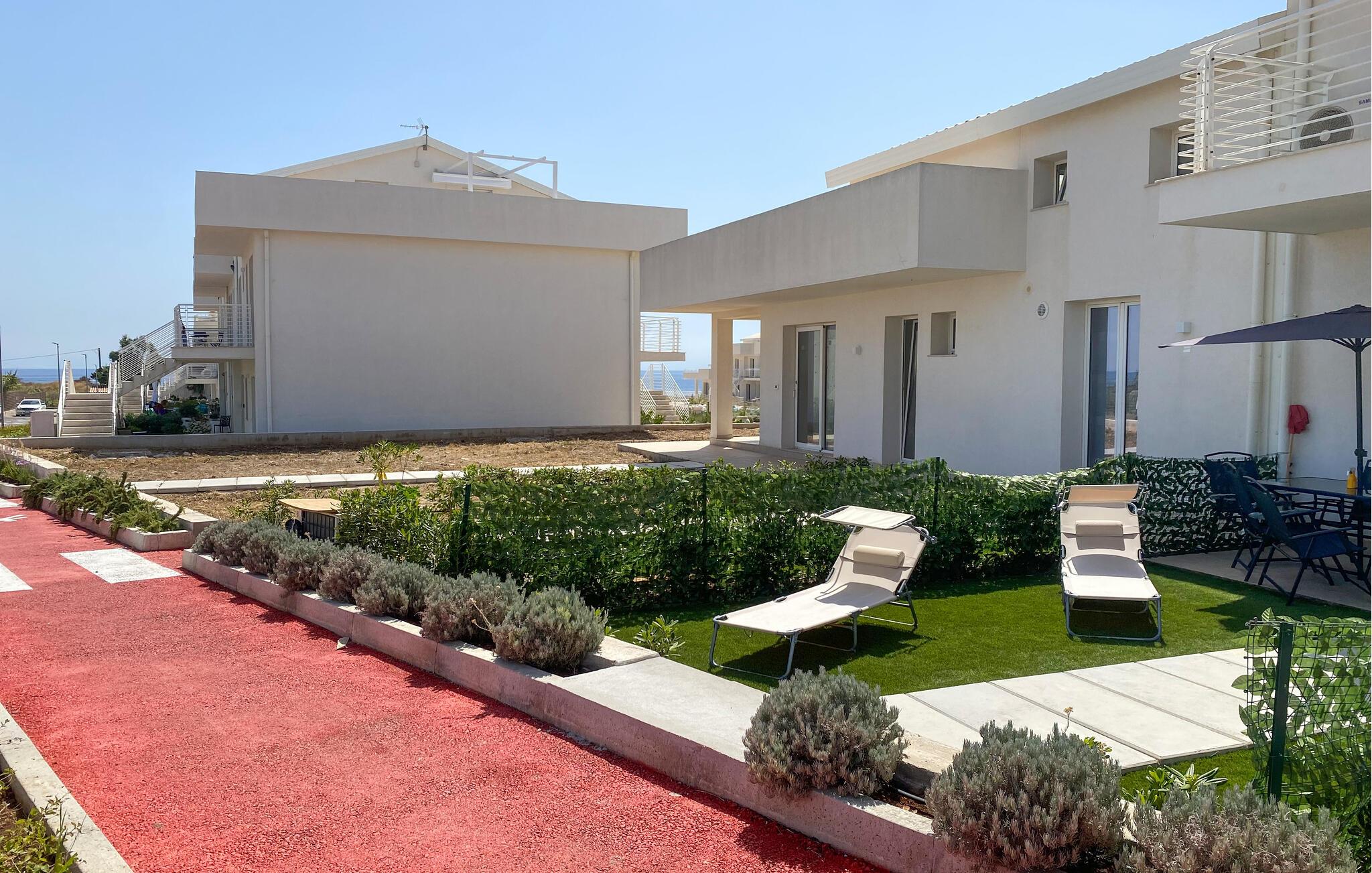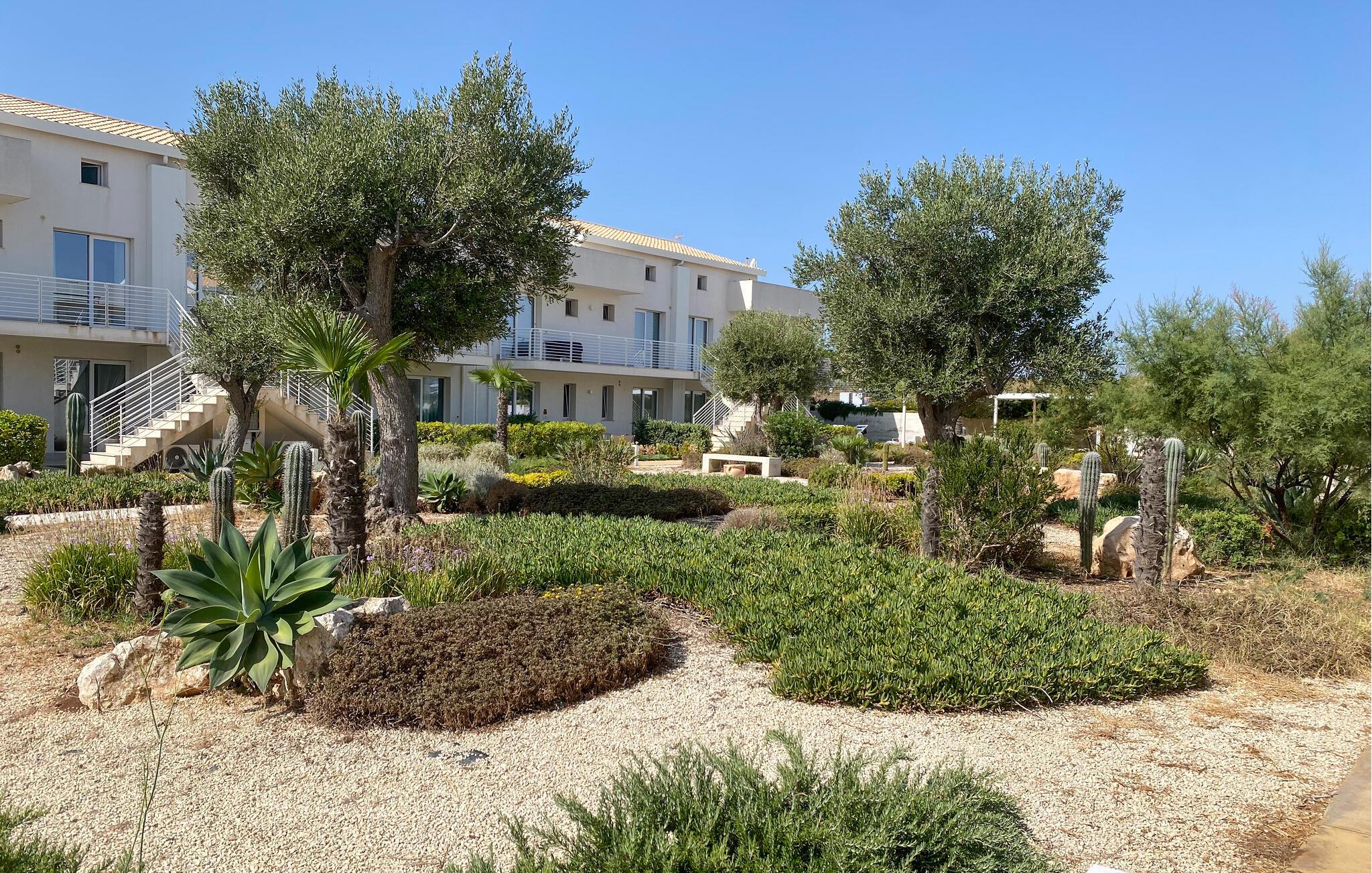 Gå udenfor, og tag plads på jeres private terrasse. Start morgenen med morgenmad under markisen, og lad blikket glide ud over poolen og havet. Slap af om eftermiddagen med en bog, og afslut dagen med et glas vin. Brug den store fællespool til en forfriskende dukkert, og nyd de velplejede omgivelser, der er omkranset af oliventræer og andre middelhavsplanter.