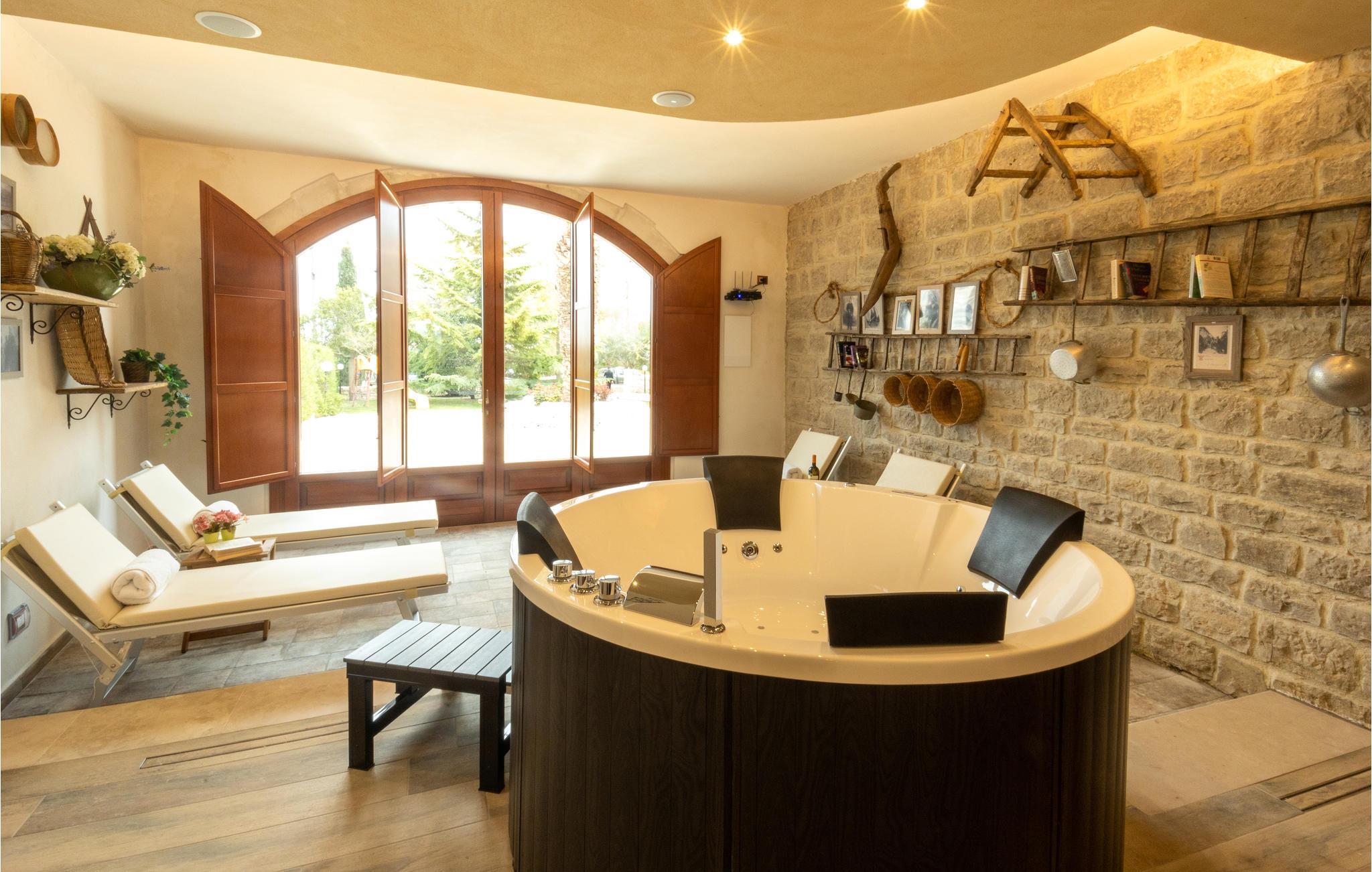 Oplev det indbydende interiør med naturstensvægge, varme farver og omhyggeligt udvalgte detaljer. Læn jer tilbage i den hyggelige stue eller tilbered lækre måltider i det traditionelle køkken med træloft og mønstrede fliser. Udnyt den direkte adgang til den store, overdækkede terrasse til spisning under åben himmel. Et særligt højdepunkt er det private spa-område med spabad, sauna, skotsk bruser og et komfortabelt afslapningsområde – ideelt til afslapning på alle tider af året.