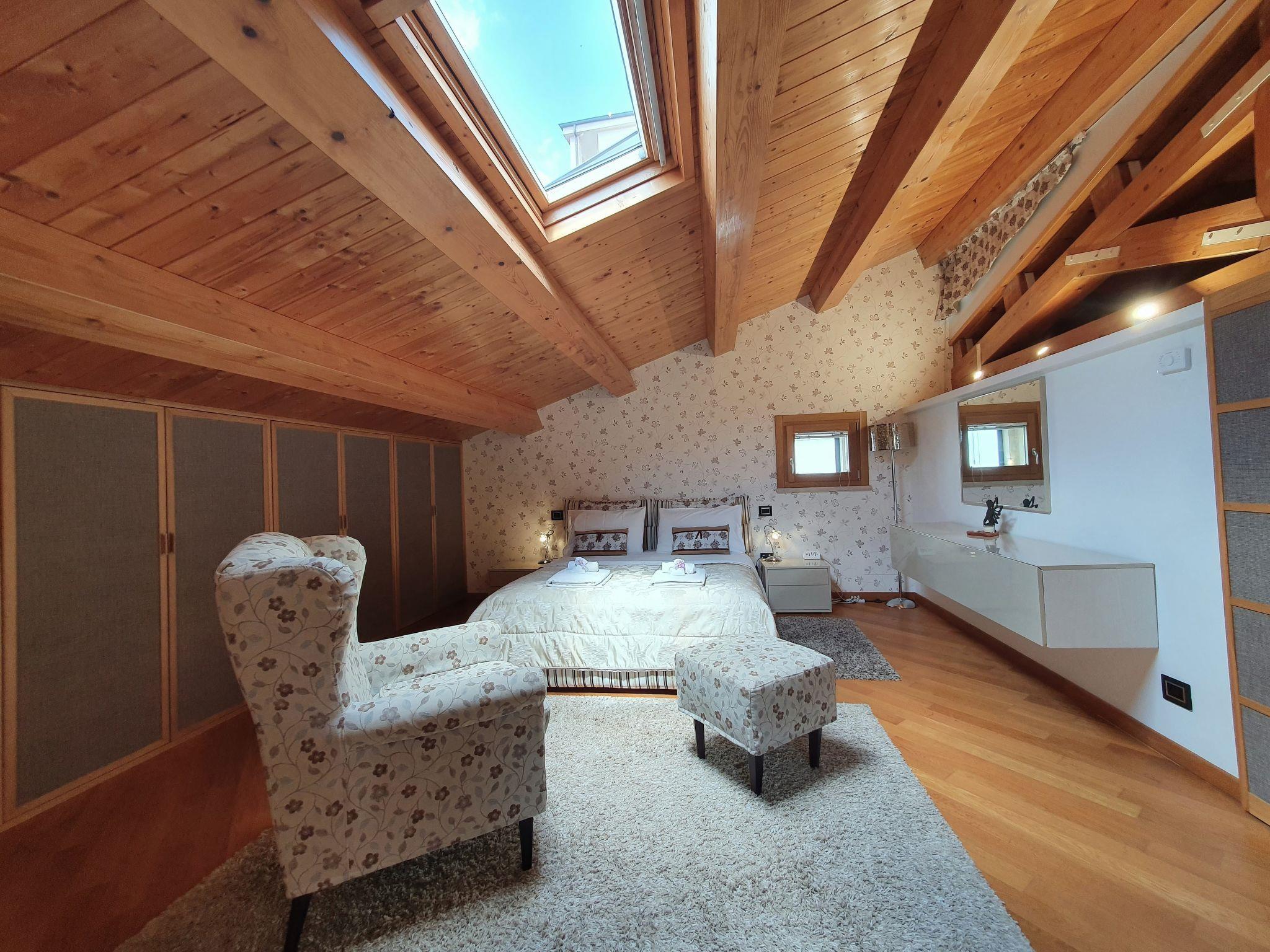2-room apartment 88 m2 on 2nd floor. Luxurious and wooden furniture furnishings: living/dining room with sloping ceilings, ceiling height 300 - 360 cm with 1 double sofabed and satellite TV (flat screen), hi-fi system, DVD and air conditioning. 1 open double bedroom with sloping ceilings, ceiling height 165 - 315 cm with TV (flat screen), air conditioning. Kitchen (4 hot plates, oven, dishwasher, toaster, microwave, electric coffee machine) with dining table, TV (flat screen). Shower/bidet/WC. Heating, air-conditioning, forced-air heating (extra). Heating available only from 01.12. to 31.03. Parquet floors. Facilities: washing machine, dryer, telephone, iron, children's high chair, baby cot for up to 2 year olds (extra), hair dryer. Internet (WiFi, free). Please note: non-smoking house. Smoke alarm, fire extinguisher, no lift. IT088006C26DU7NUZM