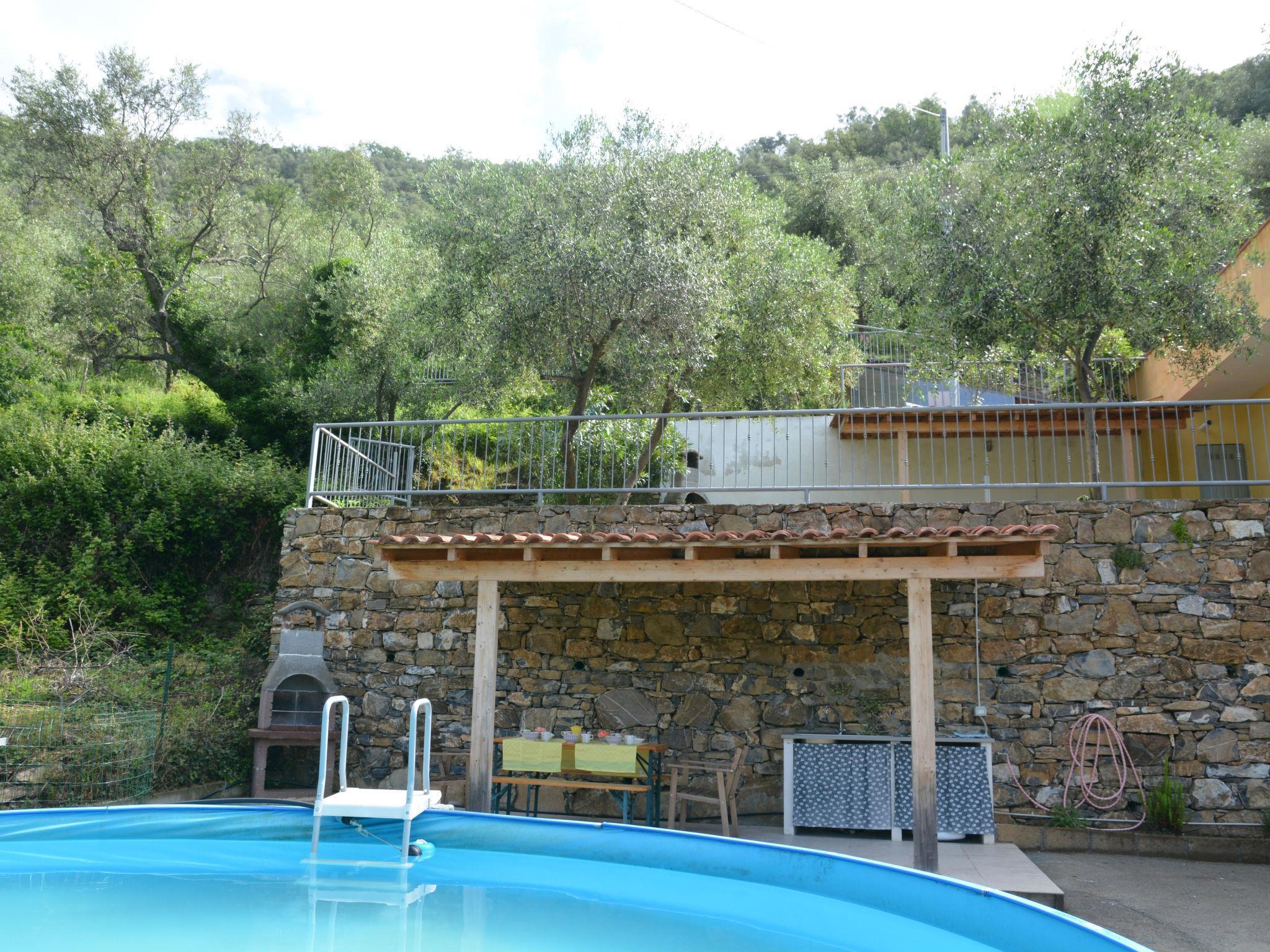 Small, beautiful residence "Clara", built in 2014, surrounded by trees. 4 apartments in the residence. In the hamlet Canneto 3 km from the centre of Prelà, 5 km from the centre of Dolcedo, 12 km from the centre of Imperia, in a quiet, sunny position on a slope, 15 km from the sea, in a cul-de-sac, in the countryside. For shared use: natural state property 1'200 m2 (fenced) with trees, natural garden, swimming pool (above ground) kidney-shaped (8 x 4 m, depth 120 cm, seasonal availability: 01.Jan. - 31.Dec.). Outdoor shower. 50 m long steep, narrow motor access to the house (ramp). Parking (limited number of spaces) at the house. Shop 3 km, supermarket 12 km, restaurant 3 km, bar 3 km, bakery 3 km, café 3 km, bus stop 300 m, railway station "Porto Maurizio" 15 km, sandy beach "Imperia - Porto Maurizio" 15 km. Please note: car recommended.