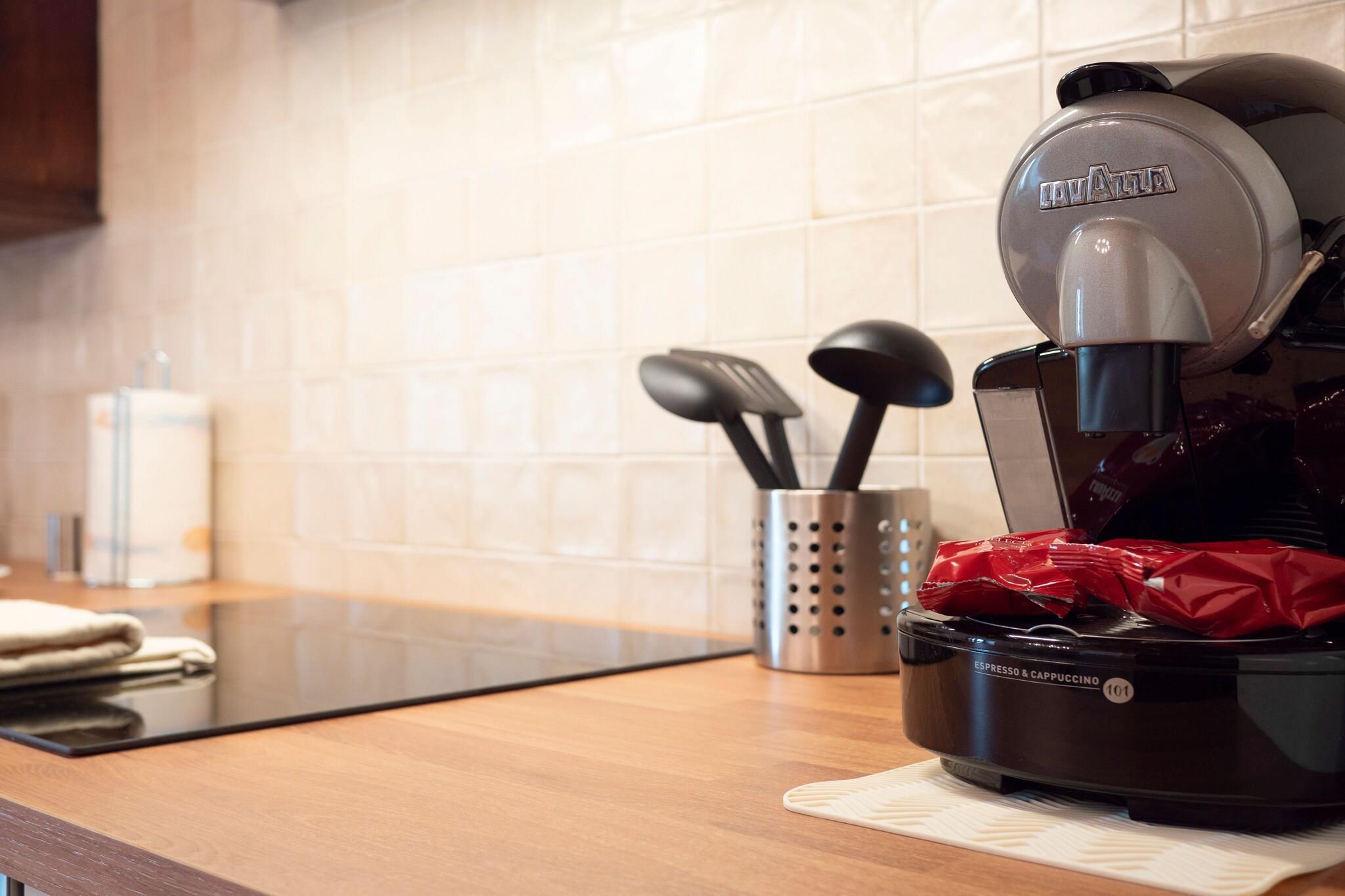 På 1. etage: (Køkken(komfur, kaffemaskine, espressomaskine, ovn, opvaskemaskine , køle-fryseskab), stue / spisestue(dobbeltsovesofa, Fjernsyn, spisebord), soveværelse(dobbeltseng), badeværelse(bruser, håndvask, toilet, bidet), klimaanlæg) parkering, swimmingpool(deles med ejer og andre gæster, 13 x 11 m., opened from 1/2 May upto and including Sep), Surveillance camera