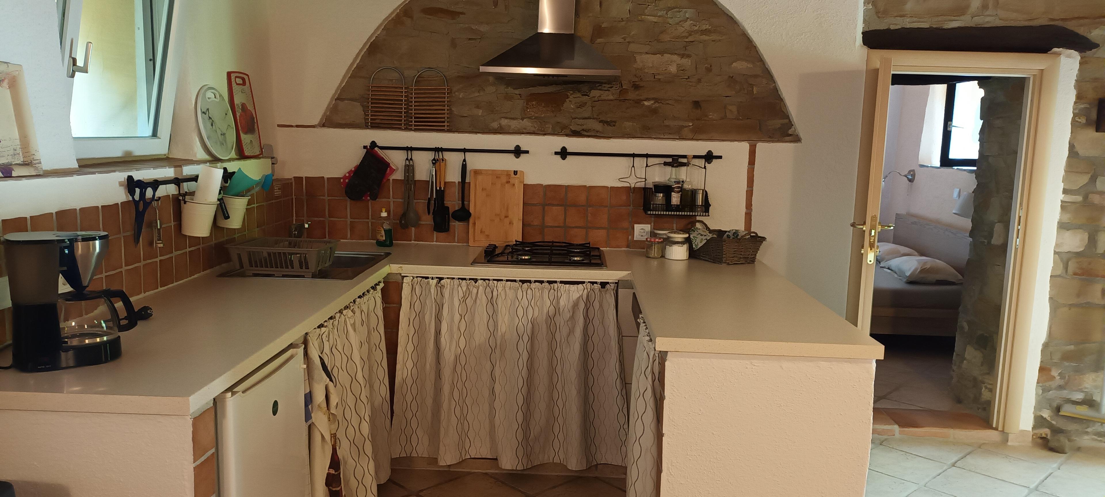 Eine gemütliche, voll ausgestattete Küche mit offenem Wohnbereich lädt zum gemeinsamen Kochen und Verweilen ein.