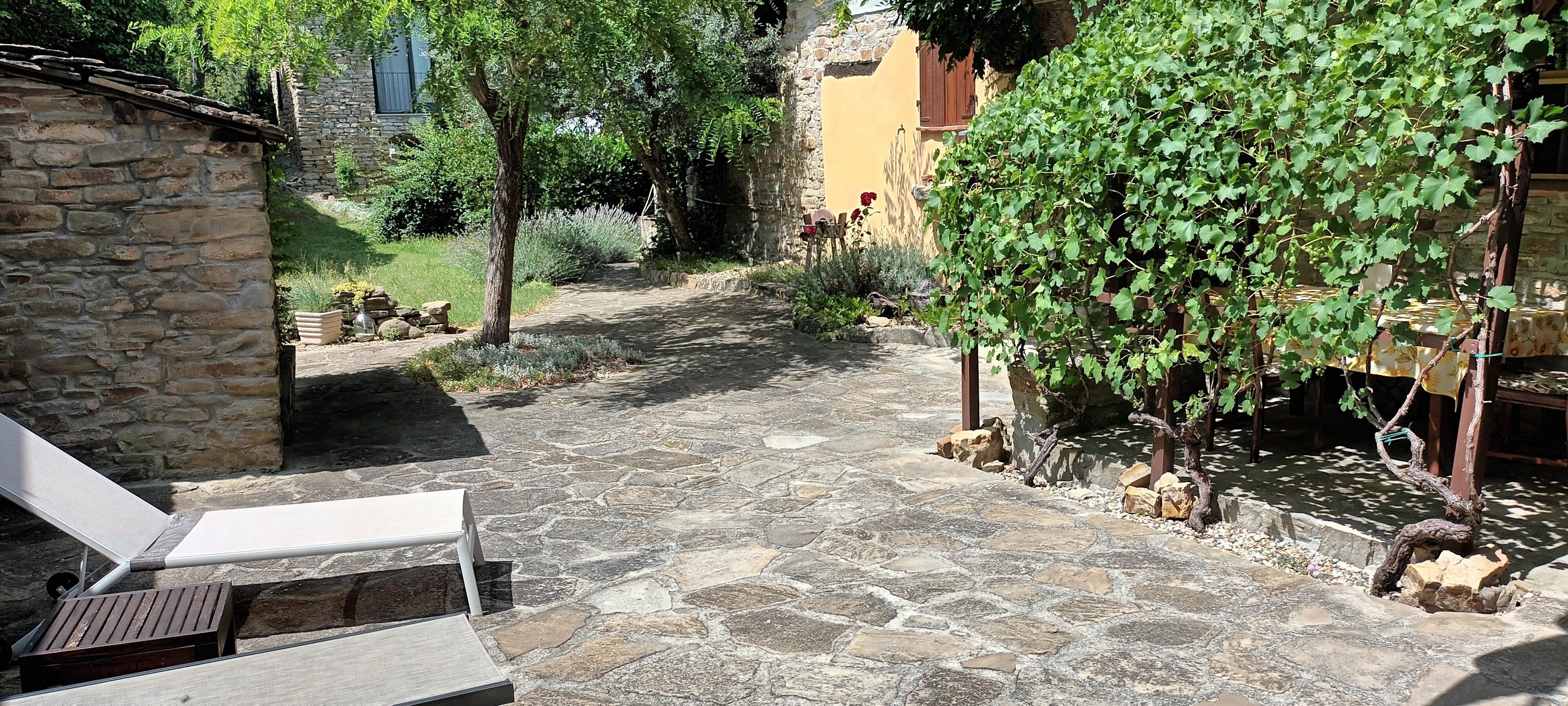 Ein malerischer Innenhof mit überdachtem Sitzplatz, Sonnenliegen und Grillmöglichkeiten, perfekt für sonnige Tage und laue Abende.
