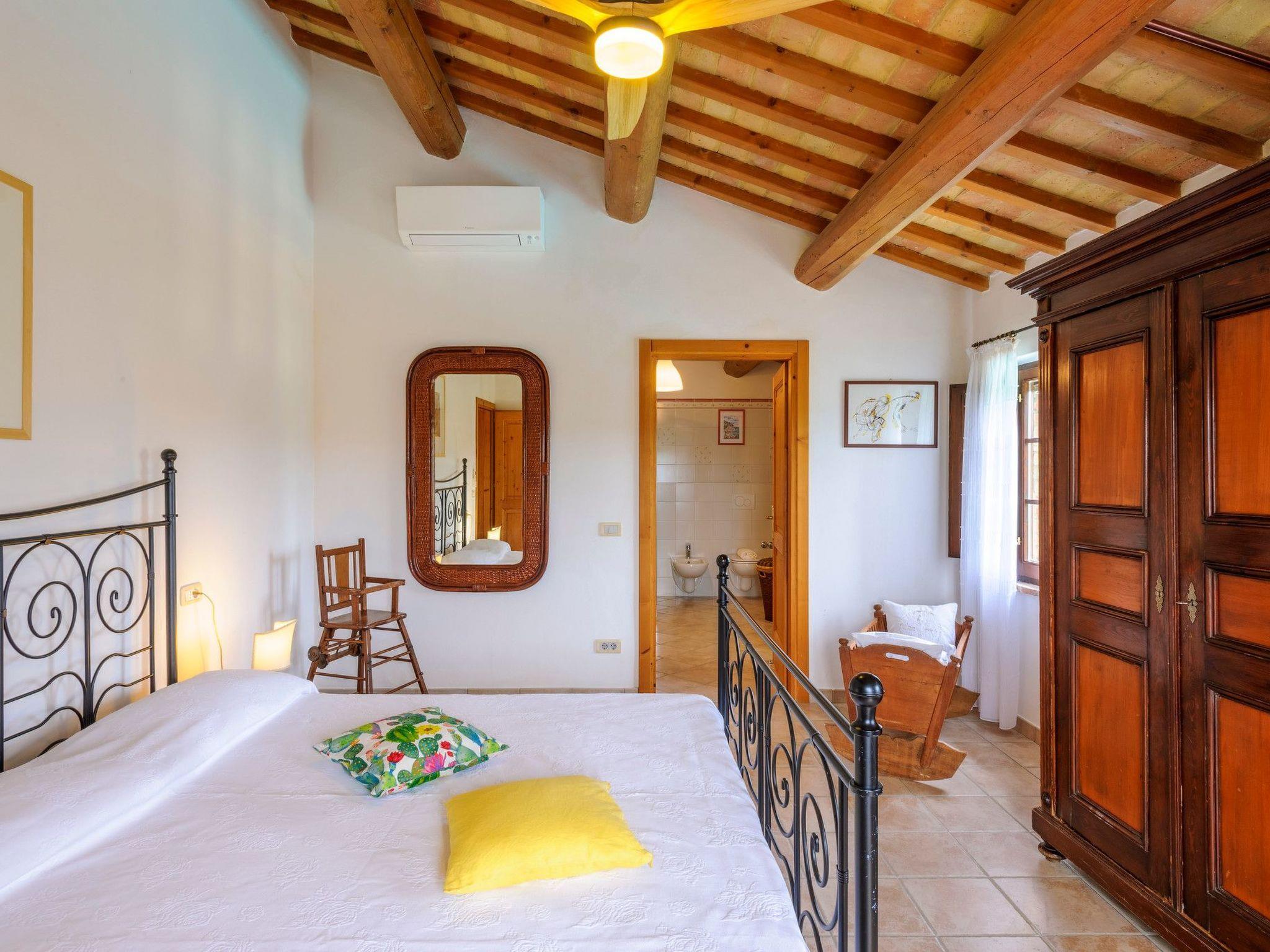 Returning to the corridor and climbing the oak staircase, you enter the sleeping area: on the right there is a double bedroom (with air conditioning) and ensuite bathroom, consisting of toilet, sink, bidet, shower and bathtub.