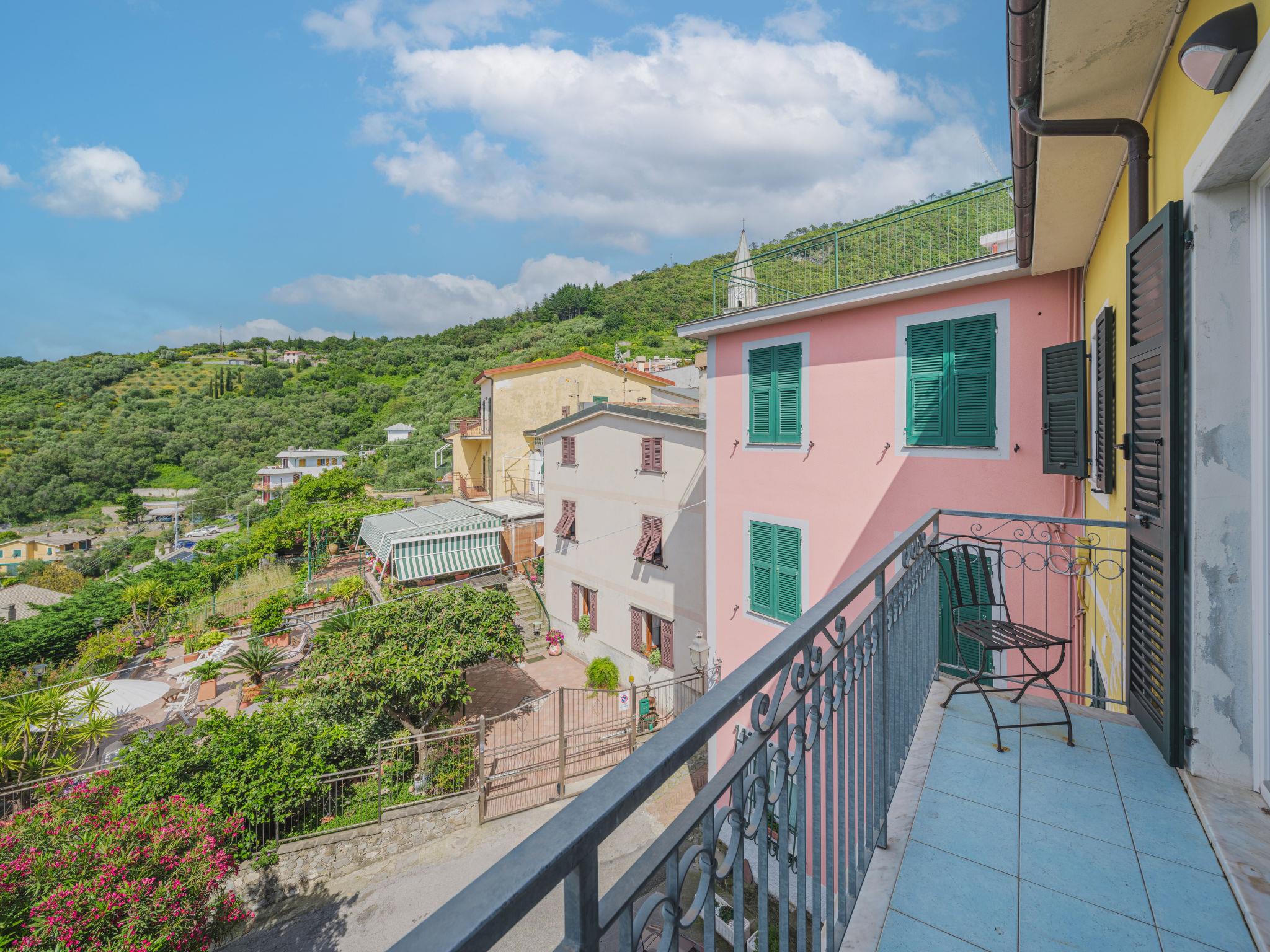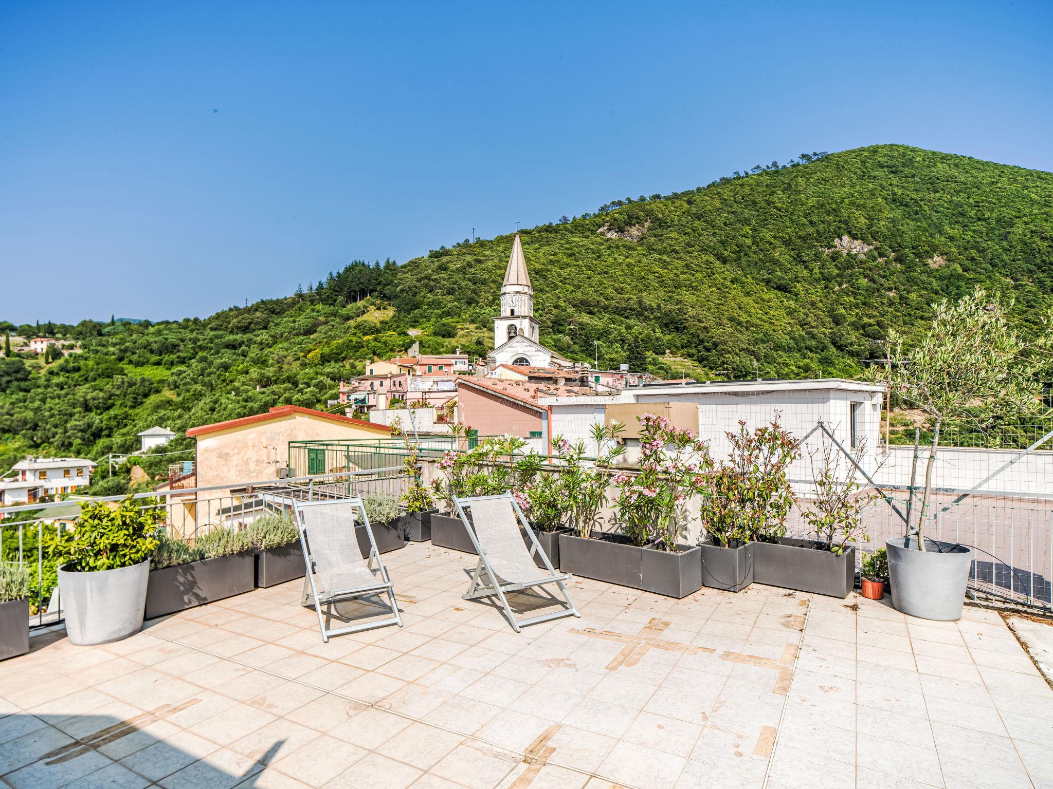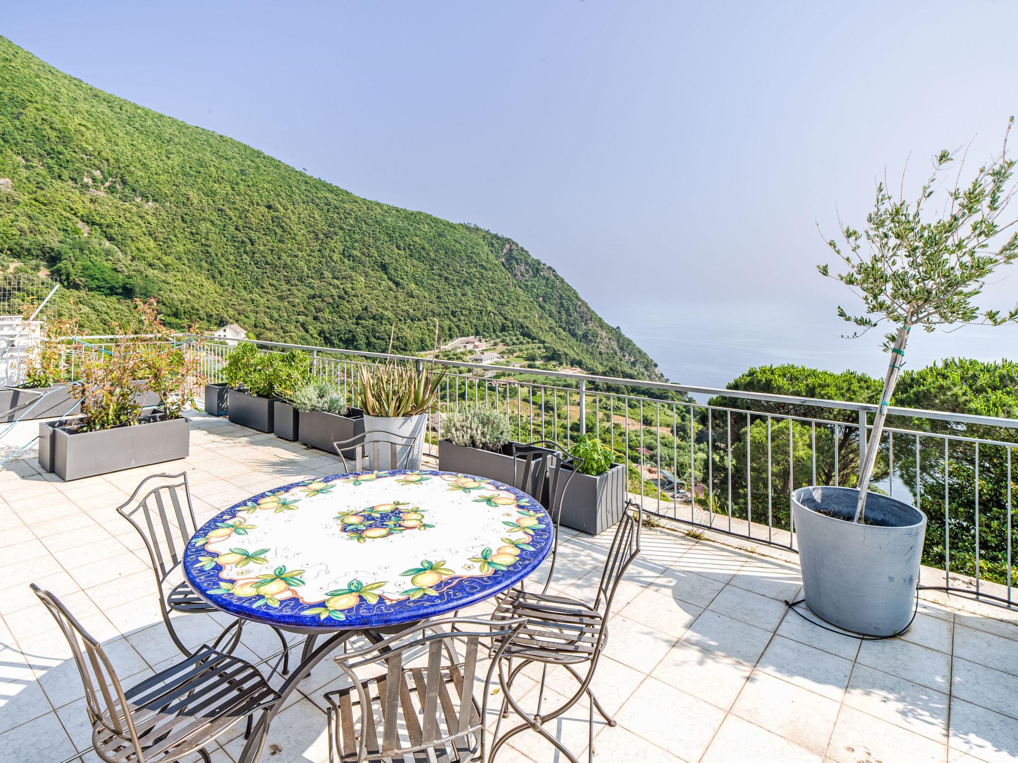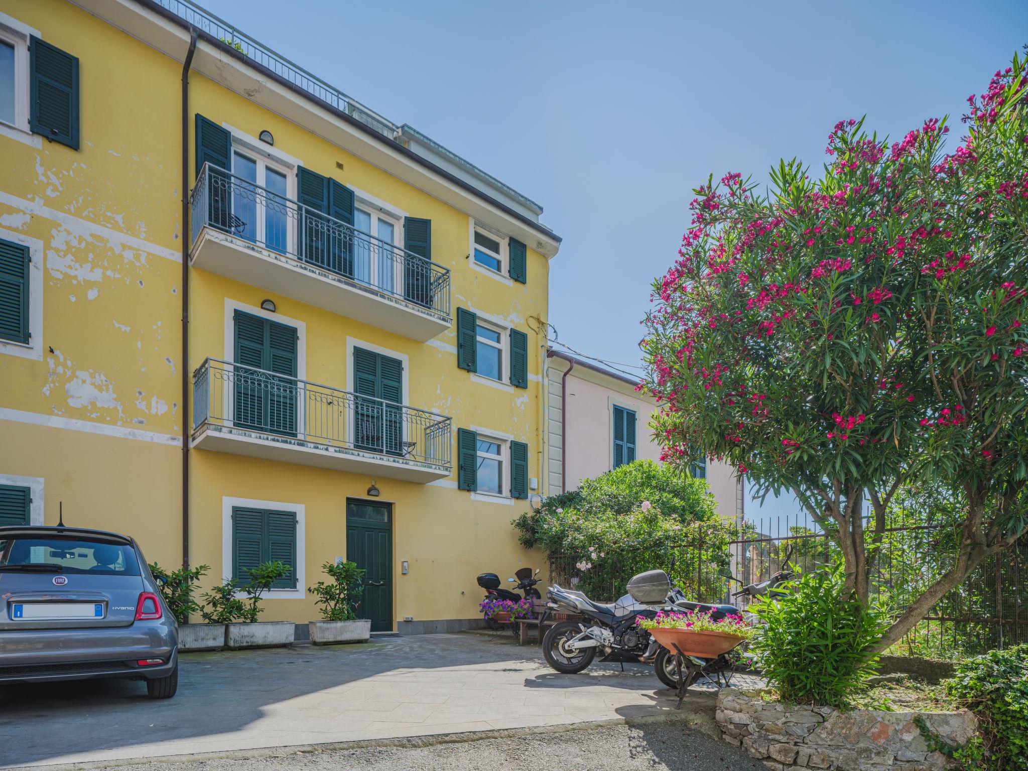 Apartment house. Above Moneglia, in the hamlet Lemeglio 2.2 km from the centre of Moneglia, in an elevated position on a slope, 2.2 km from the sea, in a cul-de-sac. In the house: lift, roof terrace. Public parking 50 m. Supermarket 2 km, restaurant 200 m, bus stop 50 m, railway station "Moneglia" 2.5 km. Please note: car recommended.