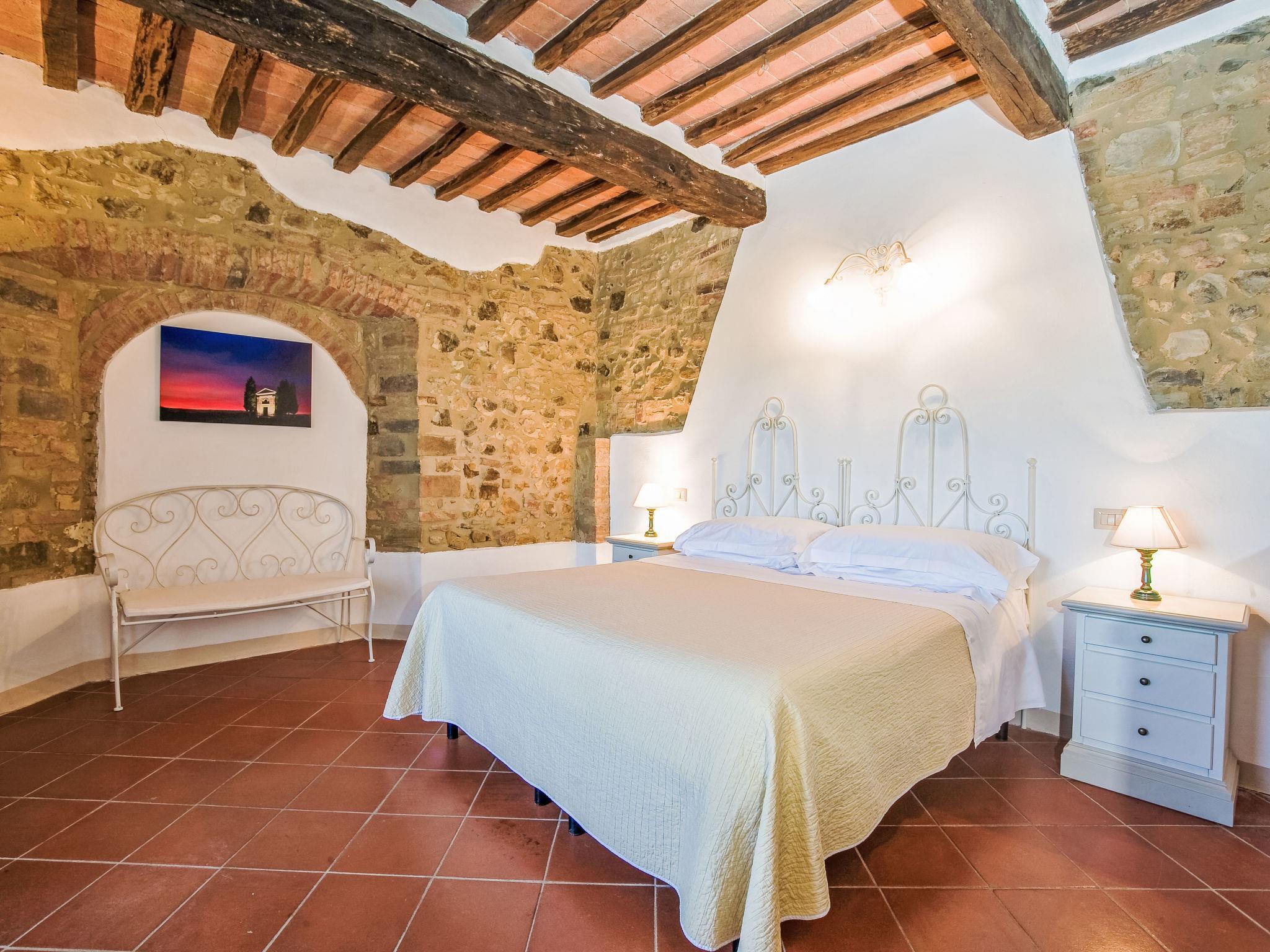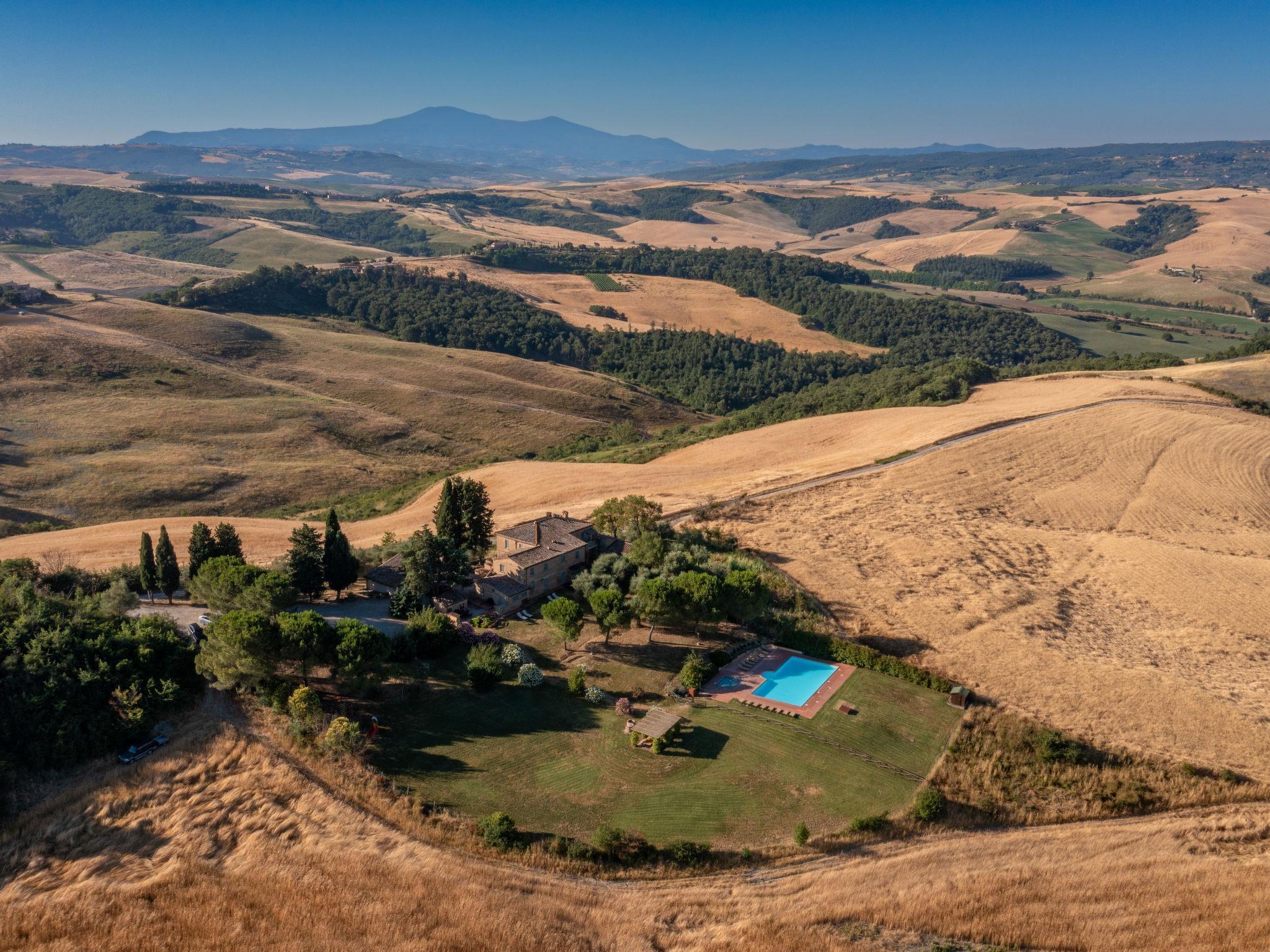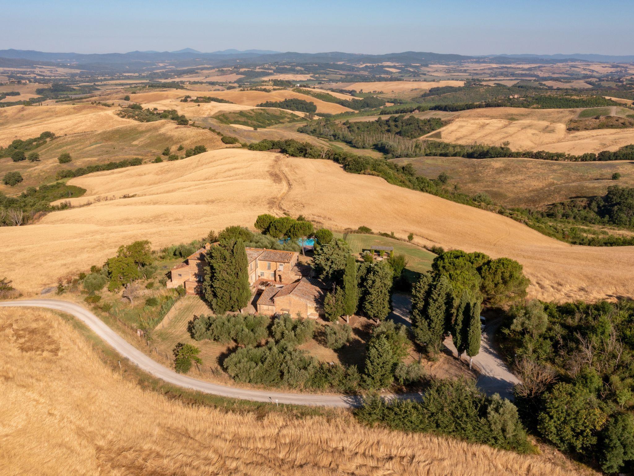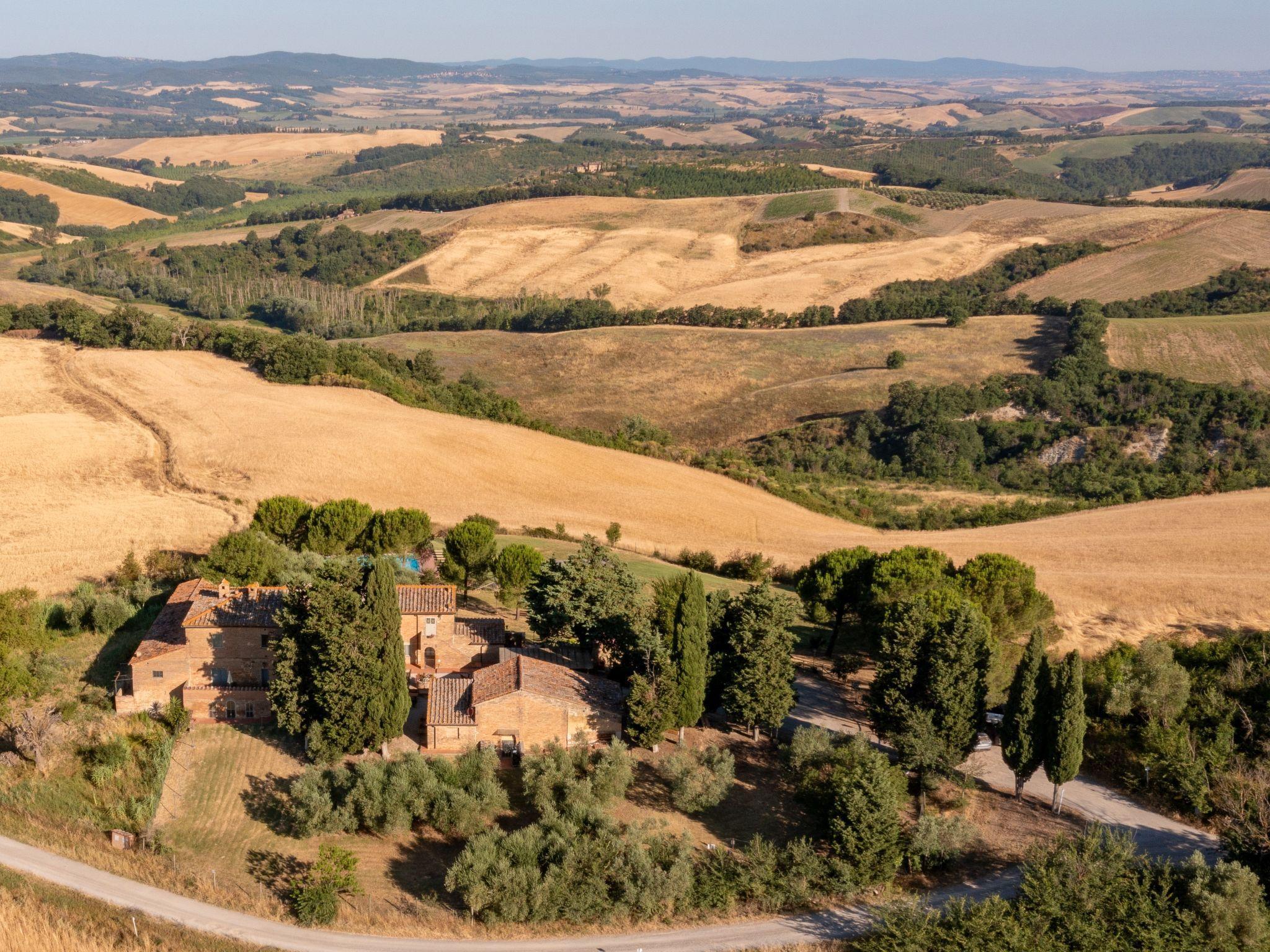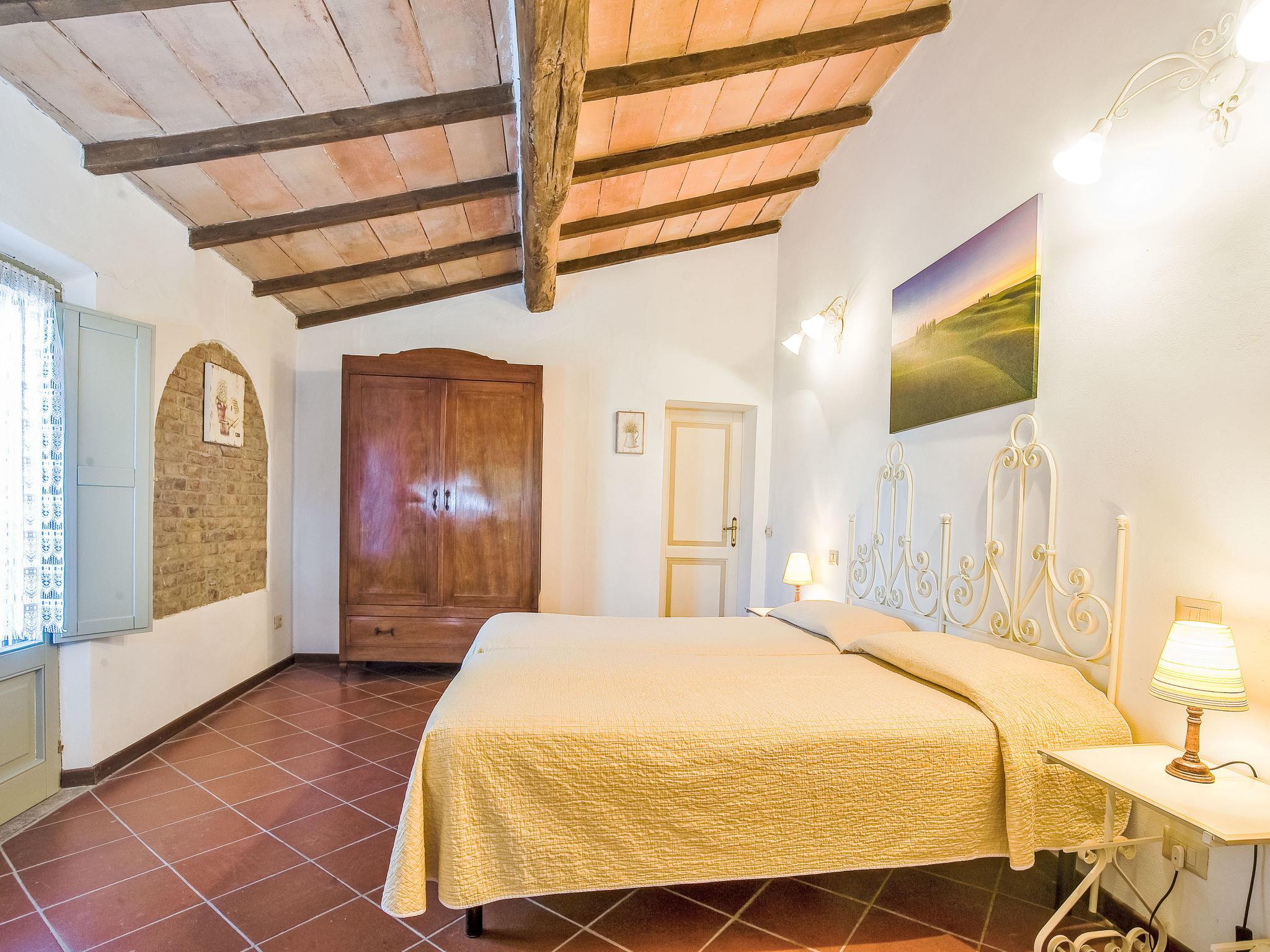 Montalcino: Country house "Podere San Giuseppe", renovated, surrounded by fields and vineyards. 6 apartments in the residence. 7.5 km from the centre of Buonconvento, 16 km from the centre of Montalcino, in a sunny position on top of a hill, in the countryside. For shared use: natural state property, swimming pool (8 x 16 m, depth 140 - 140 cm, seasonal availability: 01.Apr. - 30.Oct.). Children's pool, outdoor shower, terrace, pool maintenance by the owner/gardener. In the house: reception, WiFi, washing machine. Linen change (suppl. charge extra). Room cleaning on request (extra). Cook on request (extra). 3 km long bumpy motor access to the grounds. Parking on the premises. Shop 7.5 km, grocery 7.5 km, supermarket 7.5 km, restaurant 7.5 km, bus stop "Buonconvento" 7.5 km, railway station "Buonconvento" 7.5 km. Nearby attractions: Siena 35 km, Pienza 35 km, Montepulciano 50 km. Please note: baby equipment (included). Suitable for events. The photo is just an example. All houses/apartments are individually designed/furnished. Obligation to wear bathing caps.
