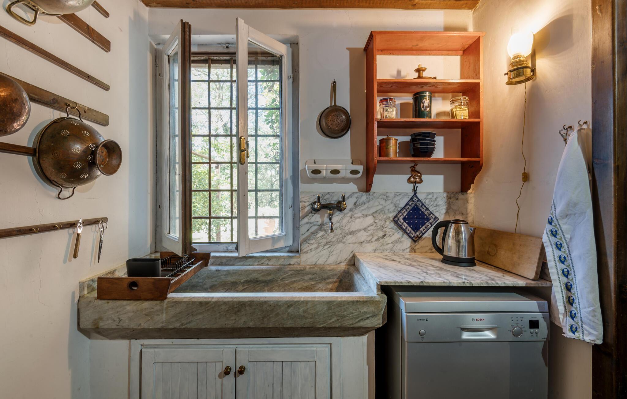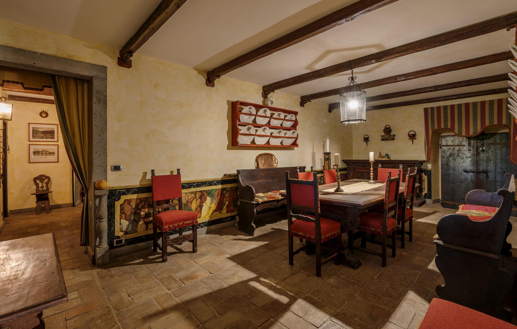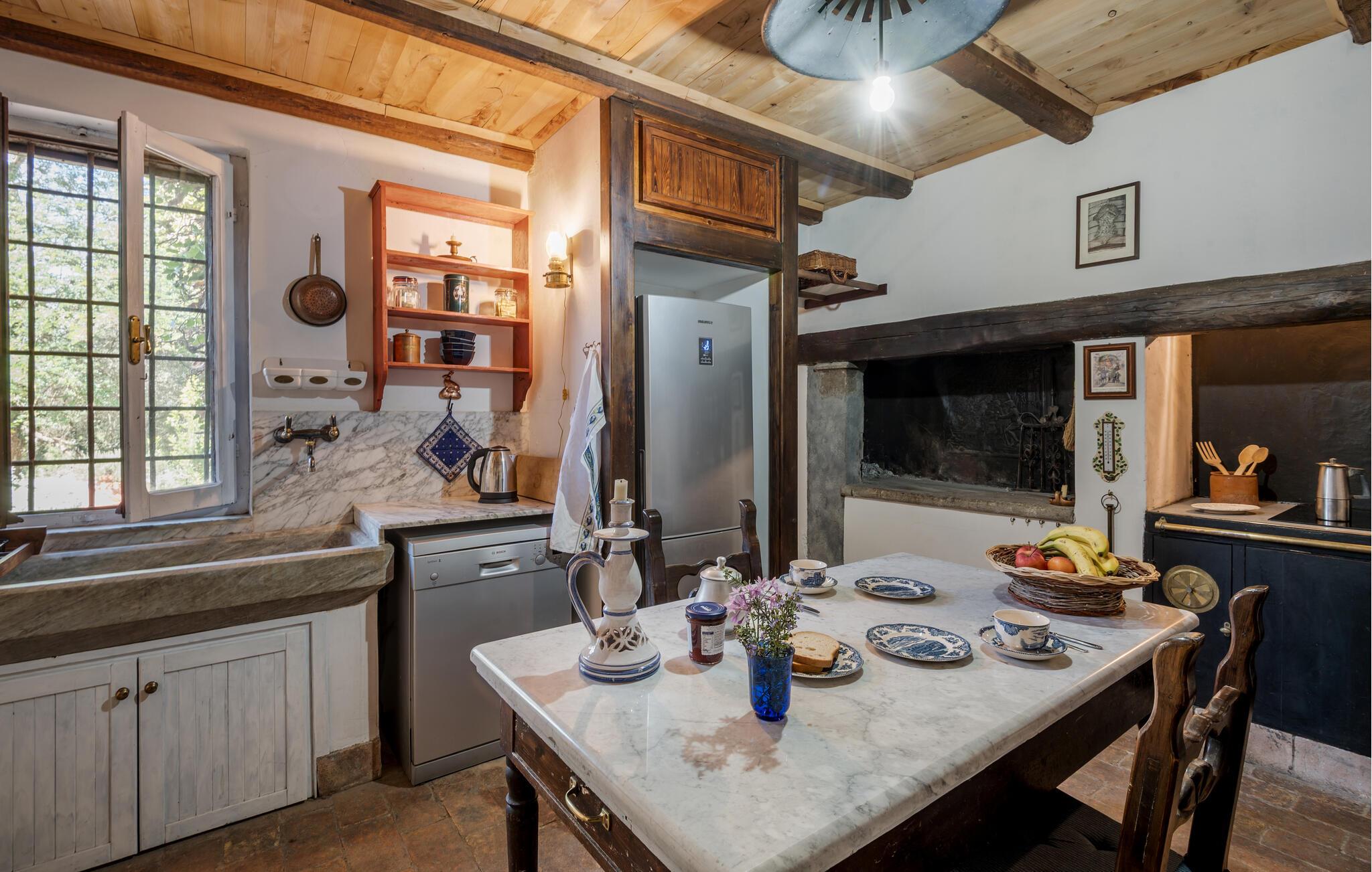 Dette rummelige hus, omgivet af frodig natur, lægger op til en rejse tilbage i tiden med sine charmerende interiører. Nyd den rustikke atmosfære med rustikke trælofter, antikke møbler og charmerende gamle detaljer, og glæd jer til hyggelige måltider, afslappende læsestunder eller en snak om svundne tider over et glas vin i pejsestuen.