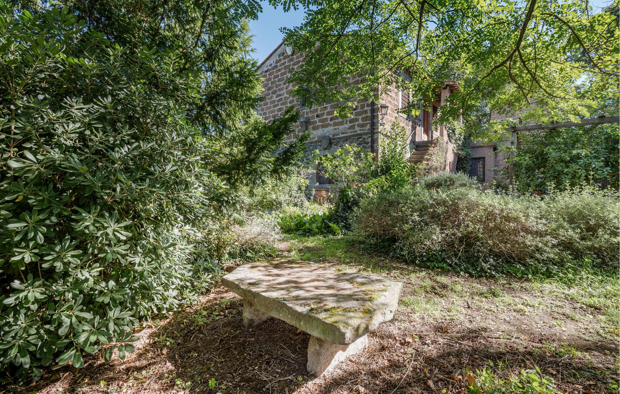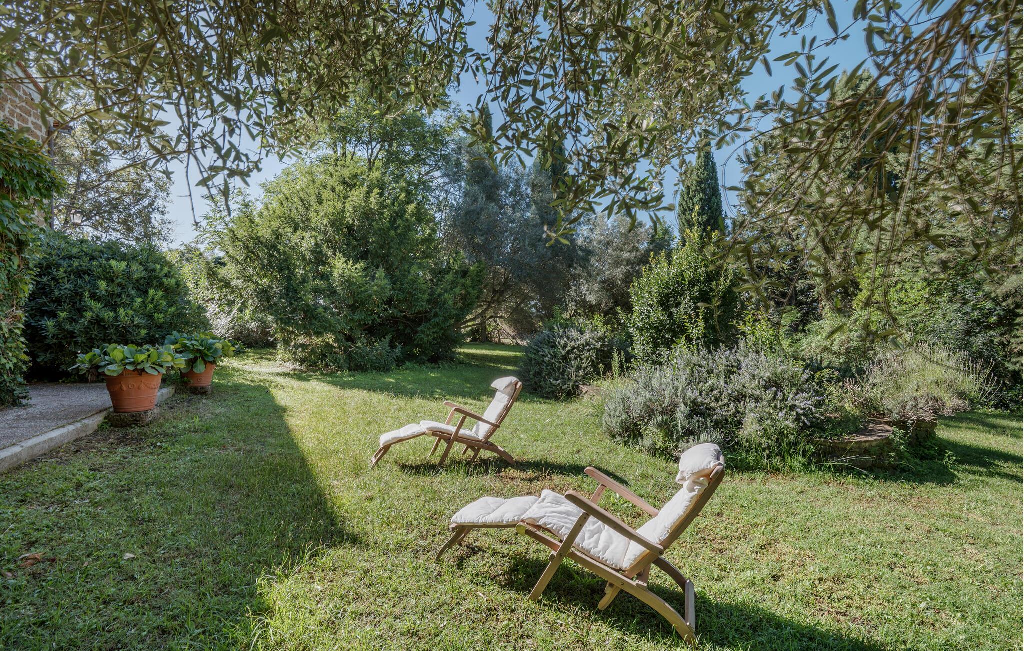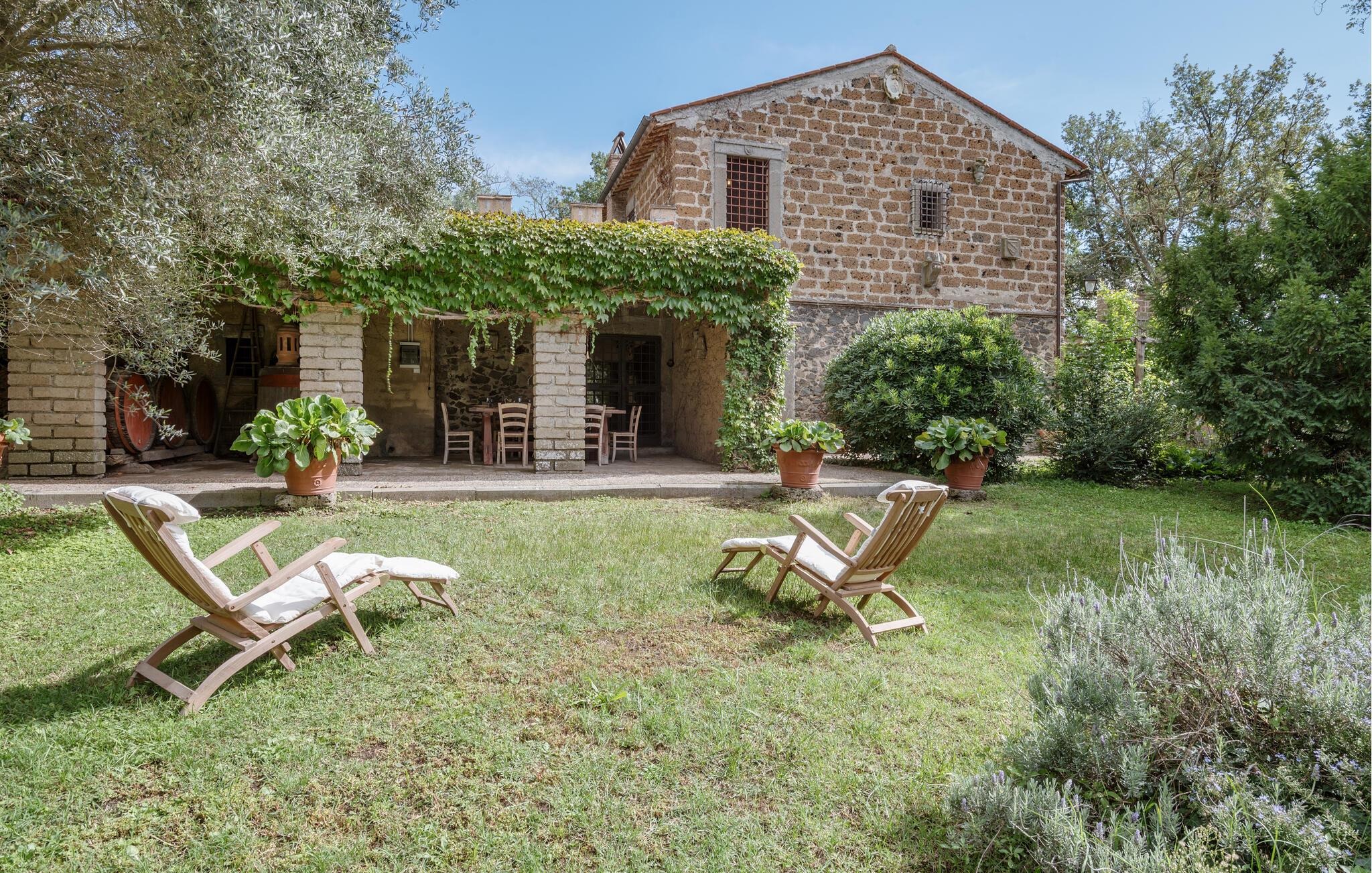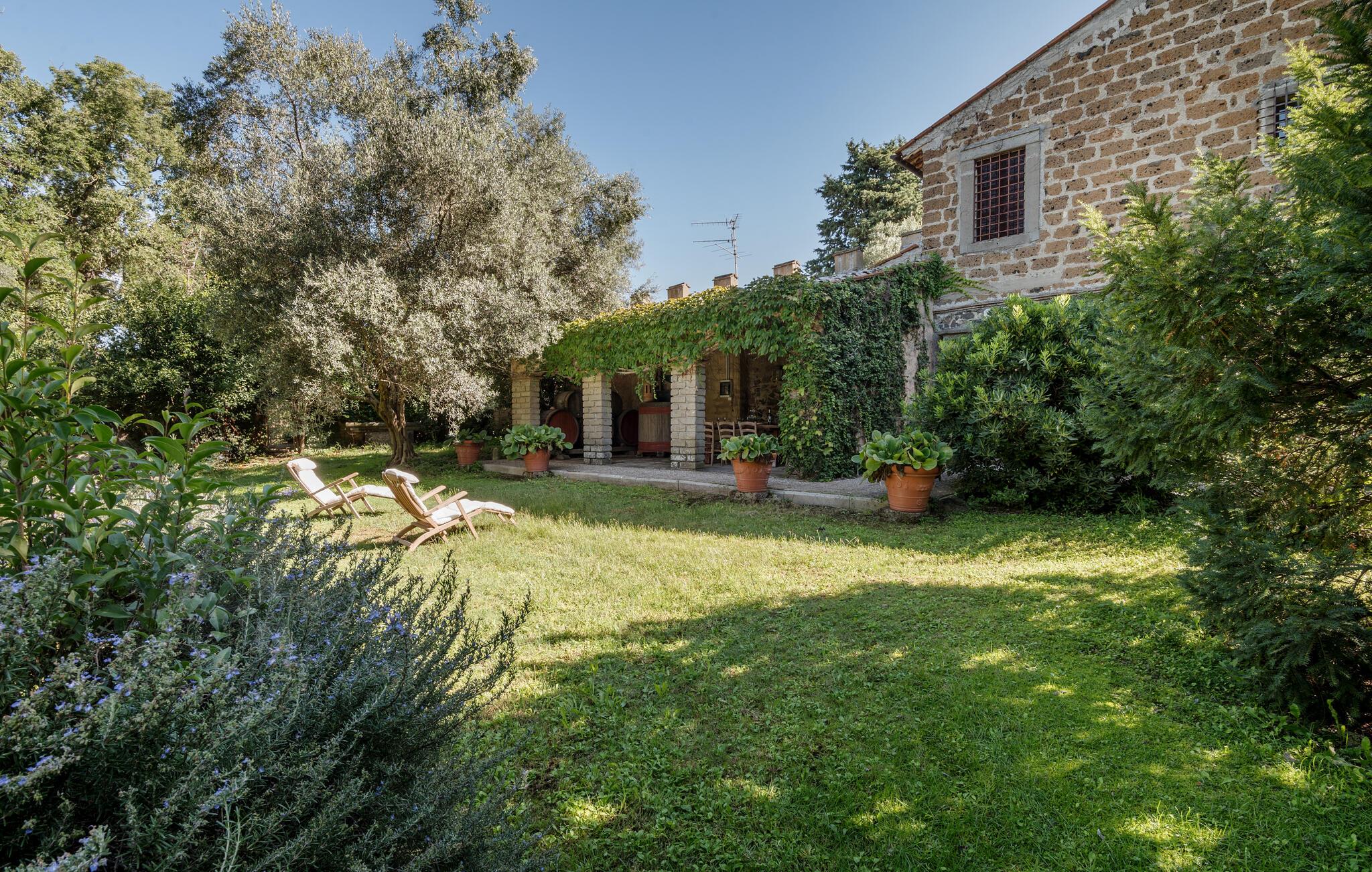 Udforsk den rummelige, grønne grund, hvor I kan slappe af på skyggefulde steder med et glas vin. Den kølige, rustikke terrasse tilbyder et charmerende spiseområde til stemningsfulde aftener i stearinlysets skær.