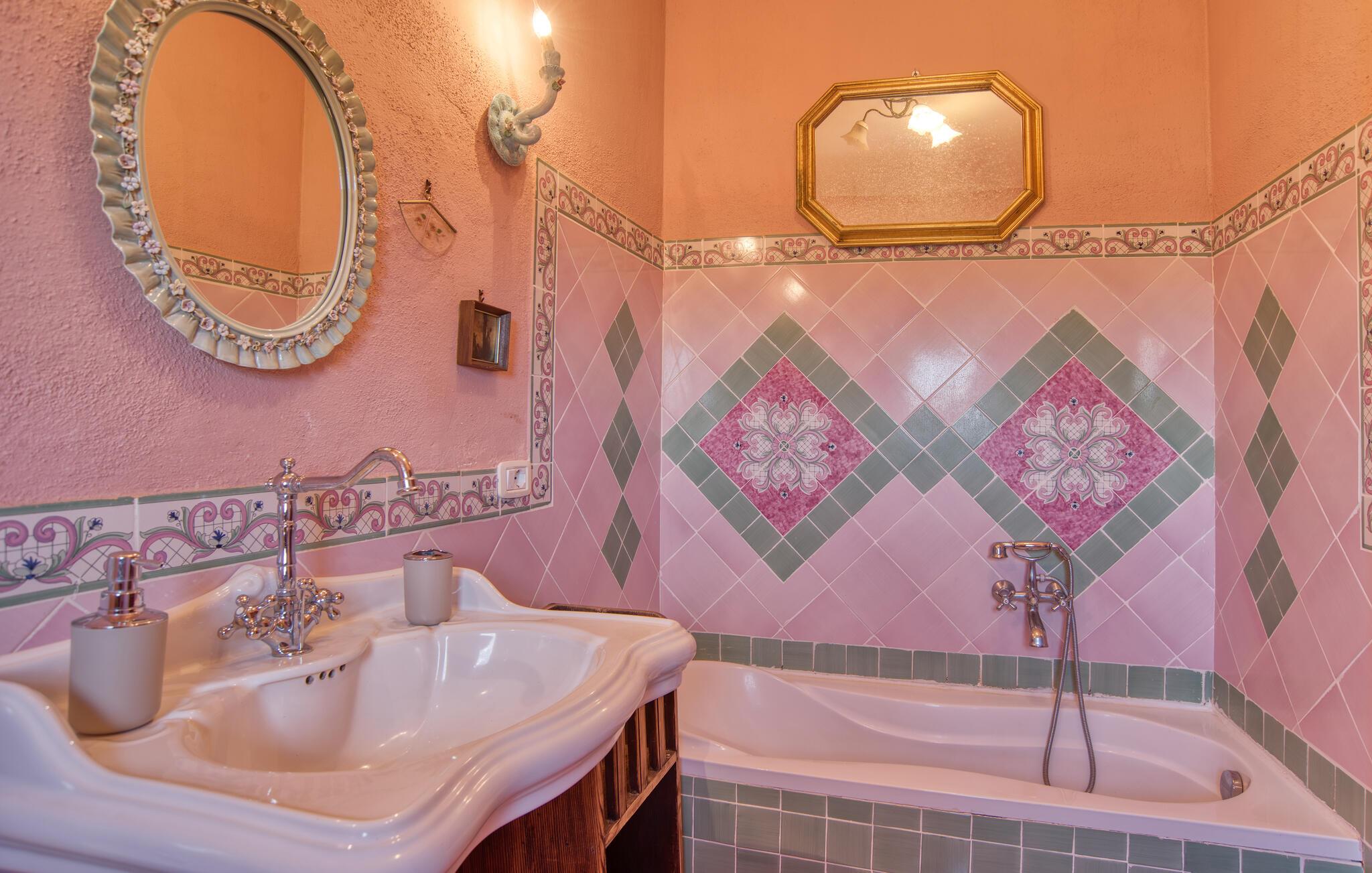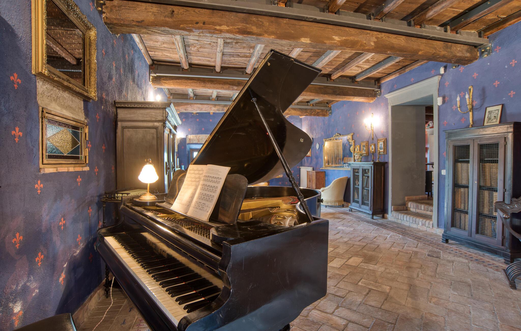 Huset er bygget i slutningen af det 18. årh. og ligger på et forbjerg, hvor I kan se langt ud over die grønne, omkringliggende høj. Meget rolig beliggenhed. Takket være de delvis antikke originale indretningsgenstande præsenterer ejendommen sig som en prægtig landresidens. De storslåede terrasser, der omgiver huset, og svømmebassinet med romersk trappe, vippe og doucher gør ejendommen fuldstændig.