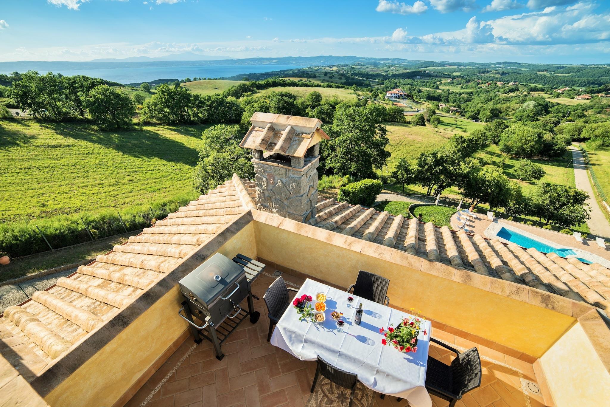 Beliggende på en frodig bjergskråning med en betagende udsigt over Bolsena-søen og det toscansk-umbriske landskab, tilbyder denne fortryllende villa en indbydende oase for store familier, vennegrupper og deres elskede kæledyr. Villaen kombinerer ubesværet rustik elegance med moderne komfort. Dens naturskønne tagterrasse, charmerende verandaer og store have i skyggen af århundreder gamle egetræer gør den til det perfekte sted at slappe af, spise og fejre under åben himmel. Villaen strækker sig over fire rummelige etager og tilbyder en gennemtænkt planløsning med flere fuldt udstyrede køkkener, hyggelige opholds- og spiseområder og 10 veludstyrede soveværelser, hvoraf mange har private balkoner eller terrasser. Flere værelser har eget badeværelse, hvilket sikrer komfort og privatliv. Aircondition, satellit-tv, vaskemaskiner på alle niveauer og et privat wellness-område med sauna og boblebad forbedrer dit ophold. Udendørs kan du nyde en privat swimmingpool, grillplads, liggestole og en stor indhegnet have, et paradis for både børn og kæledyr. Fra bordtennis og bordfodbold til et legeområde med rutsjebaner er der underholdning for enhver smag. Uanset om du planlægger en privat kokkemiddag, en vinsmagningstur eller en bådtur rundt om Bolsenasøen, kan der arrangeres skræddersyede oplevelser for et virkelig fordybende ophold i Toscana og Umbrien. Bemærk: Vand, sengelinned, Wi-Fi, pool/spabad, parkering og legeområder er inkluderet. Elektricitet inkluderer 20 kWh/dag (egenpris: EURO0,50/kWh). Gas er inkluderet juni-september; andre måneder inkluderer 2 m³/dag (egenpris: EURO5,00/m³). 4 espressomaskiner, grill, pejs (1) og brændeovn (efter anmodning) er inkluderet.