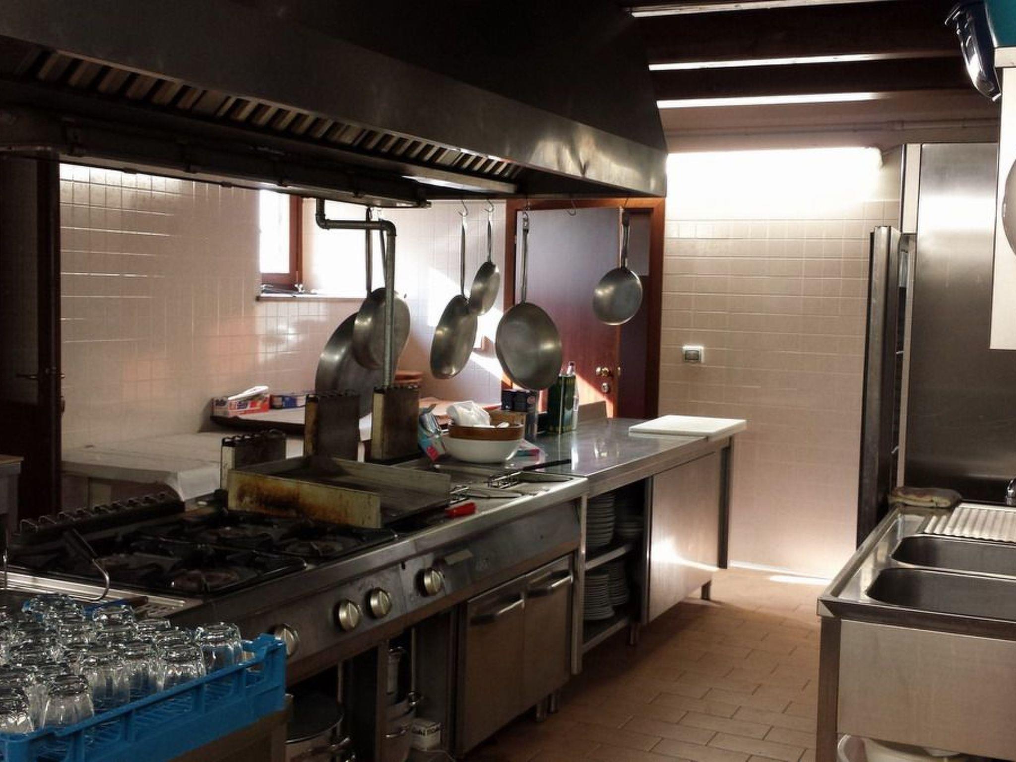 Full equipped professional kitchen with 4 stoves, oven, dishwasher, fridge, microwave, slicer, kettle and toaster
