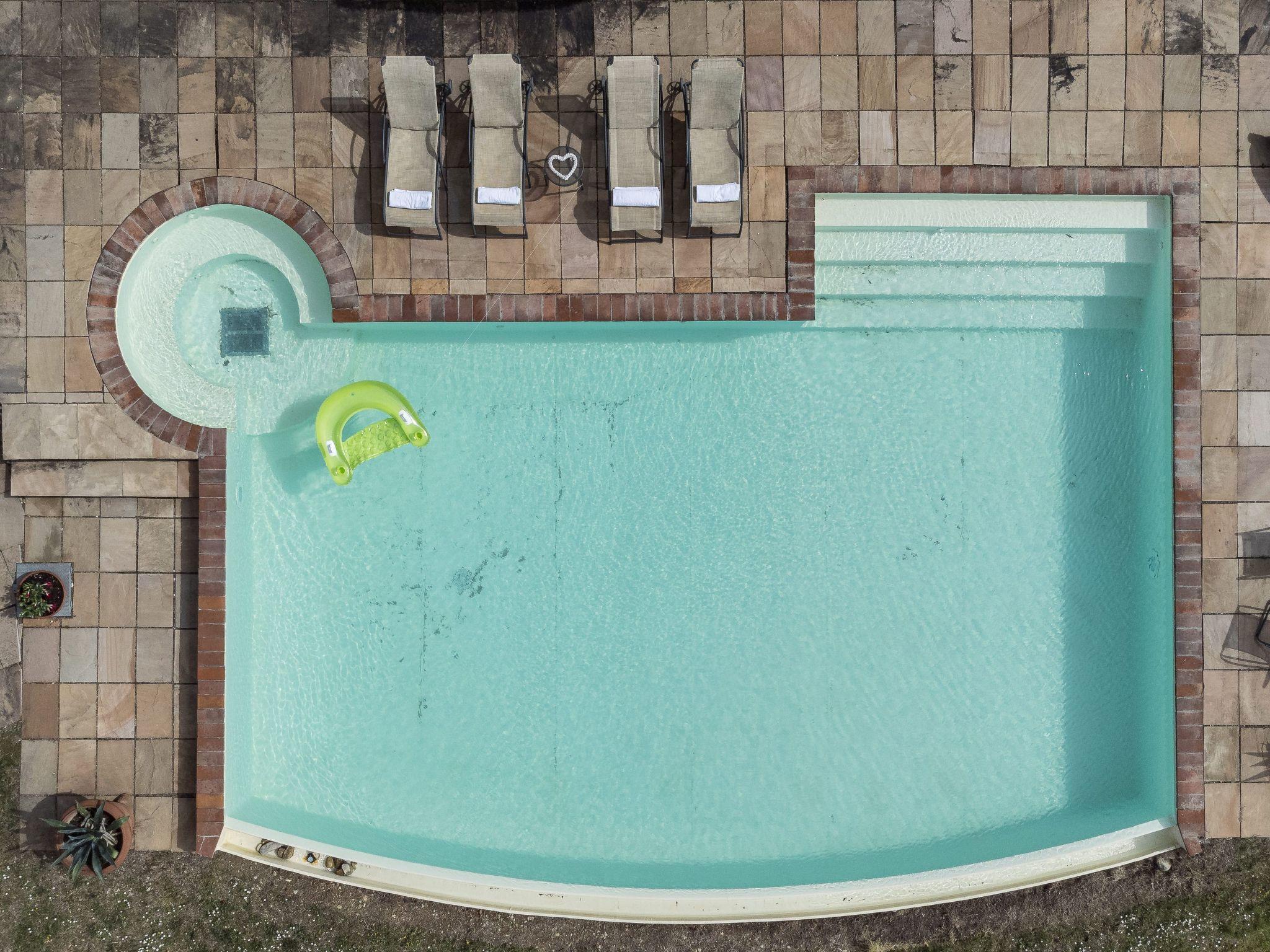Outside there is a large and bright veranda furnished with table, chairs and deckchairs, where it is possible to sunbathe quietly, have wonderful al fresco breakfasts or romantic dinners, and where our guests can relax whenever they wish, enjoying a suggestive view in complete peace. The beautiful swimming pool (10.5 x 7.5 m) with salt water system and whirlpool area, equipped with sun loungers, table and chairs, is surrounded by lawn and framed by rolling hills, an ideal place to relax and take a refreshing dip. It was built near the olive grove, far from any noise that might disturb the tranquillity of those who prefer to enjoy the quiet of the Tuscan countryside. Use of the pool is reserved for guests and the owners who live in the house next door. The property is also equipped with heating, a mains socket for internet connection, washing machine, iron and ironing board, barbecue, kettle, moka and American coffee machine, safe, alarm system, ceiling fans, first-aid kit, hair dryer, torch, automatic gate, free covered parking and a spacious, independent garden. The house is located in a particularly charming part of Chianti, above the Arno valley and about 230 metres above sea level. The most famous Tuscan cities are all within easy reach: only 20 minutes from Florence, 10 minutes from Vinci and San Miniato, 30 minutes from Pisa, 50 minutes from Siena, Volterra, Monteriggioni and San Gimignano. The structure follows the formula of the 5 basic ingredients: Personality, Courtesy, Tranquillity, Charm, Satisfaction of our guests.