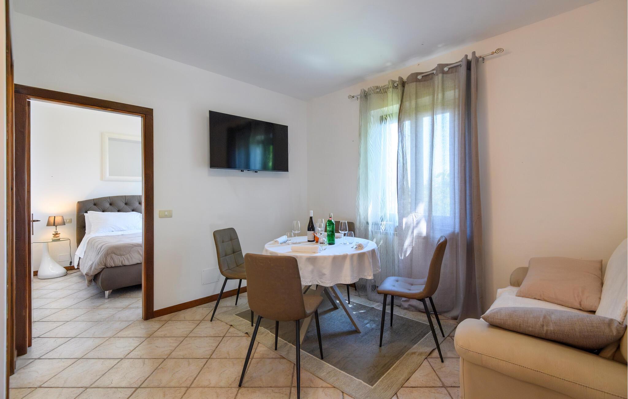 Denne ferielejlighed tilbyder de optimale rammer for en afslappende ferie i landlige omgivelser. I bor i et naturstenshus med fælles pool og sauna. Gå ind i den lyse opholdsstue med sofa, tv og spisebord. Nyd jeres måltider her eller slap af med en film efter en udflugt. Tilbered enkle måltider i det lille tekøkken.