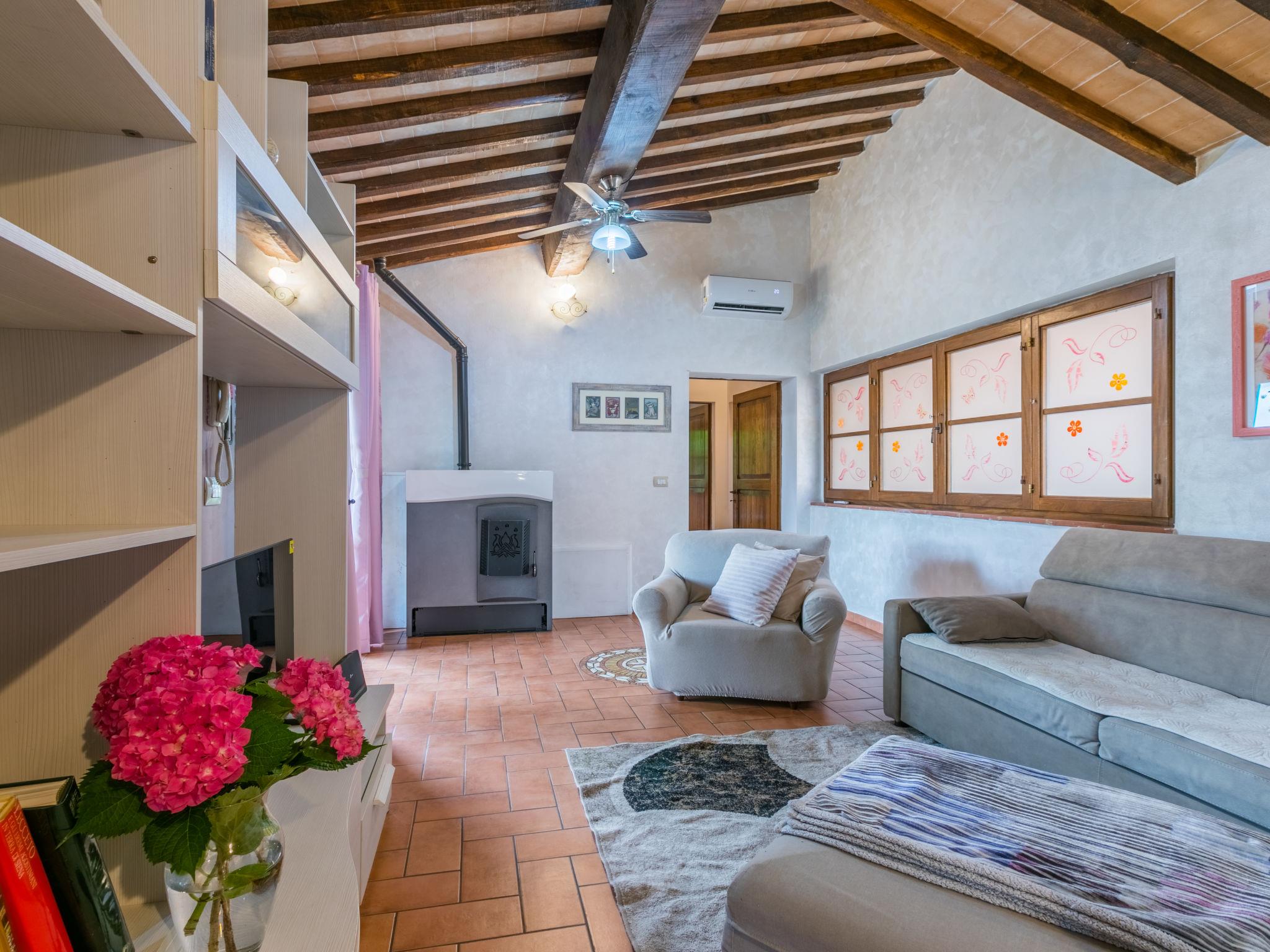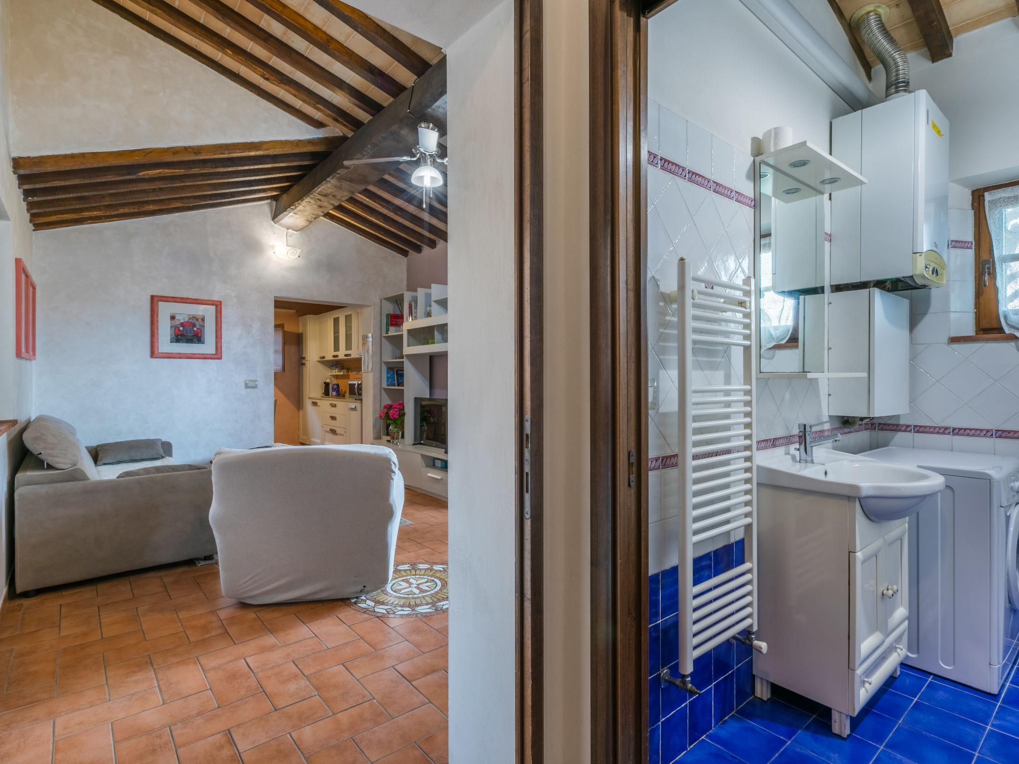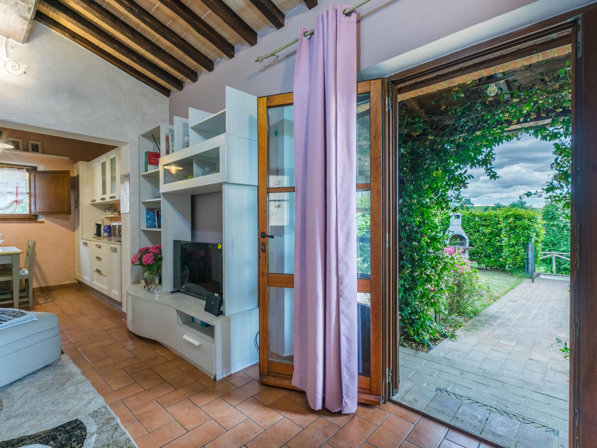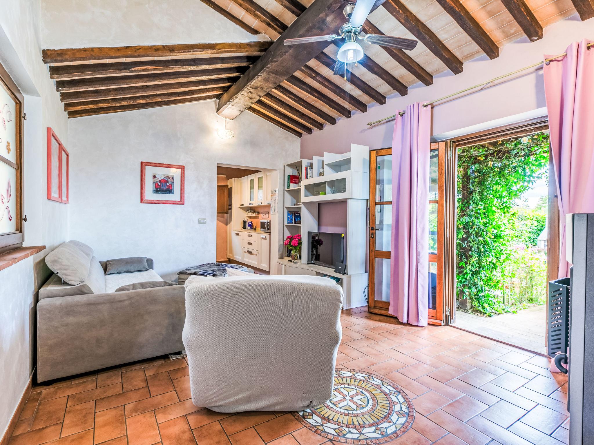 "Caggiolo", 3-room terraced house 70 m2, on the ground floor. Object suitable for 2 adults + 2 children. Bright, comfortable and tasteful furnishings: open living room with TV (flat screen), air conditioning. 1 double bedroom. Exit to the garden. 1 children's room with 2 beds (80 cm). Small walk-through room 2 m2 with air conditioning. Kitchen (oven, dishwasher, Gas stove, 4 gas rings, toaster, kettle, microwave, electric coffee machine) with dining table. 2 showers/bidet/WC. Heating, air-conditioning. Natural stone floors. Terrace roofed, patio, garden. Terrace furniture, barbecue, covered balcony. Beautiful panoramic view of the countryside. Facilities: washing machine, iron, mosquito net, children's high chair, baby cot for up to 2 year olds, hair dryer. Internet (WiFi, free). Parking at the house. Please note: suitable for families. Non-smokers only. Maximum 1 pet/ dog allowed. Private entrance, smoke alarm, fire extinguisher. IT052017C2AV8OFJ9J