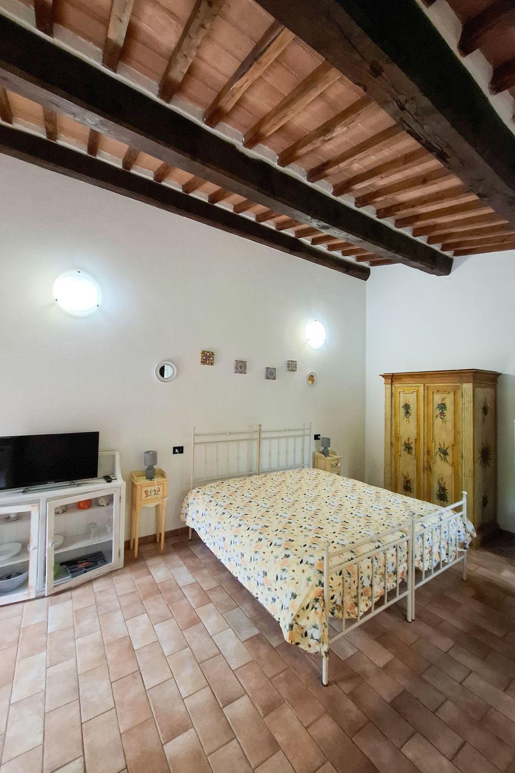 Guests have access to a shared swimming pool, perfect for cooling off on hot days or relaxing under the Tuscan sun. The shared garden invites for quiet moments outdoors, perhaps reading a book or enjoying a coffee prepared with the coffee maker available in the flat. The environment is ideal for those who wish to bring their pets with them, as they are allowed in this enchanting space.