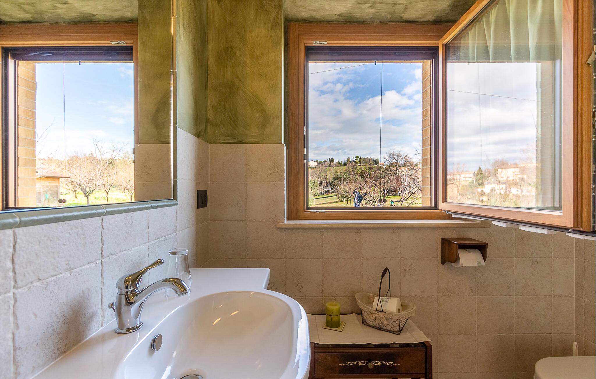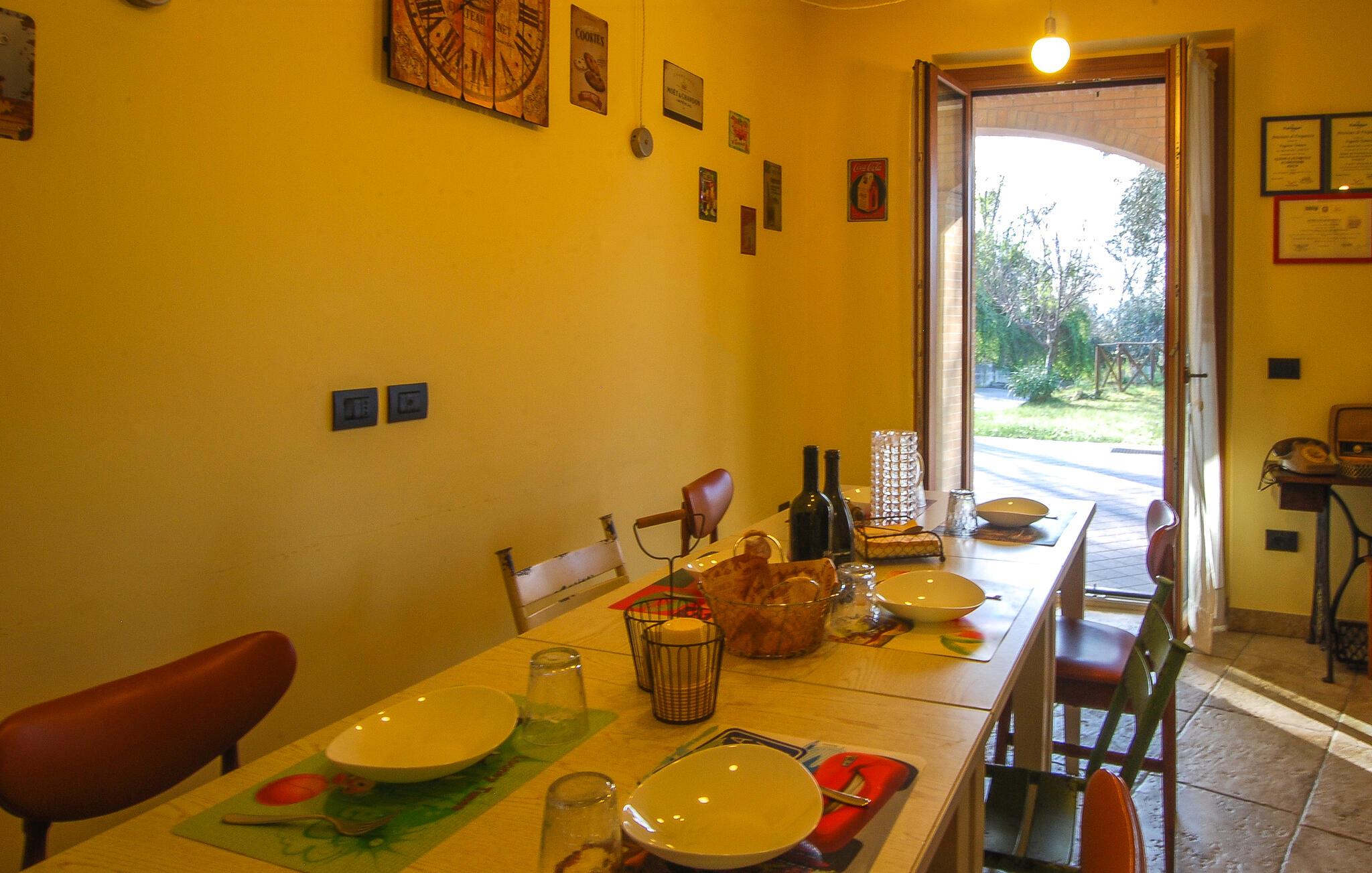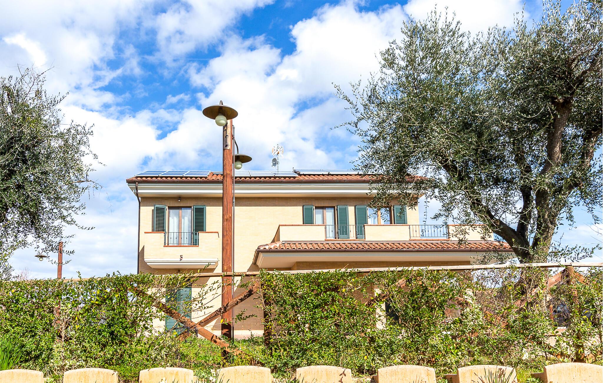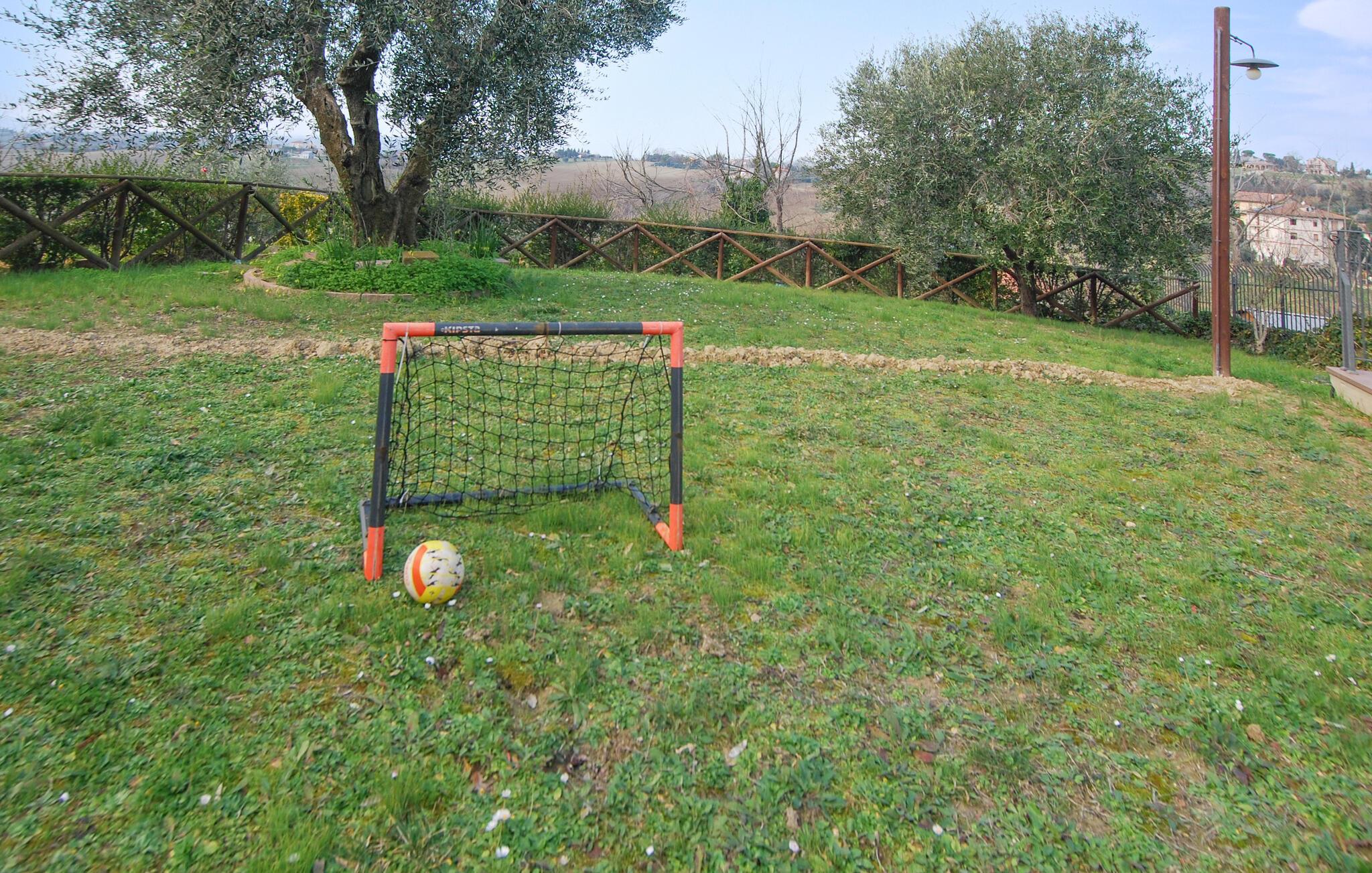 Fra verandaen og altanerne kan I nyde en betagende panoramaudsigt over regionens bløde bakker. Gamle oliventræer og velplejede haveområder indbyder til afslapning. Start jeres dag med en kop kaffe i det grønne, eller udforsk de idylliske omgivelser til fods. Husets hævede beliggenhed sikrer ren afslapning, mens nærheden til charmerende landsbyer og byer giver variation.
