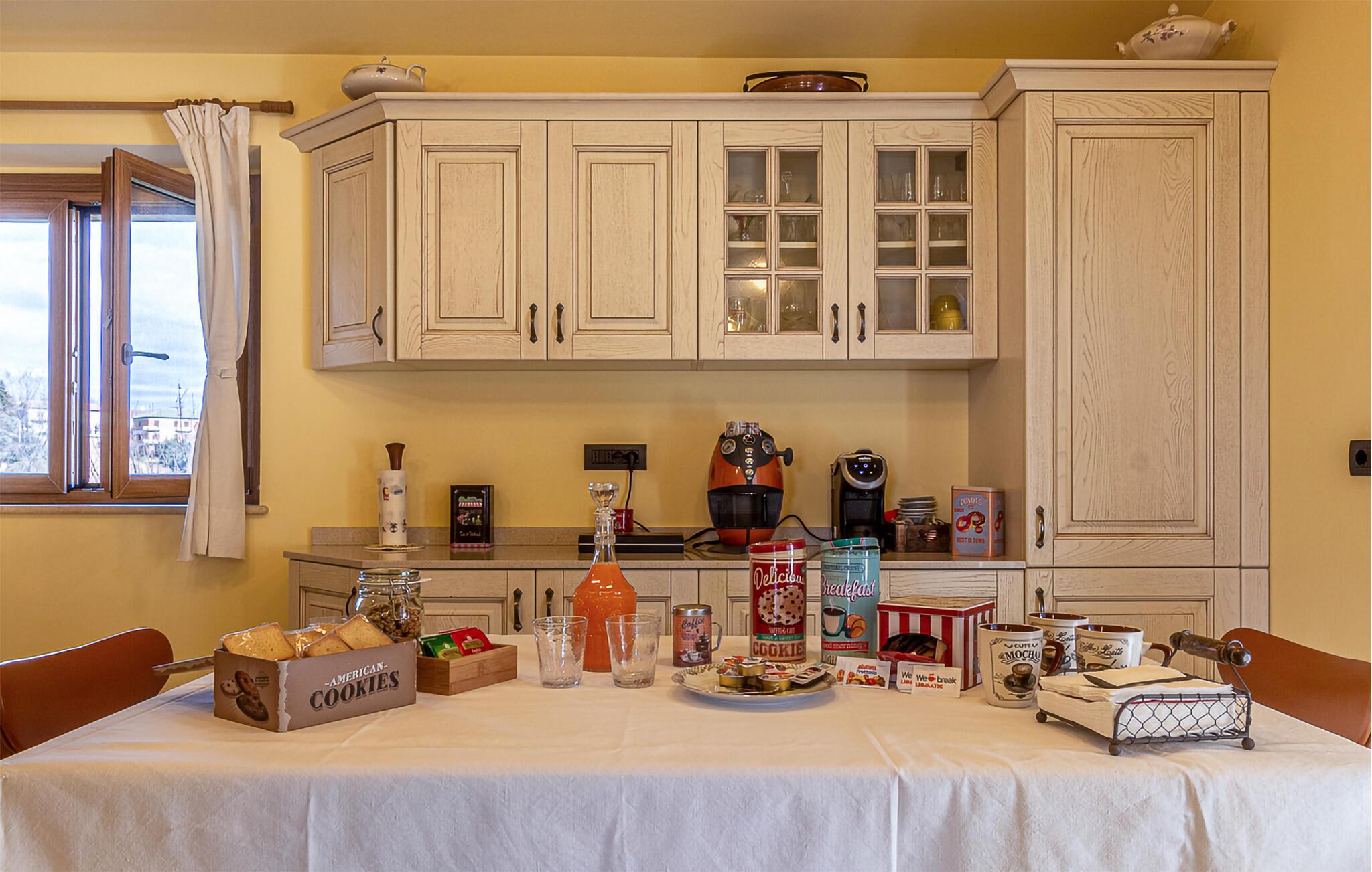 Dette charmerende feriehus byder på en varm og indbydende atmosfære. Indendørs imponerer huset med et venligt og solrigt farvetema samt kærligt udformede detaljer. Udnyt det rummelige køkken til at tilberede lækre måltider sammen med familien, og planlæg den næste dags eventyr i den åbne spisestue.