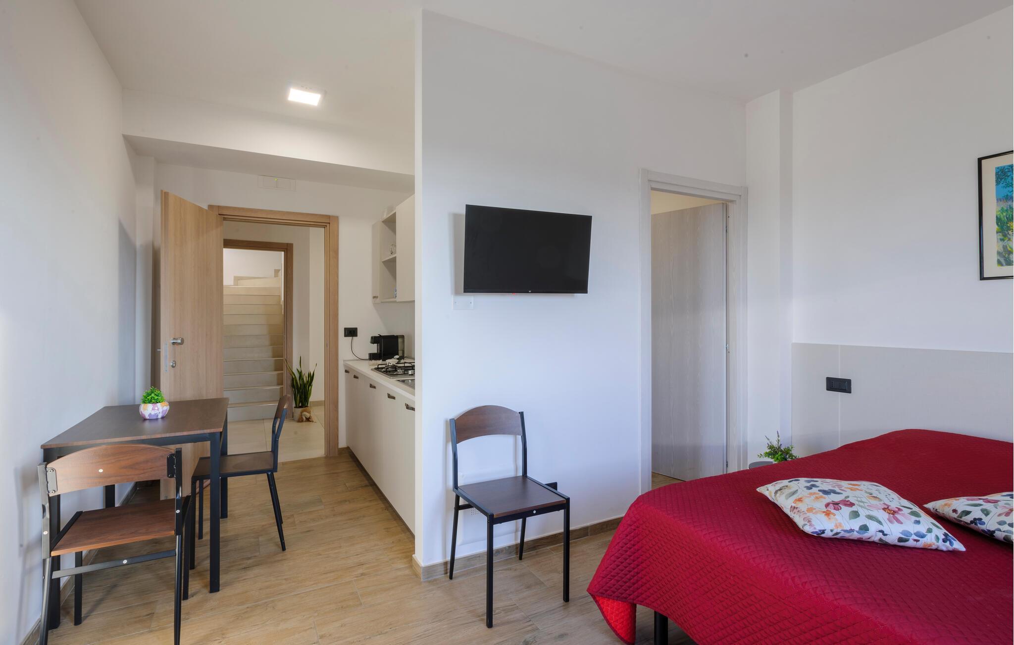 Velkommen til denne dejlige lejlighed, der ligger i en bygning med flere ferieboliger, smukt omgivet af oliventræerne, og med en skøn udsigt over landskabet. Hvis I gerne vil rejse som en større flok, kan I booke flere lejligheder i huset og nyde et ophold med det helt rette mix af sociale stunder og privatlivets fred. Lejligheden er flot indrettet med lyse farveskalaer, moderne komfort og et veludstyret køkken, hvor I kan tilberede en lækker morgenmad, som kan nydes på terrassen med en god kop kaffe og udsigt over landskabet i Pescaras bagland.