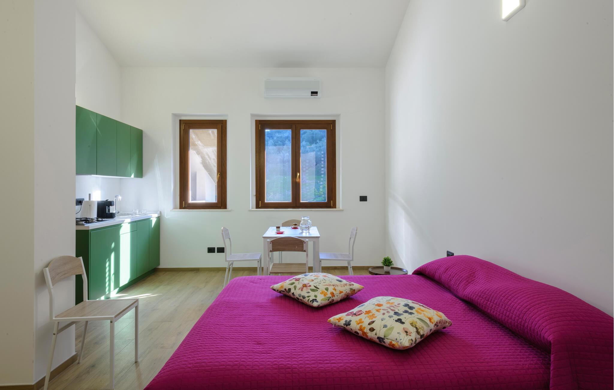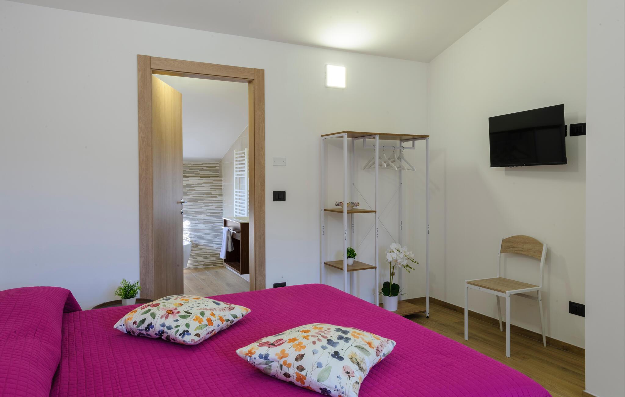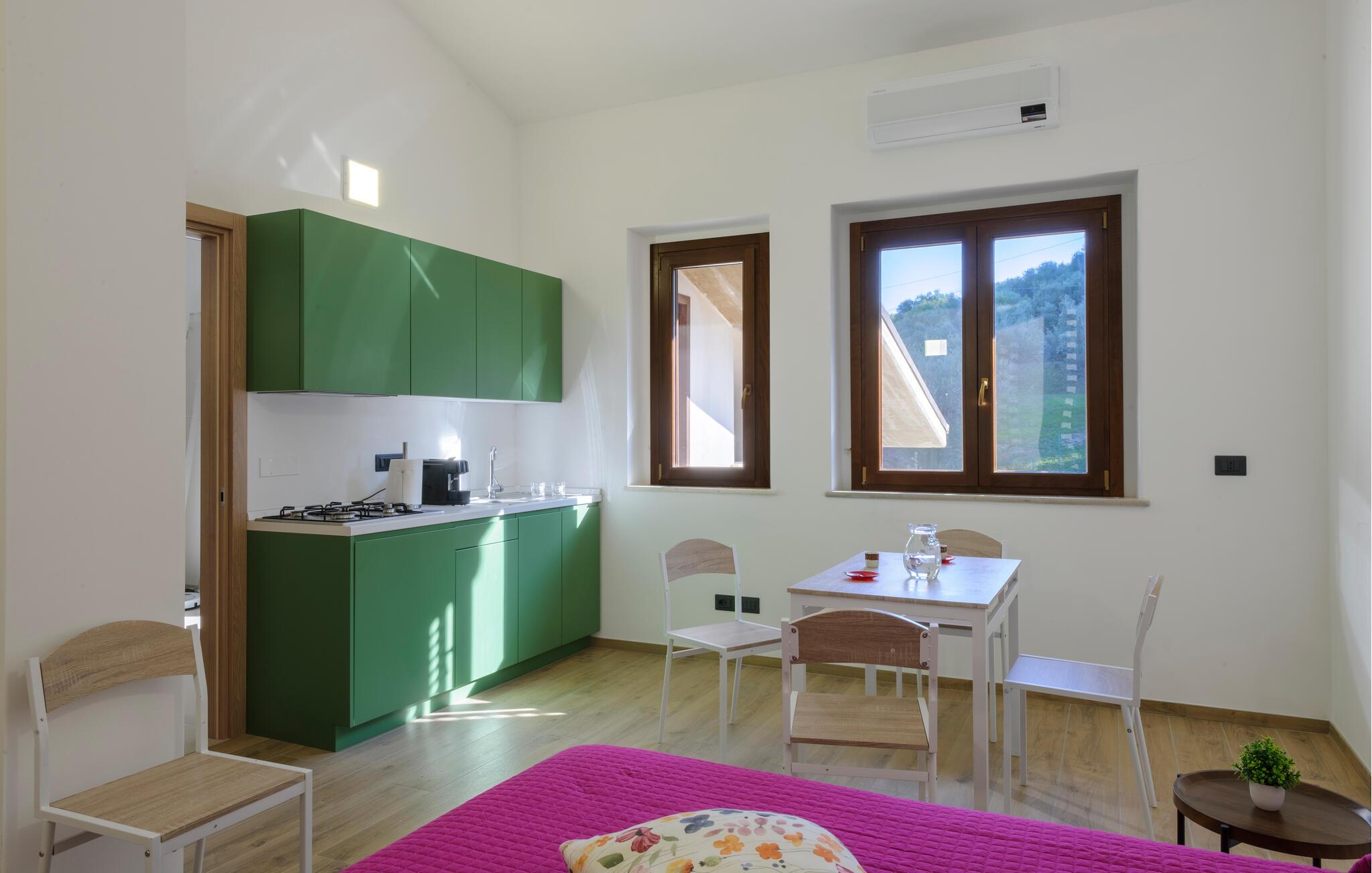 Velkommen til denne dejlige lejlighed, der ligger i en bygning med flere ferieboliger, smukt omgivet af oliventræerne, og med en skøn udsigt over landskabet. Hvis I gerne vil rejse som en større flok, kan I booke flere lejligheder i huset og nyde et ophold med det helt rette mix af sociale stunder og privatlivets fred. Lejligheden er flot indrettet med lyse farveskalaer, moderne komfort og et veludstyret køkken, hvor I kan tilberede en lækker morgenmad, som kan nydes på terrassen med en god kop kaffe og udsigt over landskabet i Pescaras bagland.