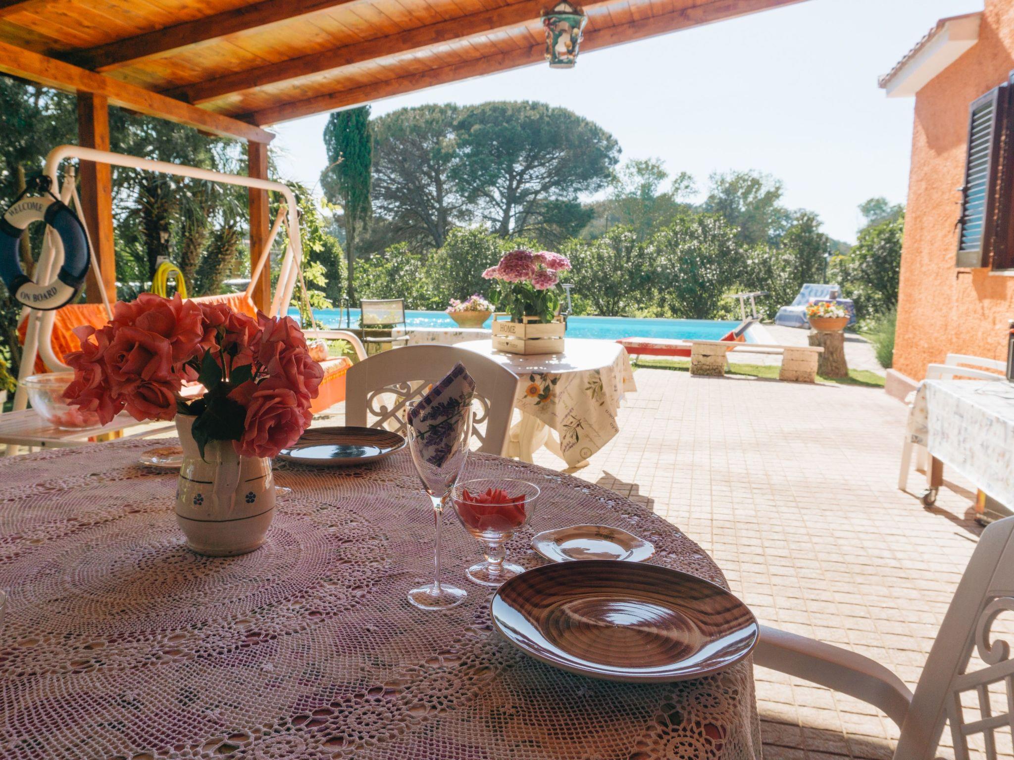 The outside of the cottage is a true paradise for those who enjoy spending time outdoors. The veranda, which is always breezy, is equipped with a rocking chair, sun loungers, and a table and chairs for enjoying moments of relaxation or meals outdoors. The outdoor shower with hot water is ideal for cooling off after a day spent by the pool, where there are also comfortable armchairs. The large garden offers plenty of space to relax and enjoy the peaceful surroundings. Please note that, out of respect for the animals present (a dog and some cats), no other pets are allowed.