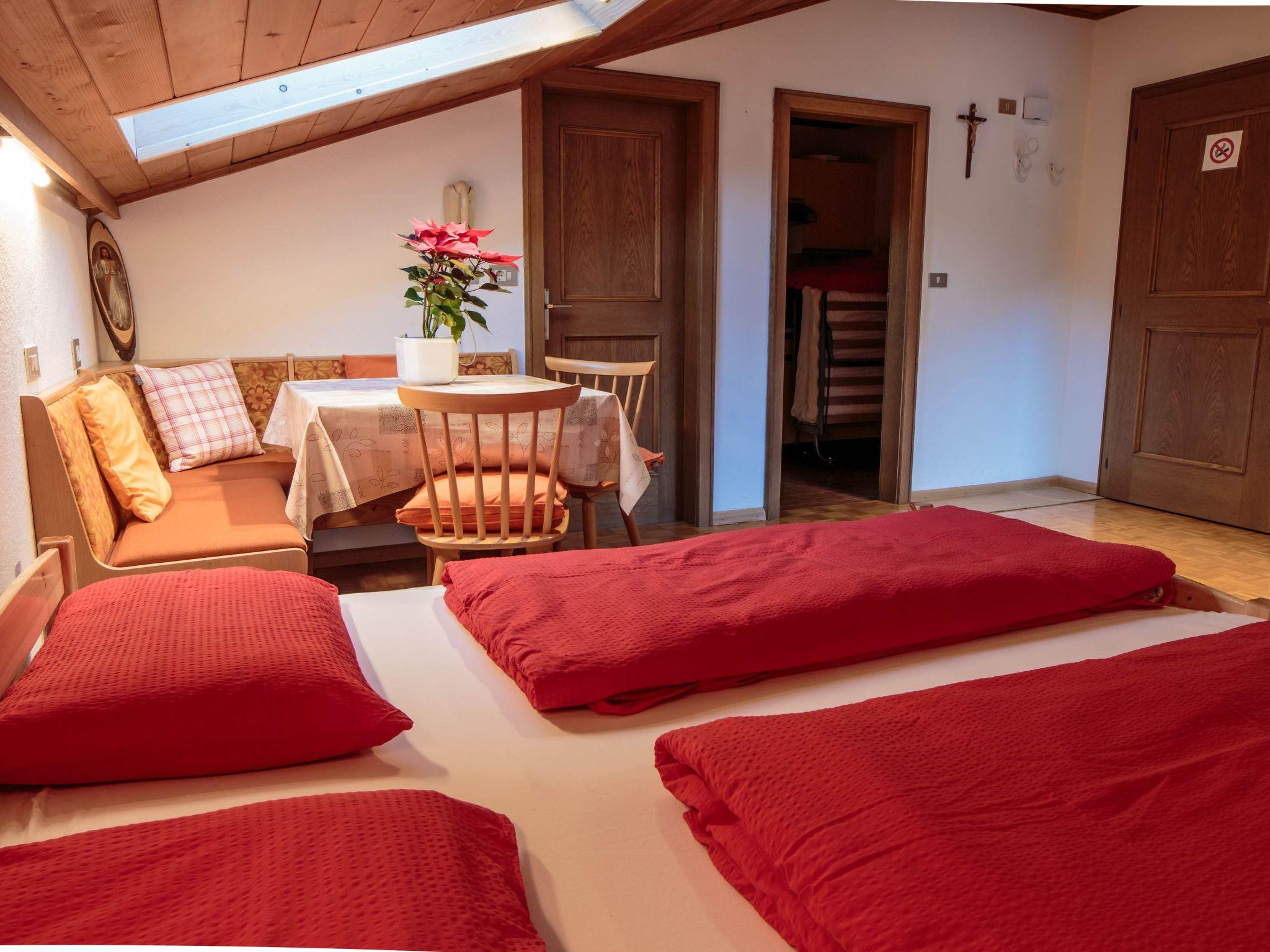The mansard has an area of about 30 m² and is suitable for a maximum of two people. It is built with natural materials, such as wood, and is free of electrosmog at night to allow guests to enjoy a relaxing rest. The bedroom and living room have a double bed. The dining area consists of a corner bench and a table. The room leads to the kitchenette, in which there is a fully equipped kitchen. This is equipped with a gas hob, coffee machine, kettle and refrigerator, as well as crockery and cooking utensils. Next to it is the bathroom with shower, bidet, washbasin and hairdryer. The flat is ideal for a holiday in the mountains in both summer and winter. It can be heated and, due to its elevated location in the mountains, does not require air conditioning even in the summer months. The flat is also equipped with bed linen, towels and WLAN internet access. A cot for small children is available on request. East-facing balcony with panoramic view.