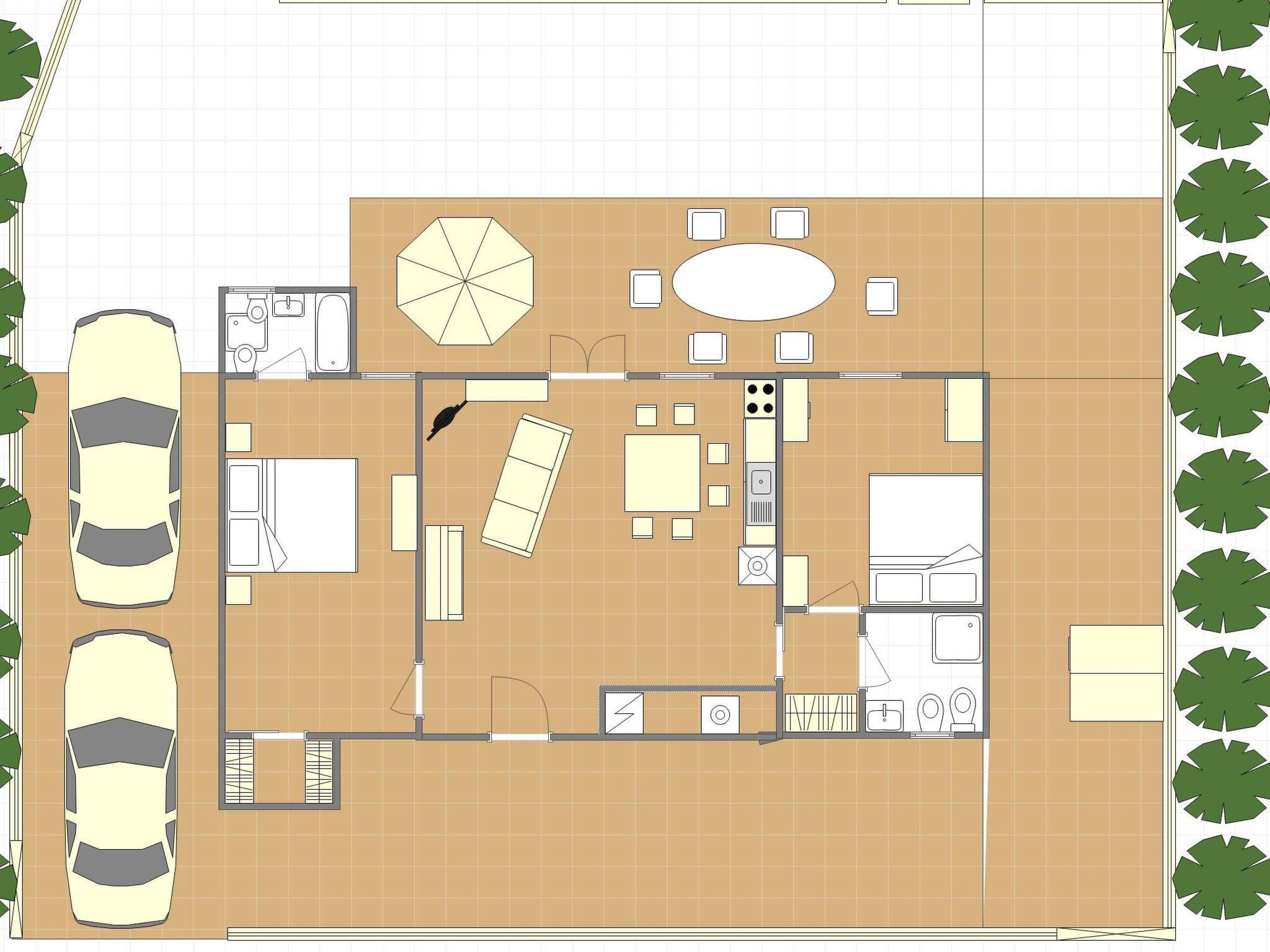 Comprising a large living room, kitchen and two bedrooms each with its own bathroom, the house can accommodate up to seven people. A double sofa bed is available in the living room, and an additional bed can be added.