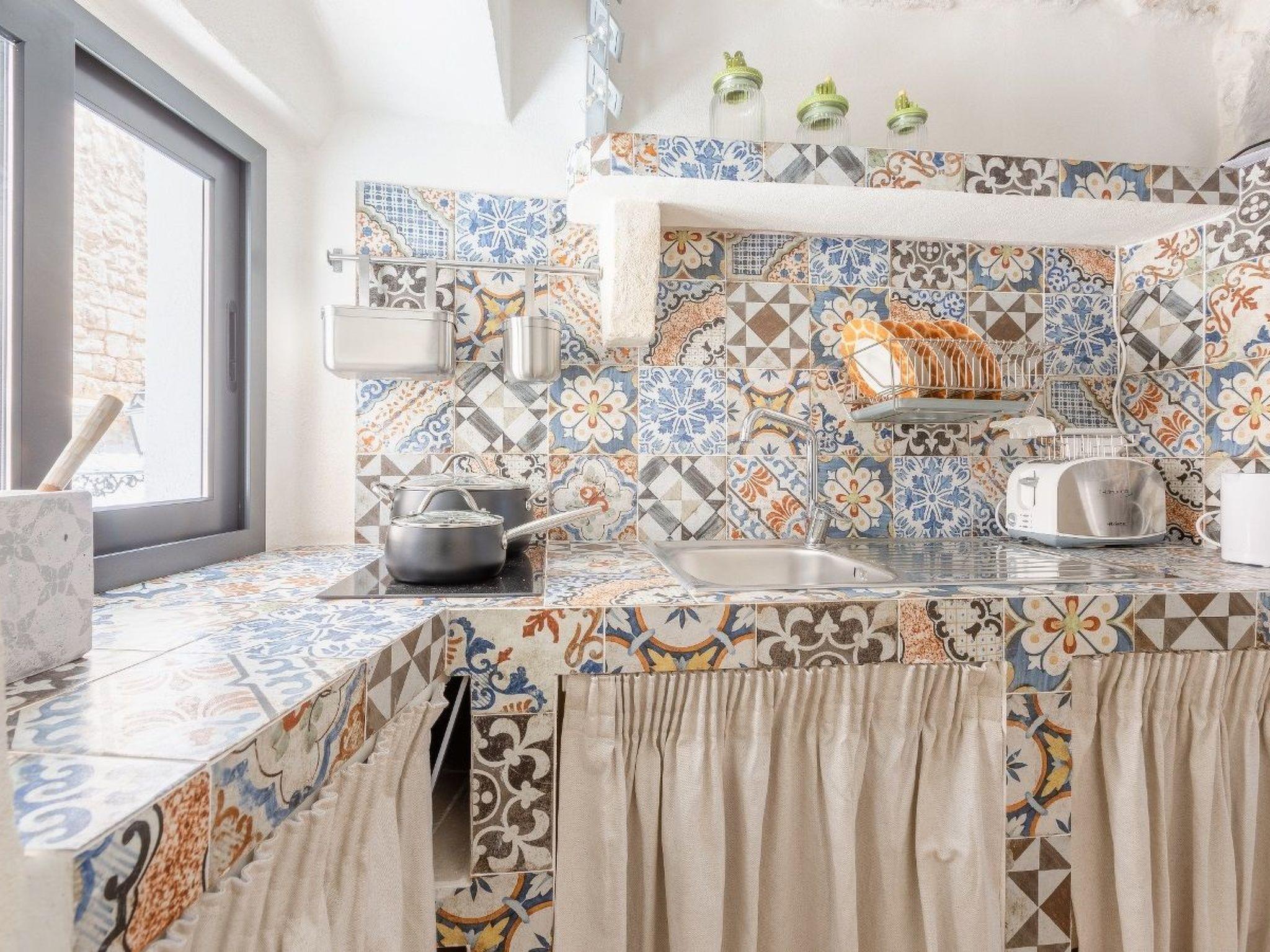 It is on two levels. On the first floor the flat comprises a double bed in a niche, a double sofa bed with mattress, a dining table, a fully equipped kitchen, a bathroom with shower and a veranda balcony with a view of the White City. From the kitchen, a staircase leads to the terrace. The terrace offers a sea view, a view of the olive park and a view of the city.