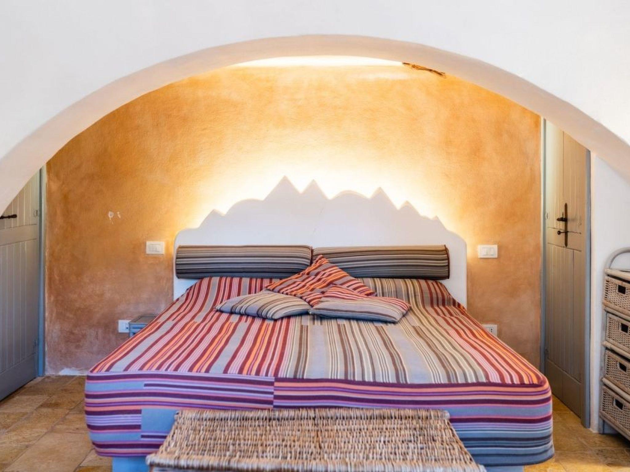 The lovingly restored trulli, two in number, are furnished as a private villa for exclusive rental for up to 14 people. Situated on a slight hill in the typical natural landscape of the Itria Valley, it is the ideal place to enjoy the peace and quiet, the flavours of this fascinating region and the simple elegance of the trulli rooms. A highlight is the outdoor swimming pool set in hollowed-out rocks. The outdoor area also features tasteful garden furniture made of local stone, which has been transformed into particularly beautiful outdoor lounges. This large holiday villa offers every comfort such as air conditioning, Internet WIFI, TV-DVD player, a private barbecue, weekly cleaning and a wonderful panoramic view of the coast and the Itria Valley.