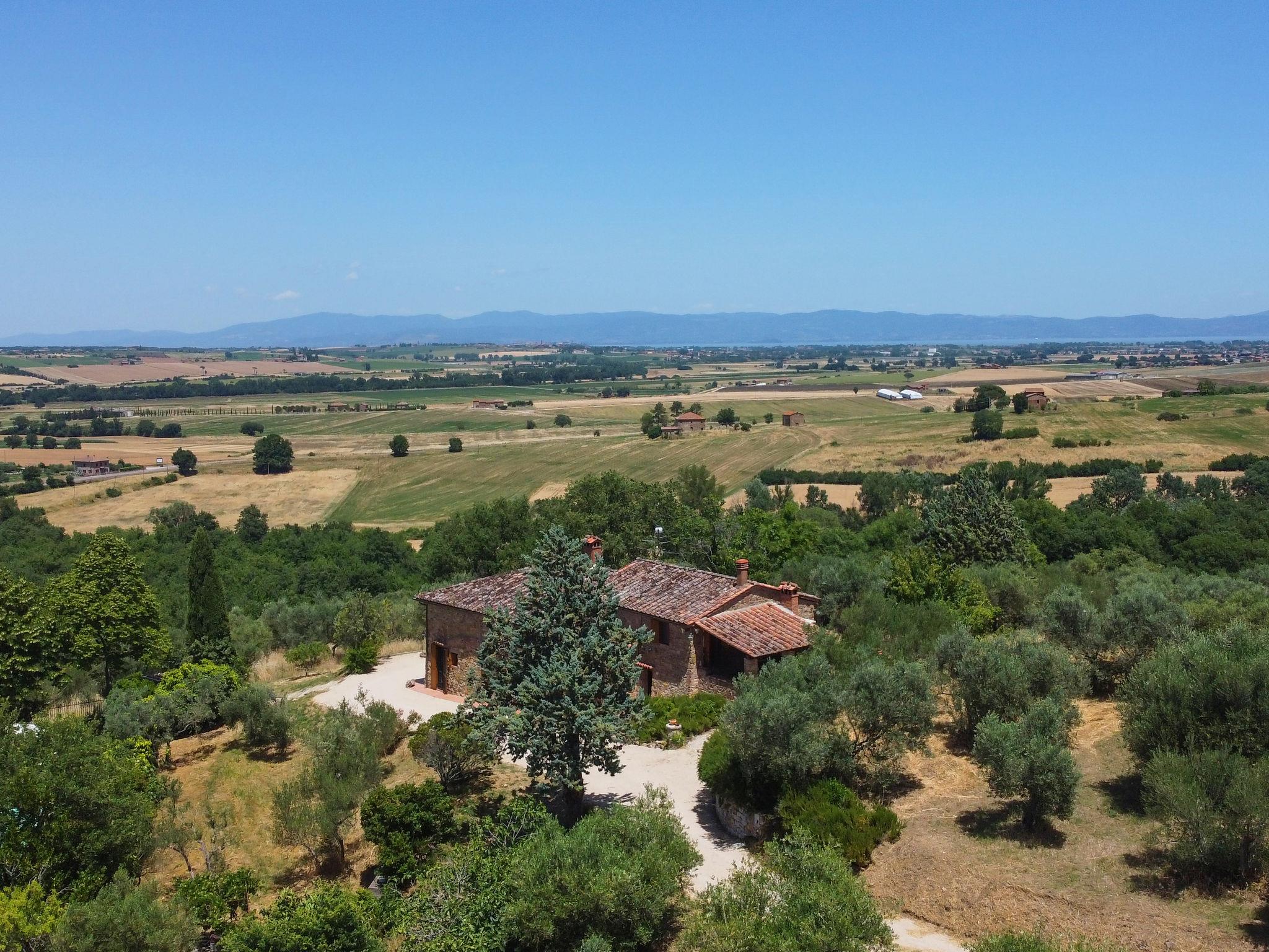 Located between Tuscany and Umbria, makes easily reachable many places of historical and cultural interest . Rustic, comfortable country house "Pietreto", 390 m a.s.l., detached, built in 1700, renovated, surrounded by trees and fields. 3 km from the centre of Paciano, in a secluded position, 14 km from the lake. Private: garden 5'000 m2, swimming pool fenced (4 x 8 m, depth 140 cm, seasonal availability: 01.May. - 13.Oct.). Outdoor shower, garden furniture, fireplace, pool maintenance by the owner/gardener. Bumpy motor access (700 m via unmade road). Parking on the premises. E-charging station. Grocery 3 km, supermarket 3 km, restaurant 3 km, bar 3 km, railway station "Chiusi" 13 km, bathing lake "Trasimeno" 14 km. Nearby attractions: Città Della Pieve 14 km, Chiusi 14 km, Castiglione Del Lago 17 m, Cortona 35 km, Passignano Sul Trasimeno 36 km, Pienza 45 km. Please note: car recommended. The owner does not accept any youth groups.