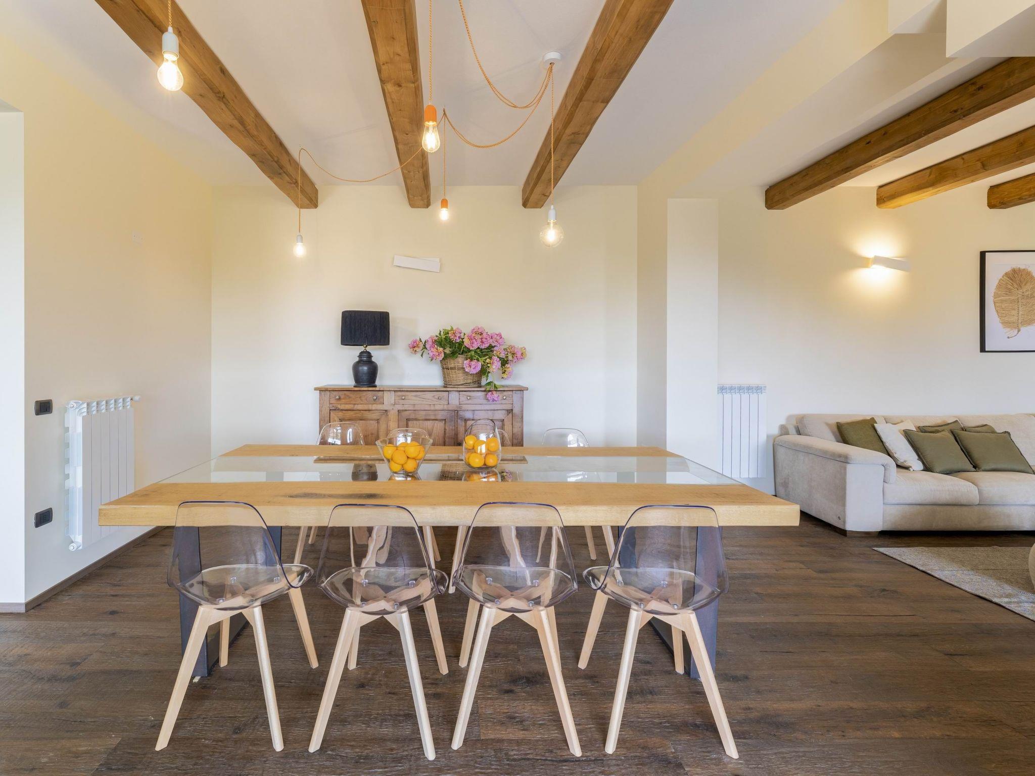 The other large veranda on the basement floor, which can be opened electronically, leads to one of the entrances to the house, where there is a large living room with a living area (fireplace, Smart TV), worktop, dining area with a table seating 10 and a large kitchenette (induction hob, oven, fridge with freezer, dishwasher, microwave, toaster, moka). A staircase leads to the upper floor where there is a hallway and a bedroom with a double bed (bed 160 x 200 cm) and private bathroom with shower, as well as access to the covered terrace with barbecue, wood-burning oven and another covered terrace with panoramic views.