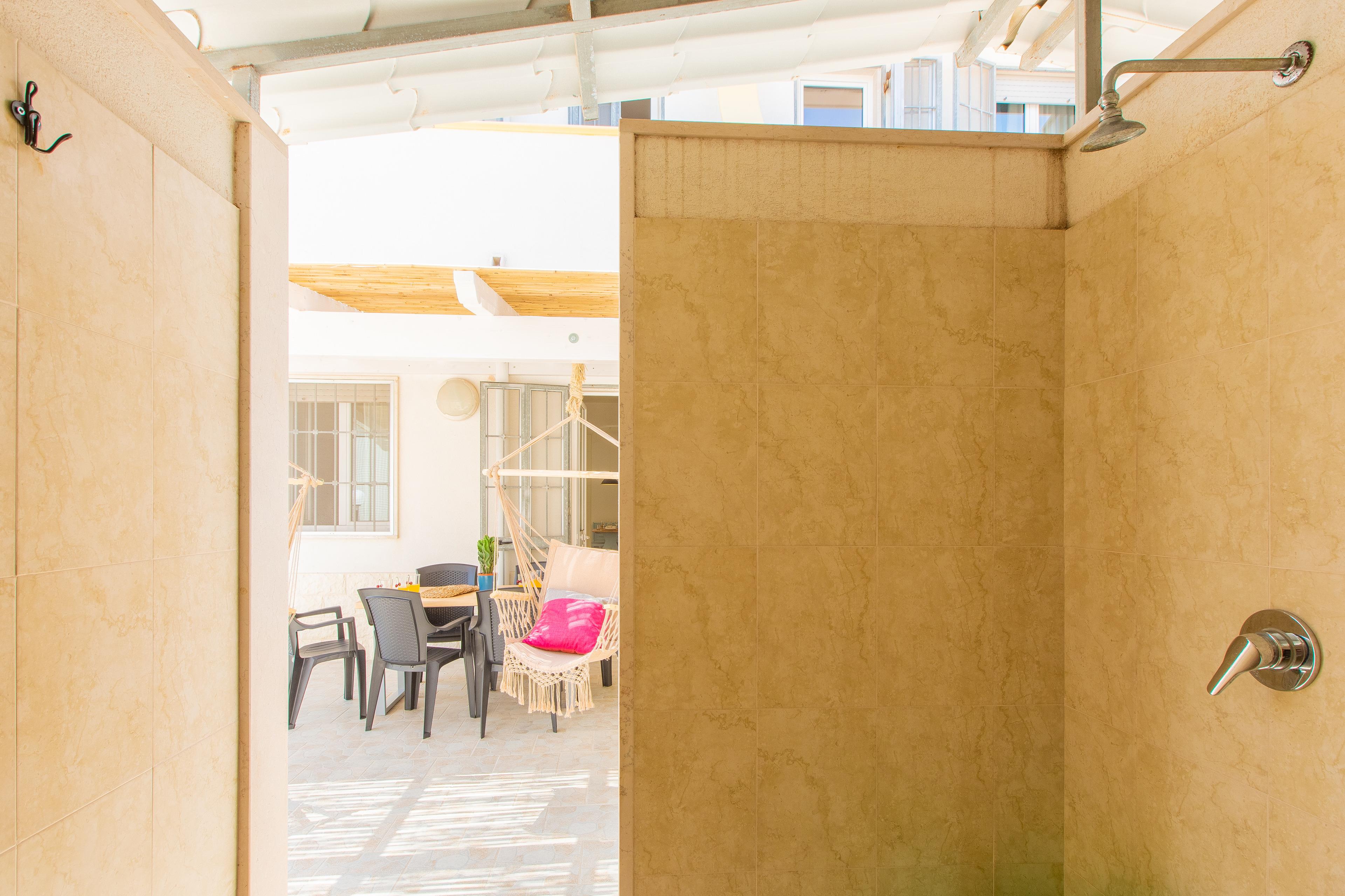 Aussen: Zwei Veranden mit Gartenmöbeln und zwei Strandliegen, Dusche nach Strand und Waschtisch.