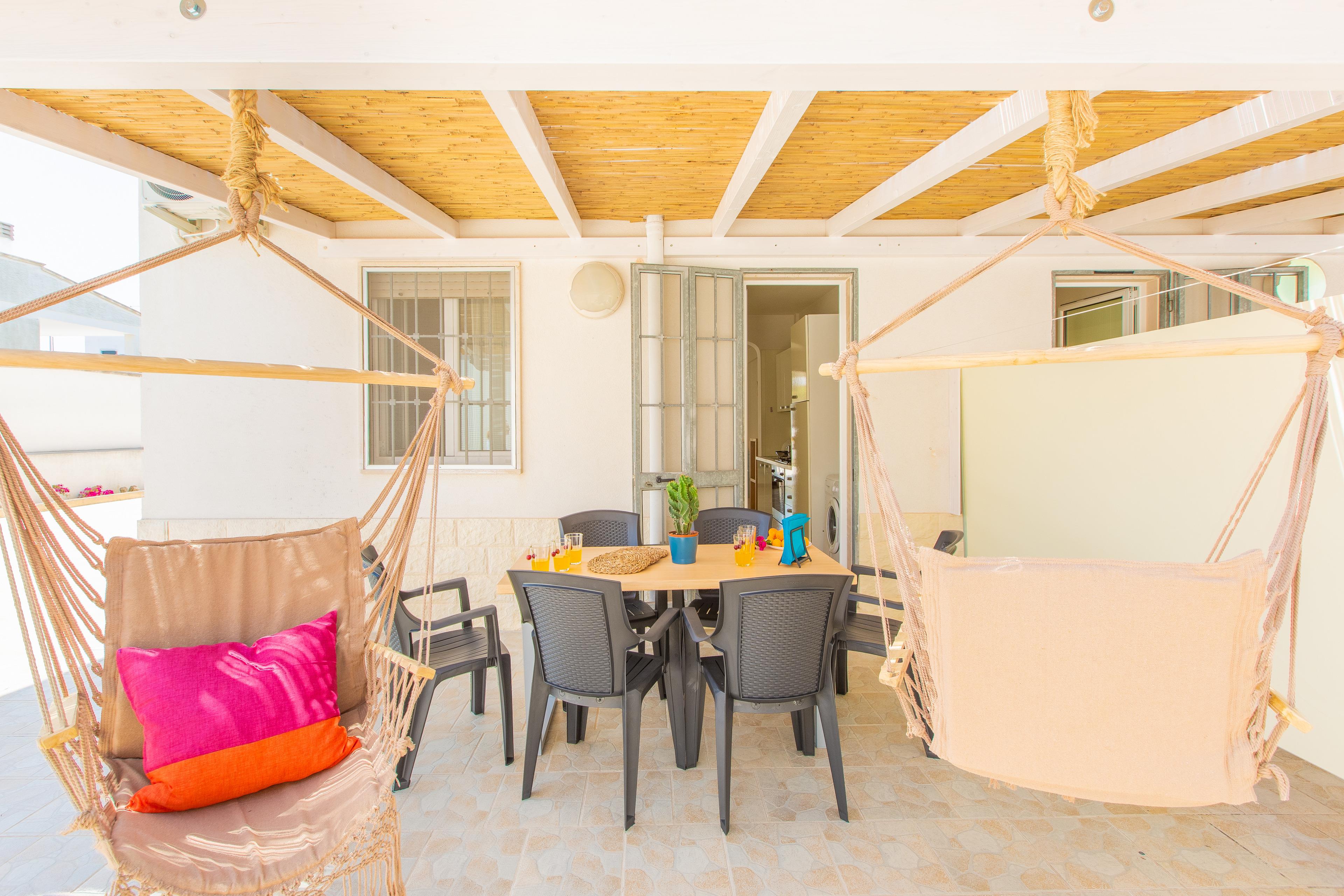 Sie haben viele Möglichkeiten im Freien, zwei Veranden auf zwei Seiten des Hauses, Strandliegen und zwei Hängematten;