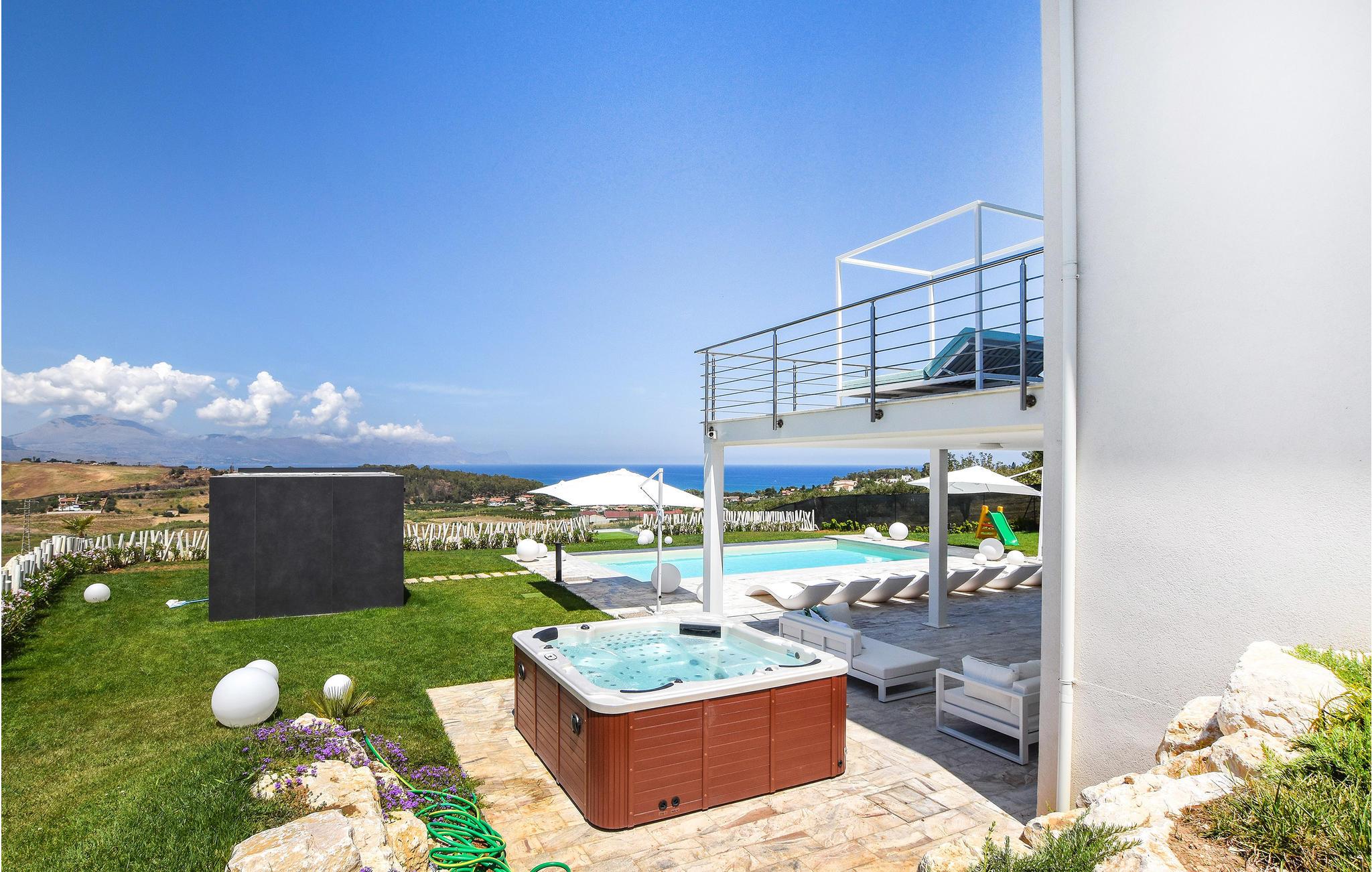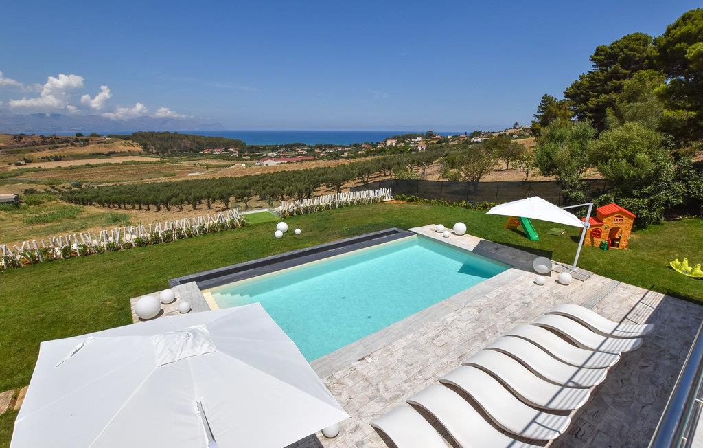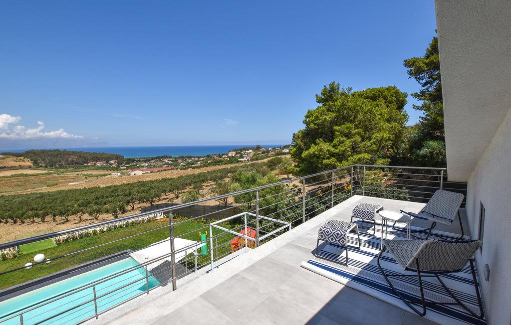 Beliggende kun 1000 meter fra sandstranden mellem Balestrate og Alcamo, på en lille bakke, hvorfra I kan nyde en storslået udsigt over havet og de omkringliggende bakker. Foruden swimmingpoolen finder gæsterne et udendørs spabad og store terrasser med sofaer og borde. Den store, veludstyrede have med græsplæne tilbyder også et udendørs køkken og en grill.